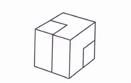 Q 1.1: The drawing below shows a cube made of two identical pieces. Draw one of these pieces in 3 dimensions.