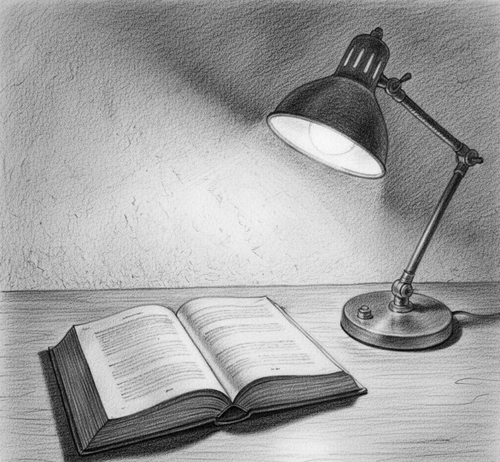 Quick Tip: To add more visual depth and convey a stronger sense of late-night atmosphere, slightly deepen the darkest shadow areas (like the interior of the lamp shade and the shadow cast by the book's spine). Then, use a soft eraser or white pencil to slightly brighten the white page edges and the immediate highlight where the light strikes the desk, increasing the contrast between light and shadow (chiaroscuro).