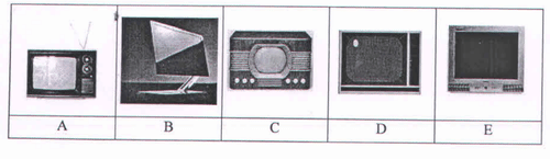 5. C(Past) Quick Tip: B (Present): Modern flat-screen television. E: Older CRT (Cathode Ray Tube) TV, still in use before flat-screens became popular. D: CRT TV, an earlier model with a more boxy design. A: Very early model of a TV, possibly a black-and-white screen with basic technology. C (Past): A more retro or antique TV, showing an older design with bulky shape and likely no remote control.