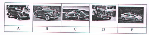 Below are 5 images of cars that belong to different time periods, placed in a random order. Write down the correct sequence of the cars according to the time period, from present to past, in the box provided below.