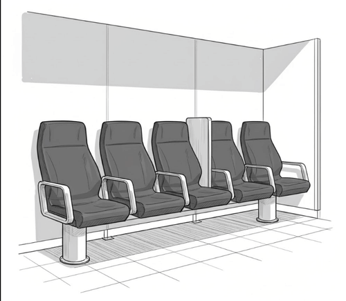 Individual, molded seats with backrests, vertical dividers, and armrests