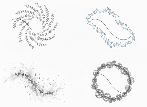 Quick Tip: Line Weight: Use a thicker, darker line for the primary line and the outlines of the surrounding designs. Use lighter, thinner lines for internal details, patterns, and to suggest volume. Shading/Hatching: Use hatching (parallel lines), cross-hatching, or stippling (dots) to fill areas and define forms. The more densely packed the marks are, the darker the area will appear, creating a sense of three-dimensionality, like on the gears or the leaves. Pressure: Experiment with the pressure of your pencil. Light pressure for soft, airy elements (like the watercolor-style splash) and firm pressure for sharp, mechanical, or graphic elements (like the geometric patterns).