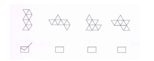 A tetrahedron is shown below made out of paper and 4 tessellations of the same. One of the 4 tessellations is wrong. Tick the wrong one.