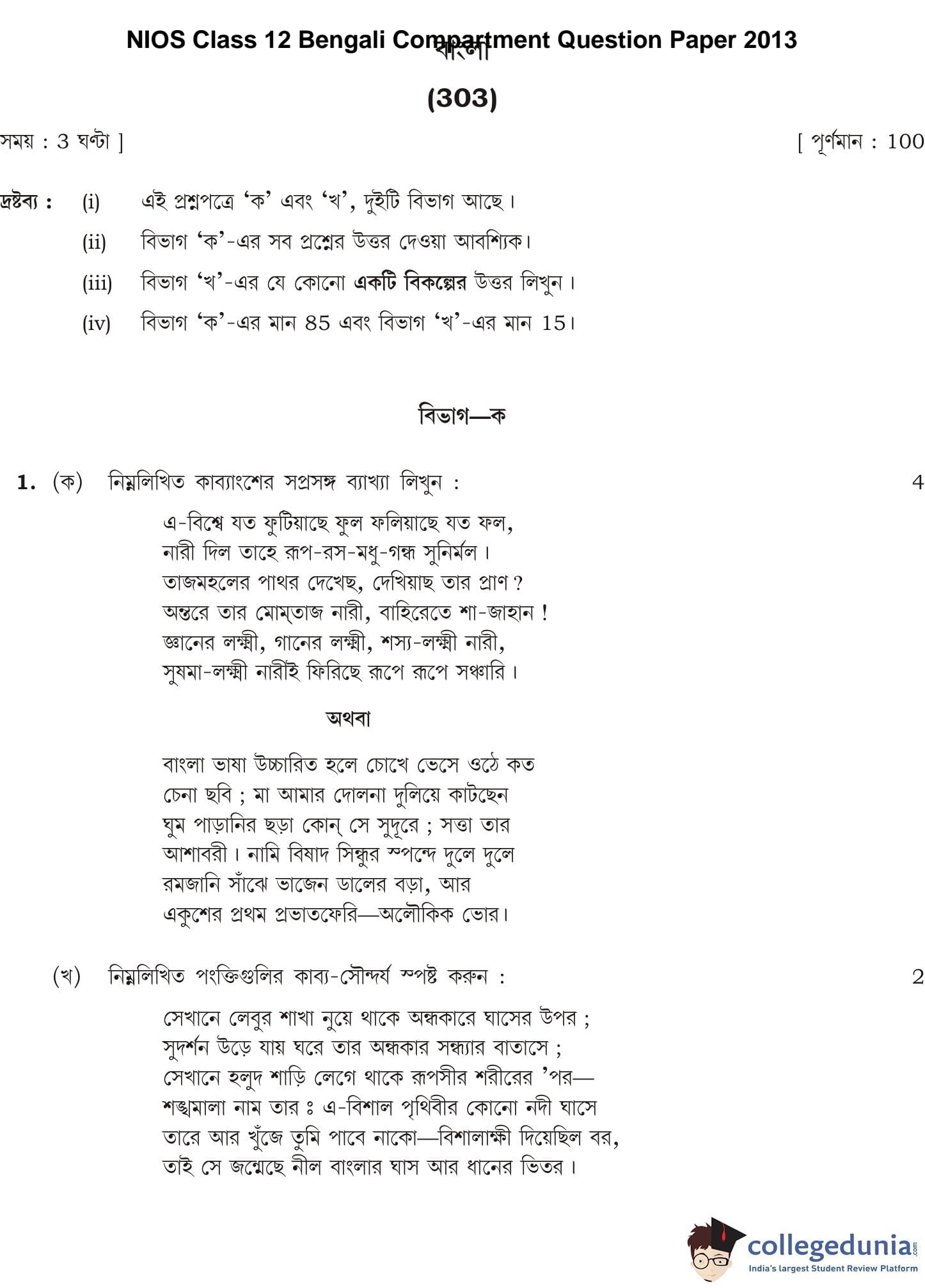 NIOS Class 12 Bengali Compartment Question Paper 2013 with Answer Key pdf is available for download here. The exam was conducted by National Institute of Open Schooling on November 13, 2013 in the Afternoon Session 2:30 PM to 5:30 PM. The question paper comprised a total of 25 questions divided among 2 sections.