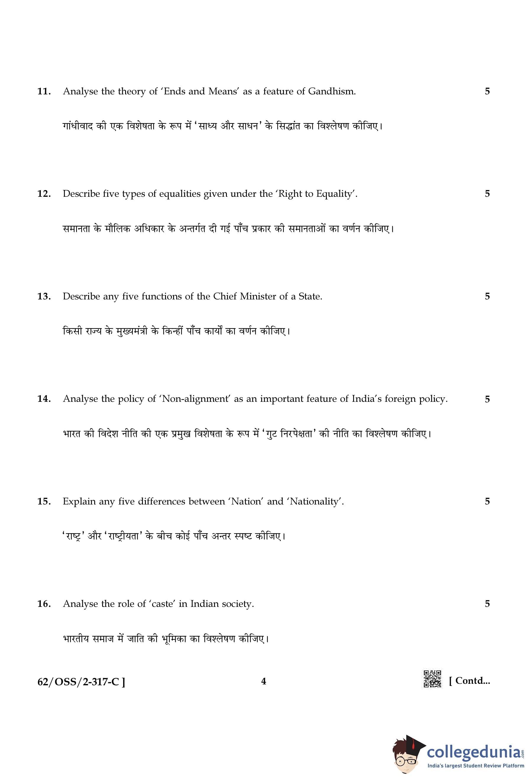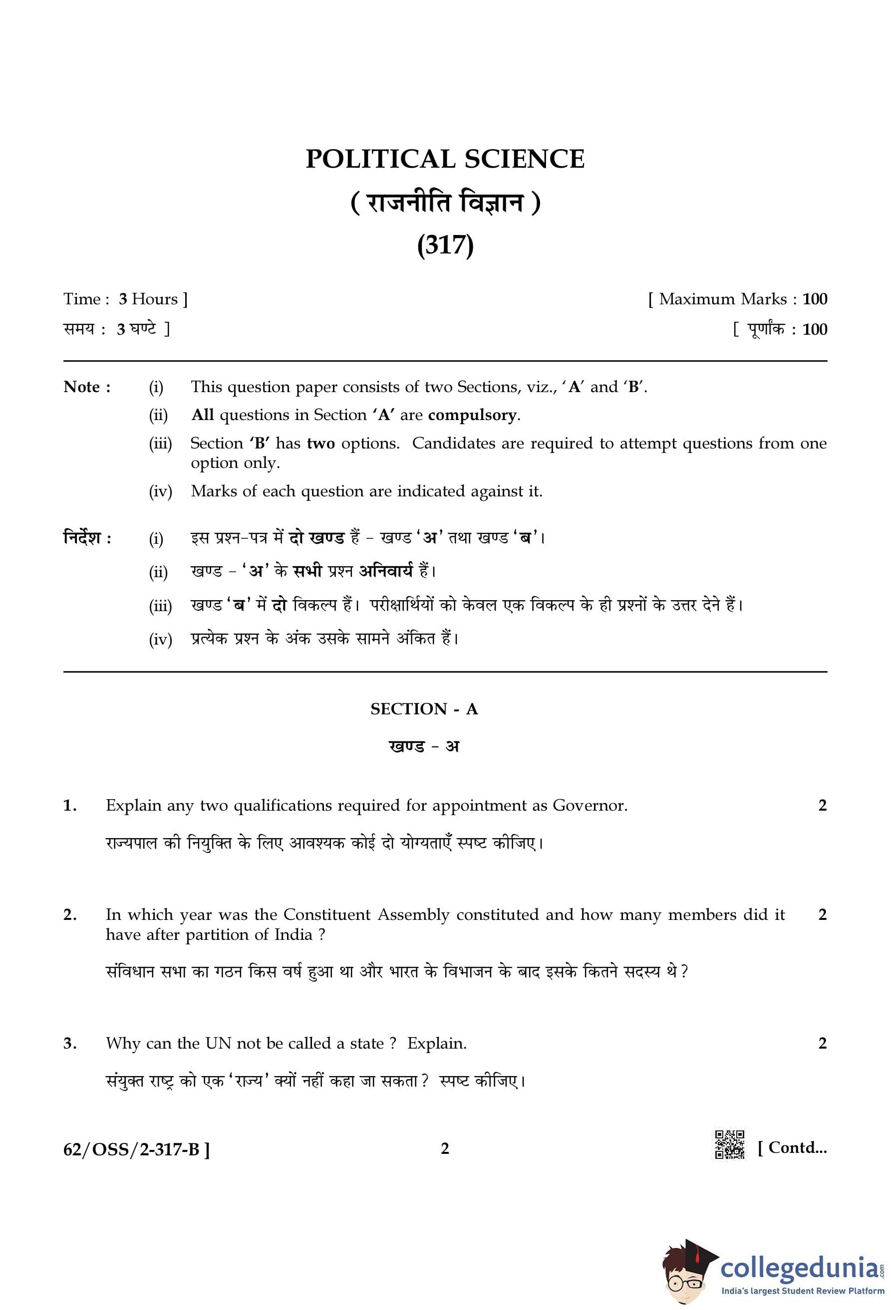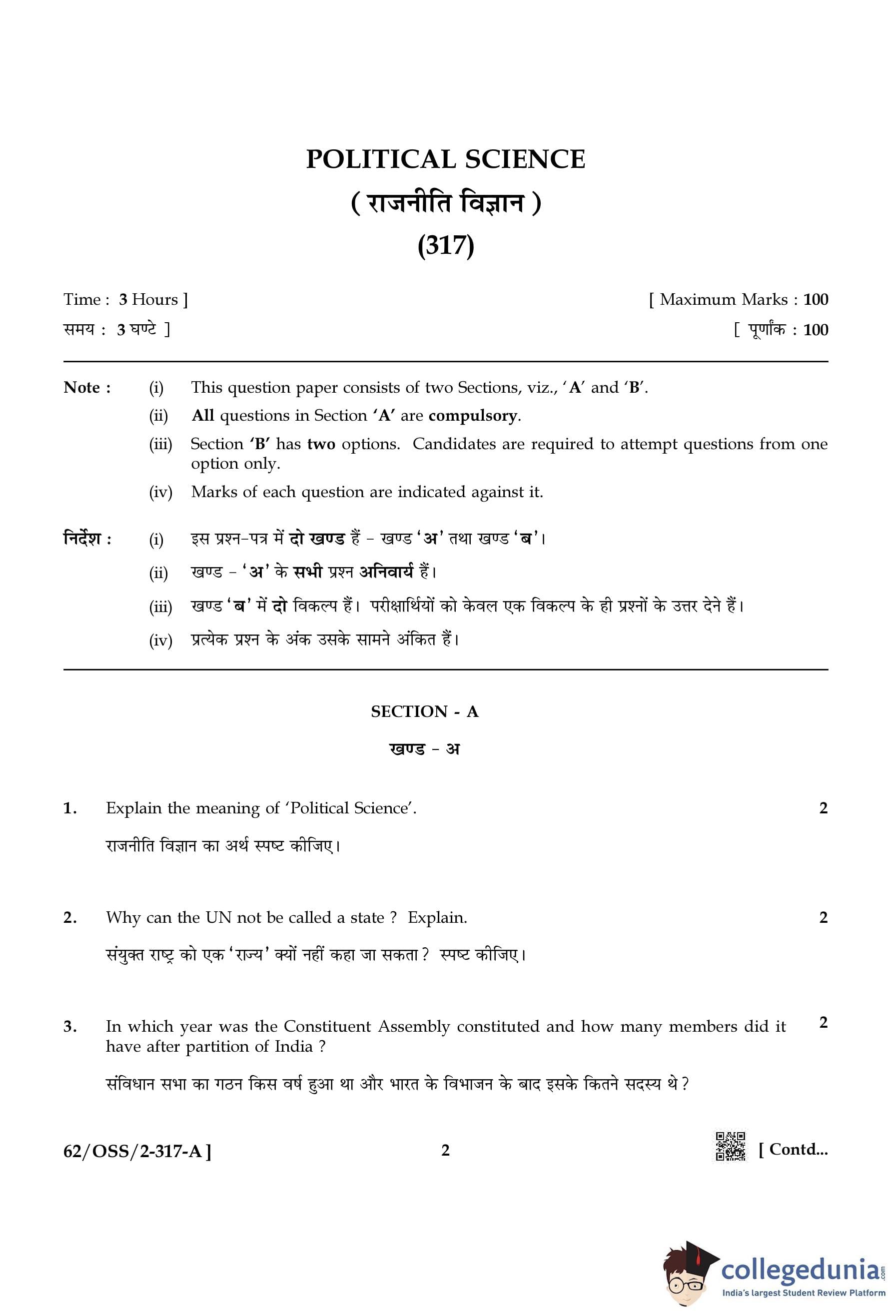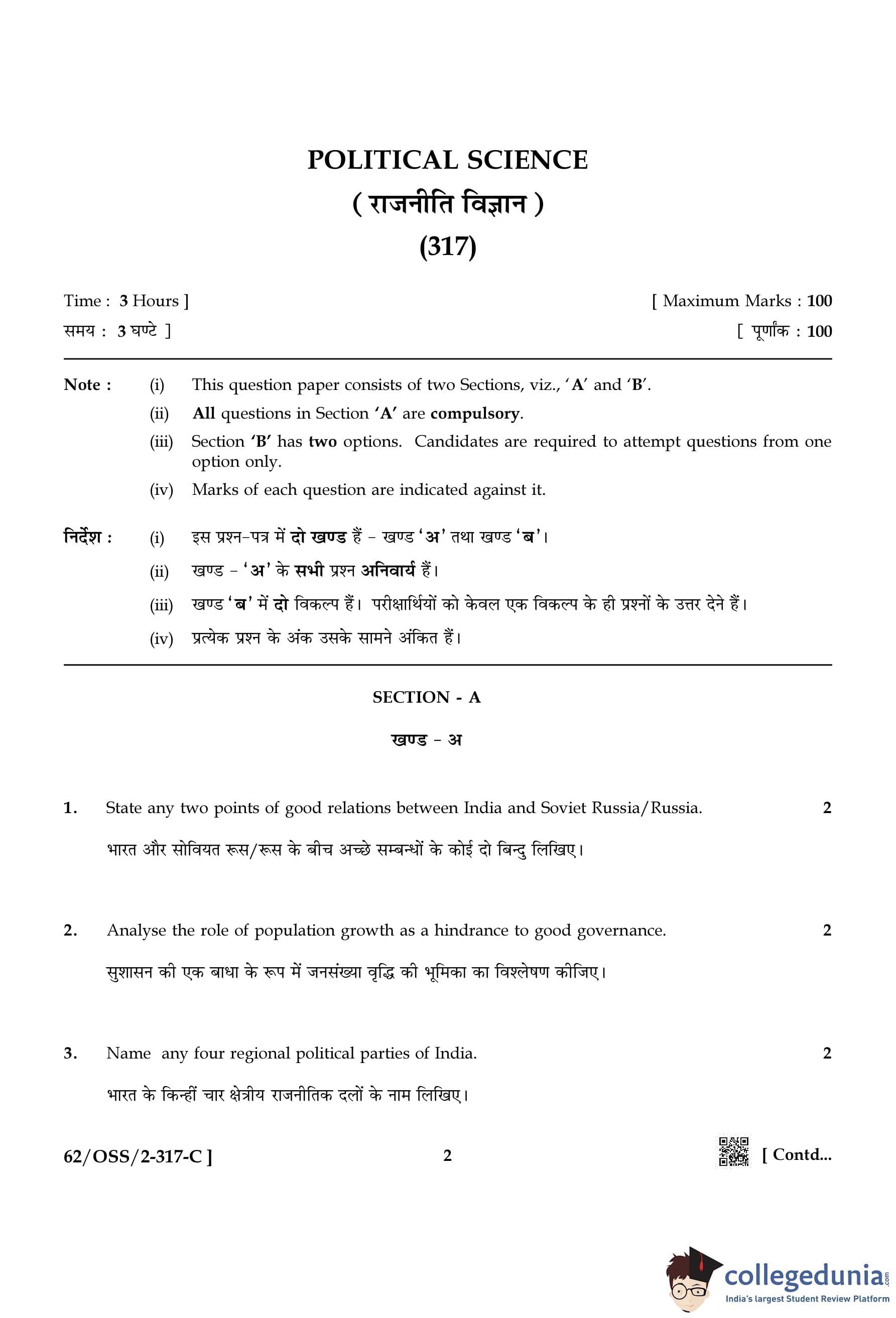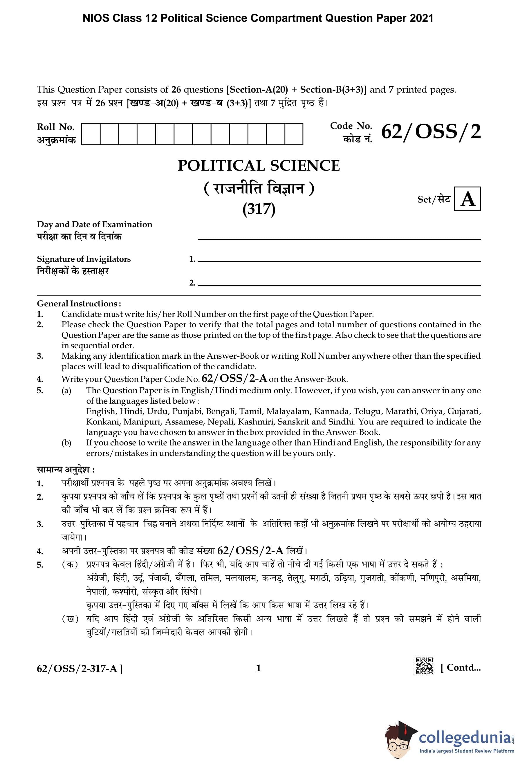 NIOS Class 12 Political Science Compartment Question Paper 2021 with Answer Key