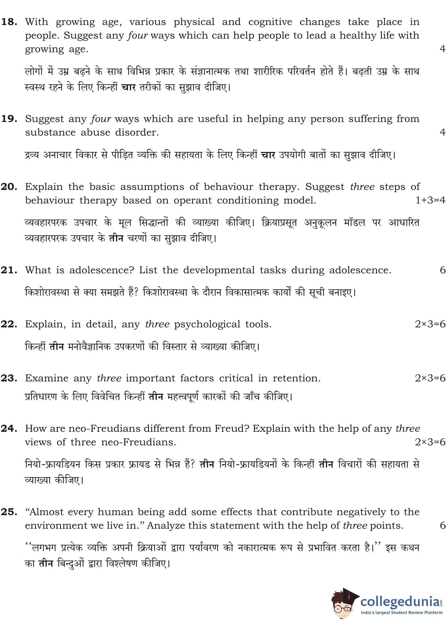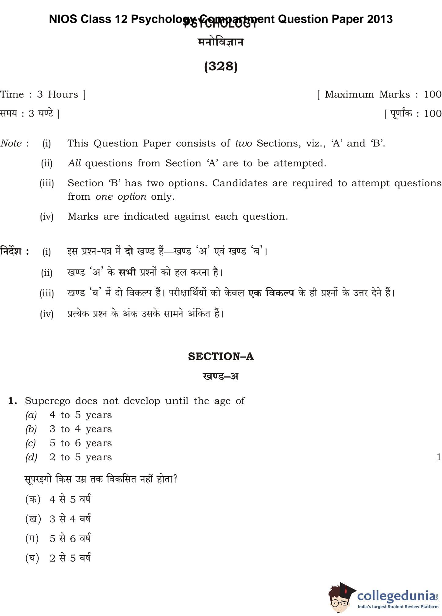 NIOS Class 12 Psychology Compartment Question Paper 2013 with Answer Key pdf is available for download here. The exam was conducted by National Institute of Open Schooling on November 12, 2013 in the Afternoon Session 2:30 PM to 5:30 PM. The question paper comprised a total of 30 questions divided among 2 sections.