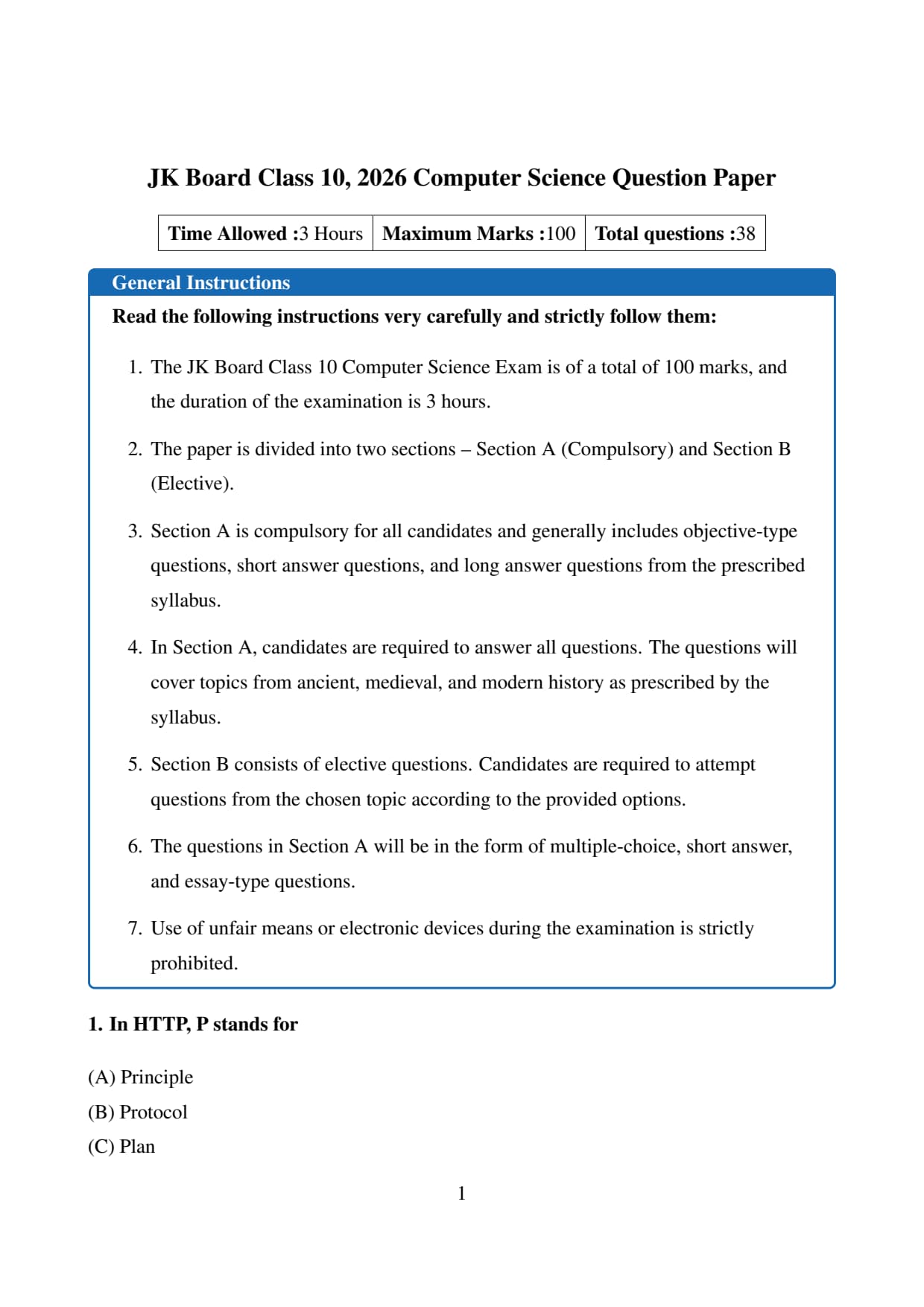 The official question paper of JK Board Class 10 Computer Science Board Exam 2026 is provided below. Students can download the official paper in PDF format for reference.