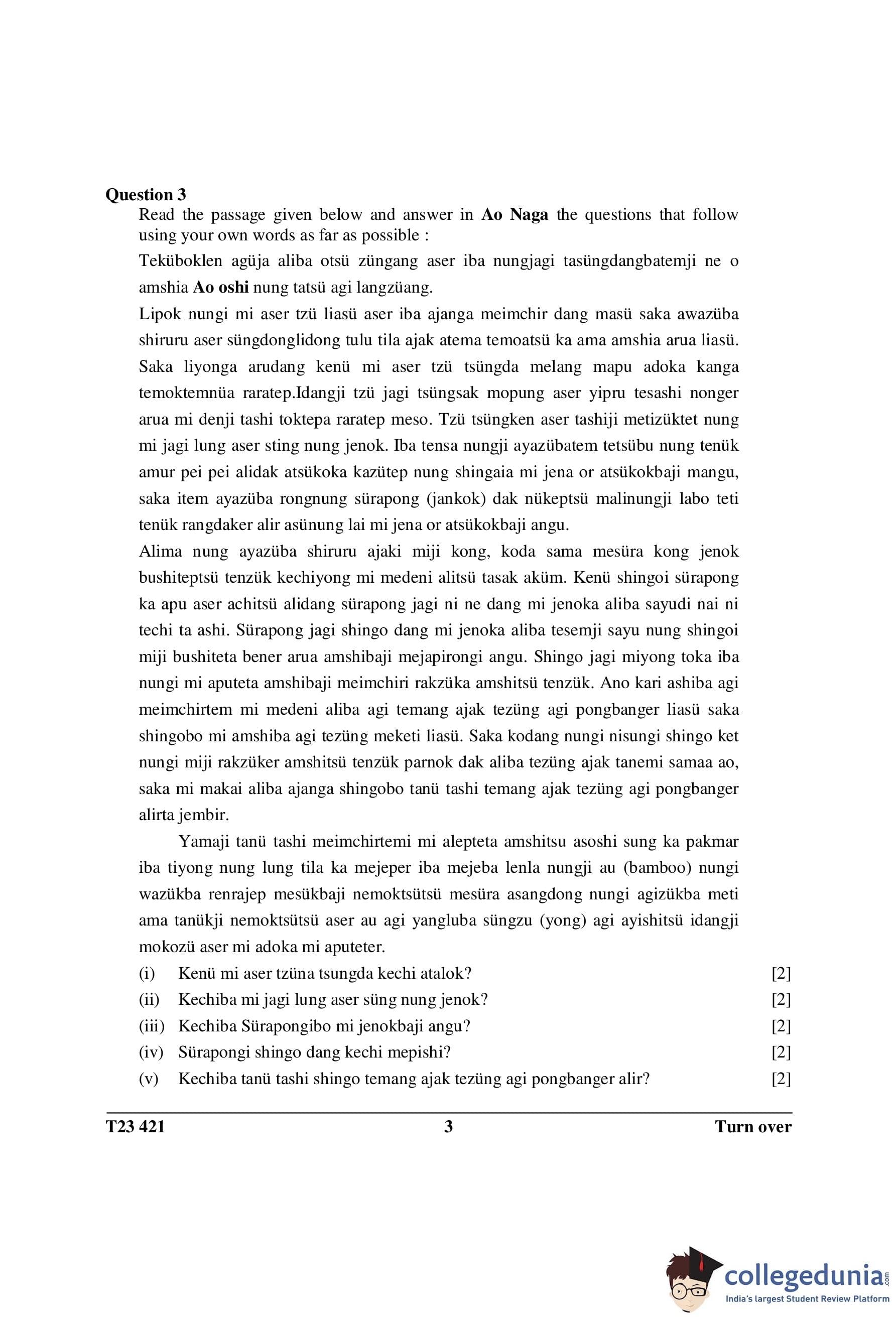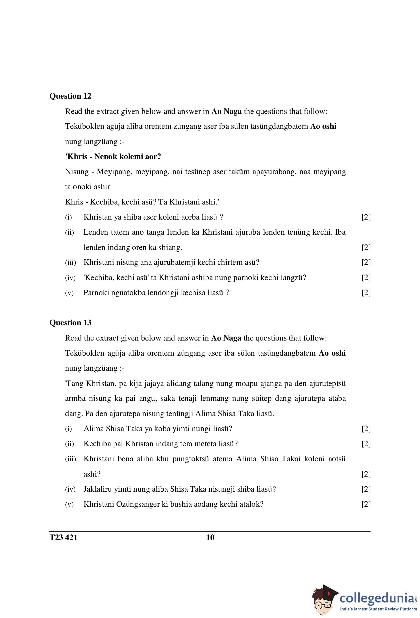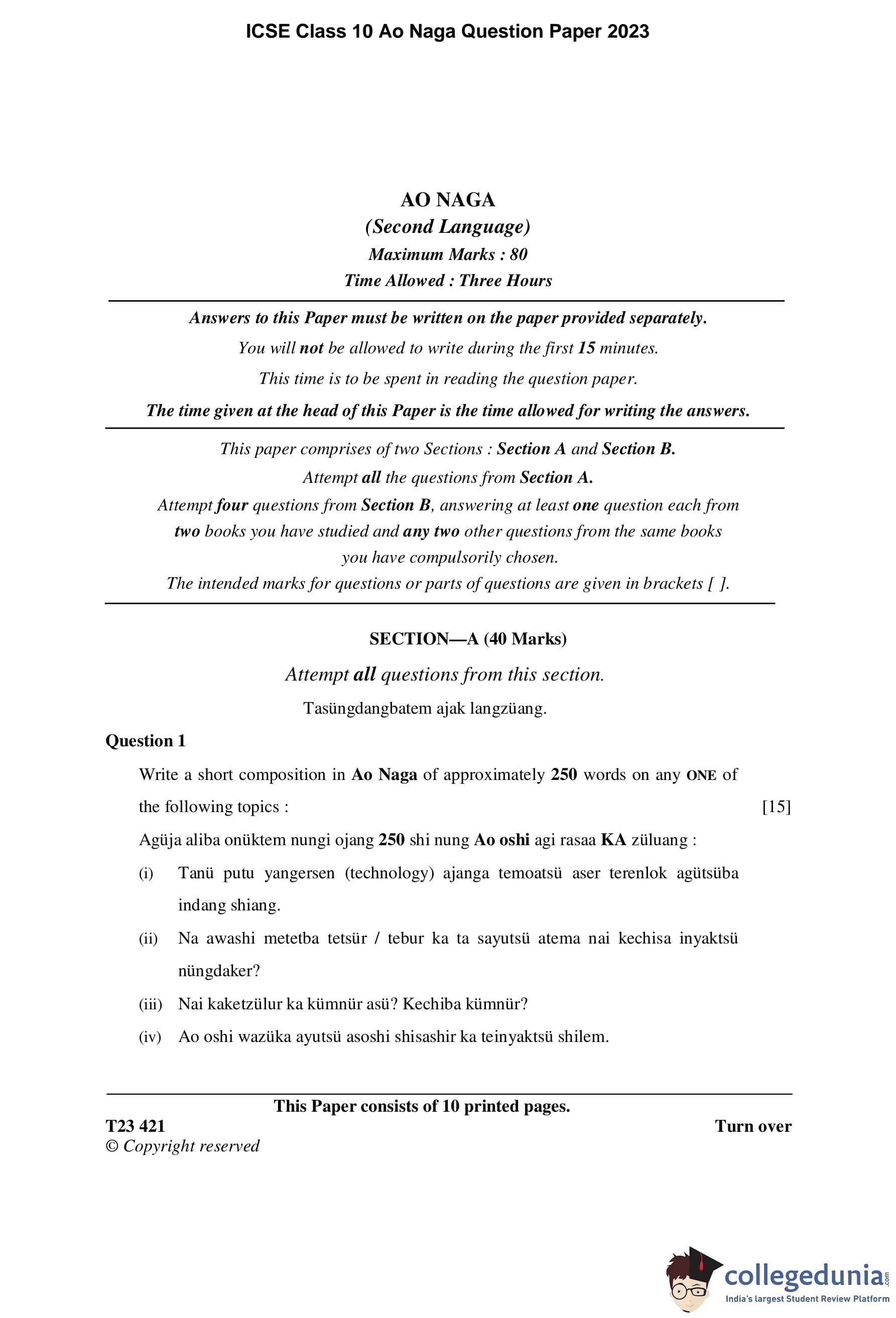 ICSE Class 10 Ao Naga Question Paper 2023 with Answer Key