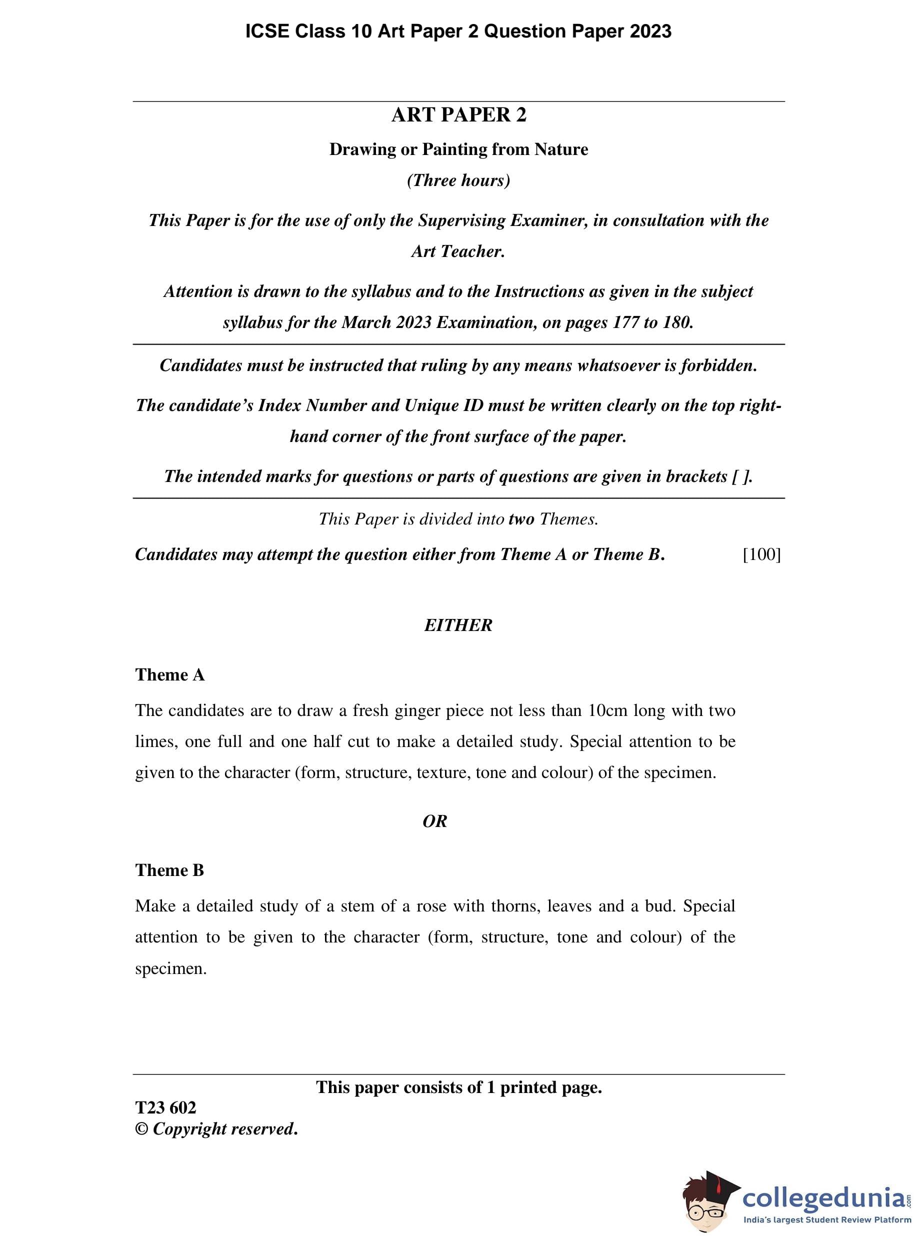 ICSE Class 10 Art Paper 2 Question Paper 2023 with Answer Key