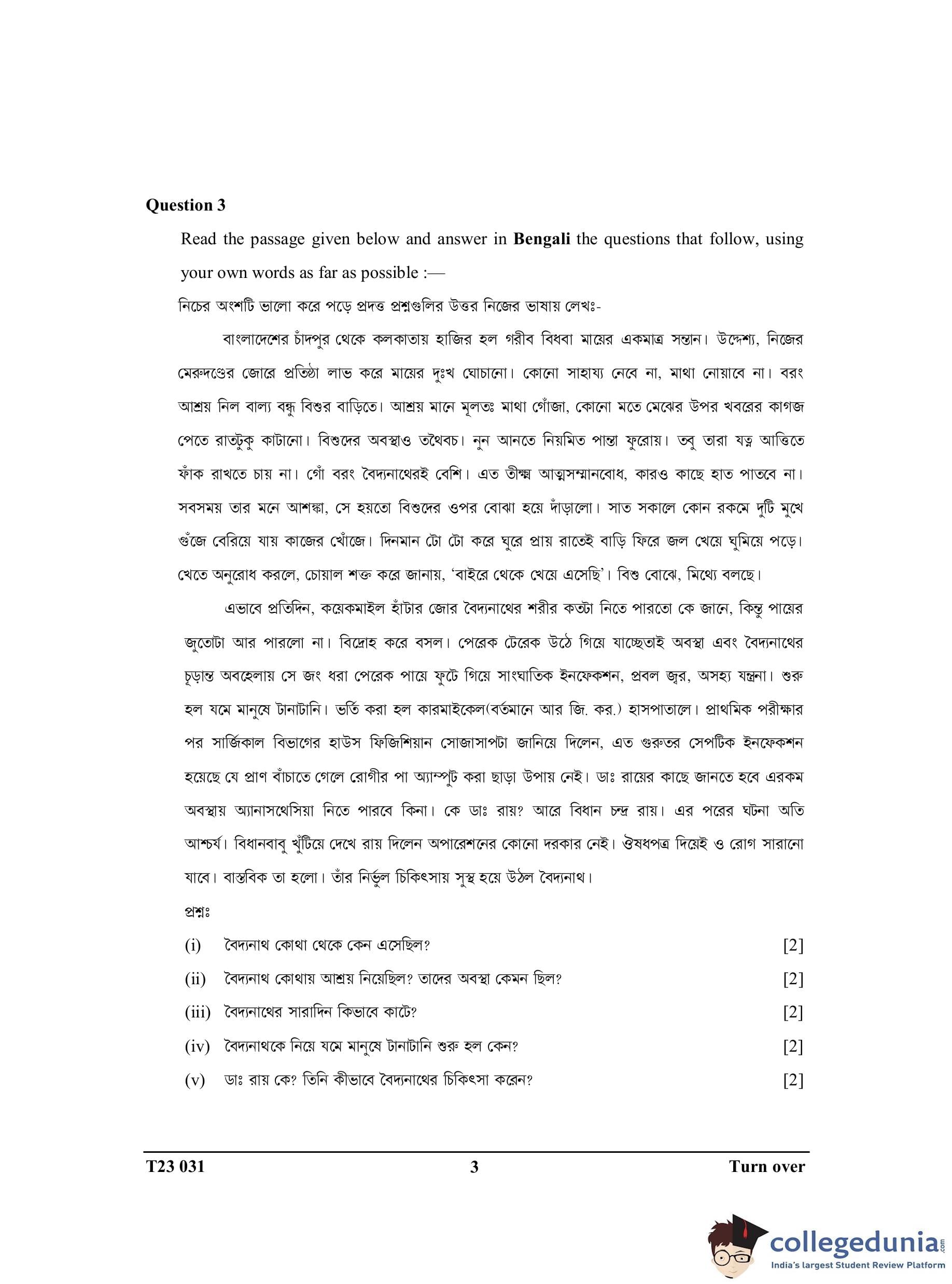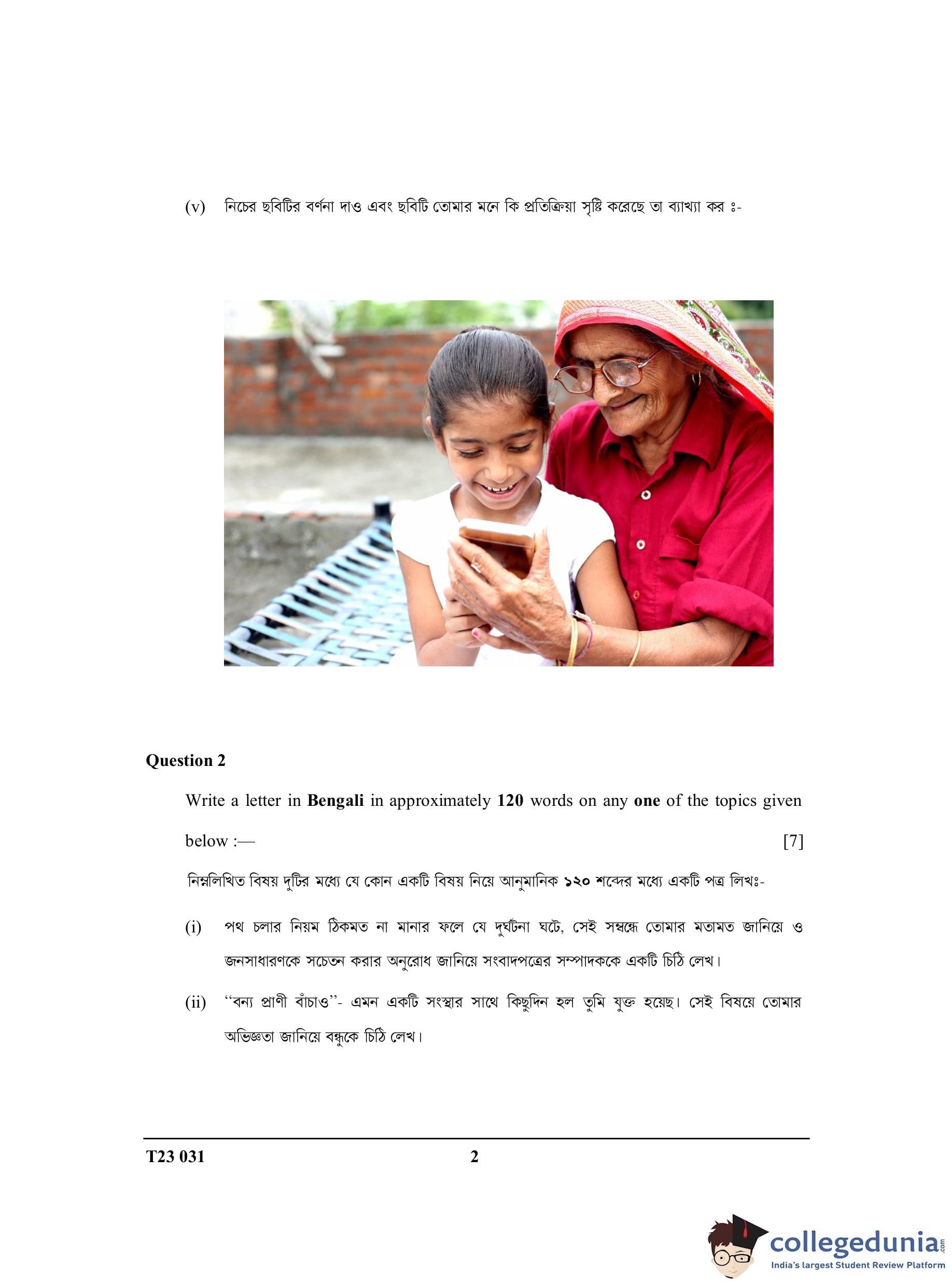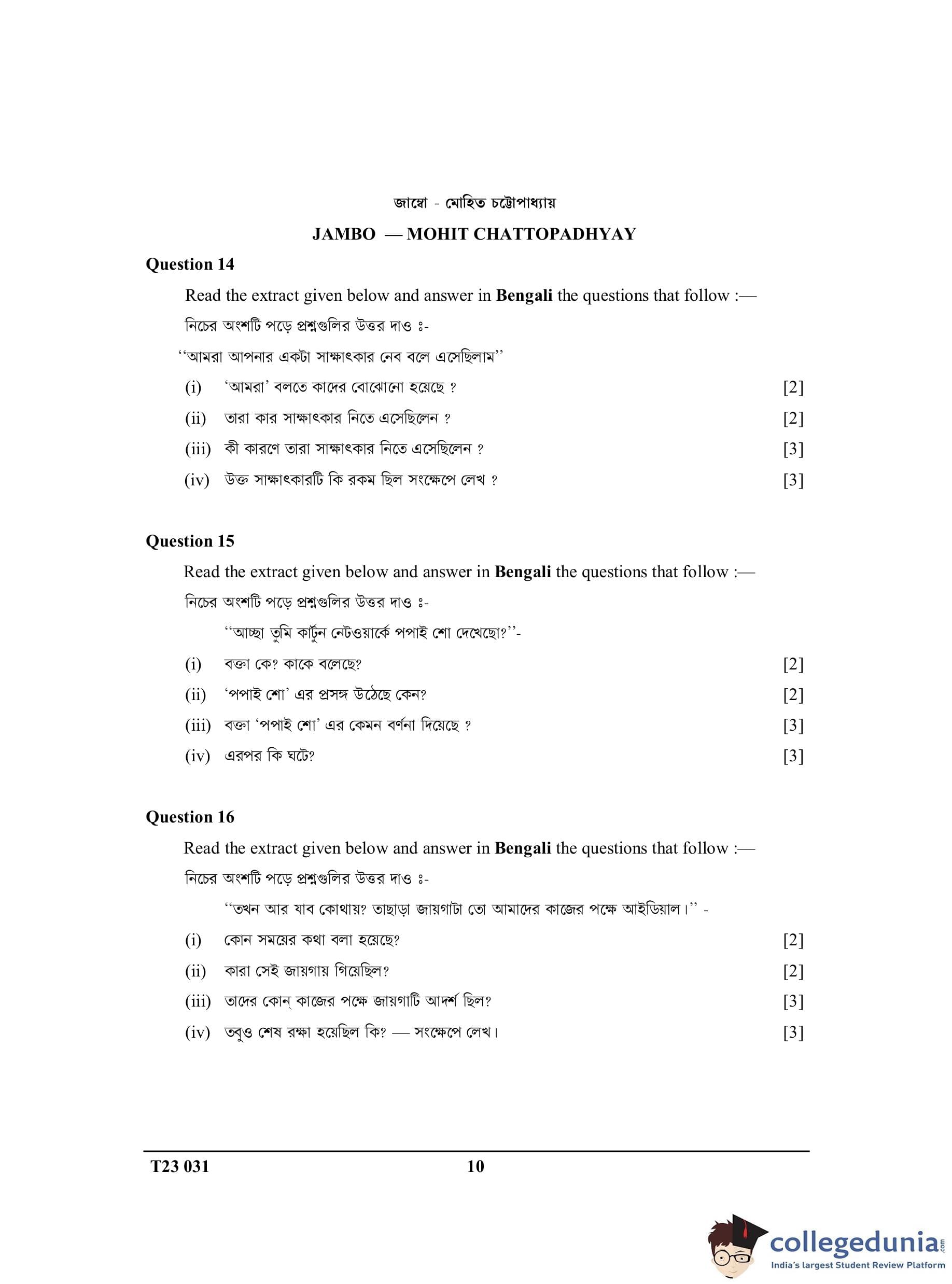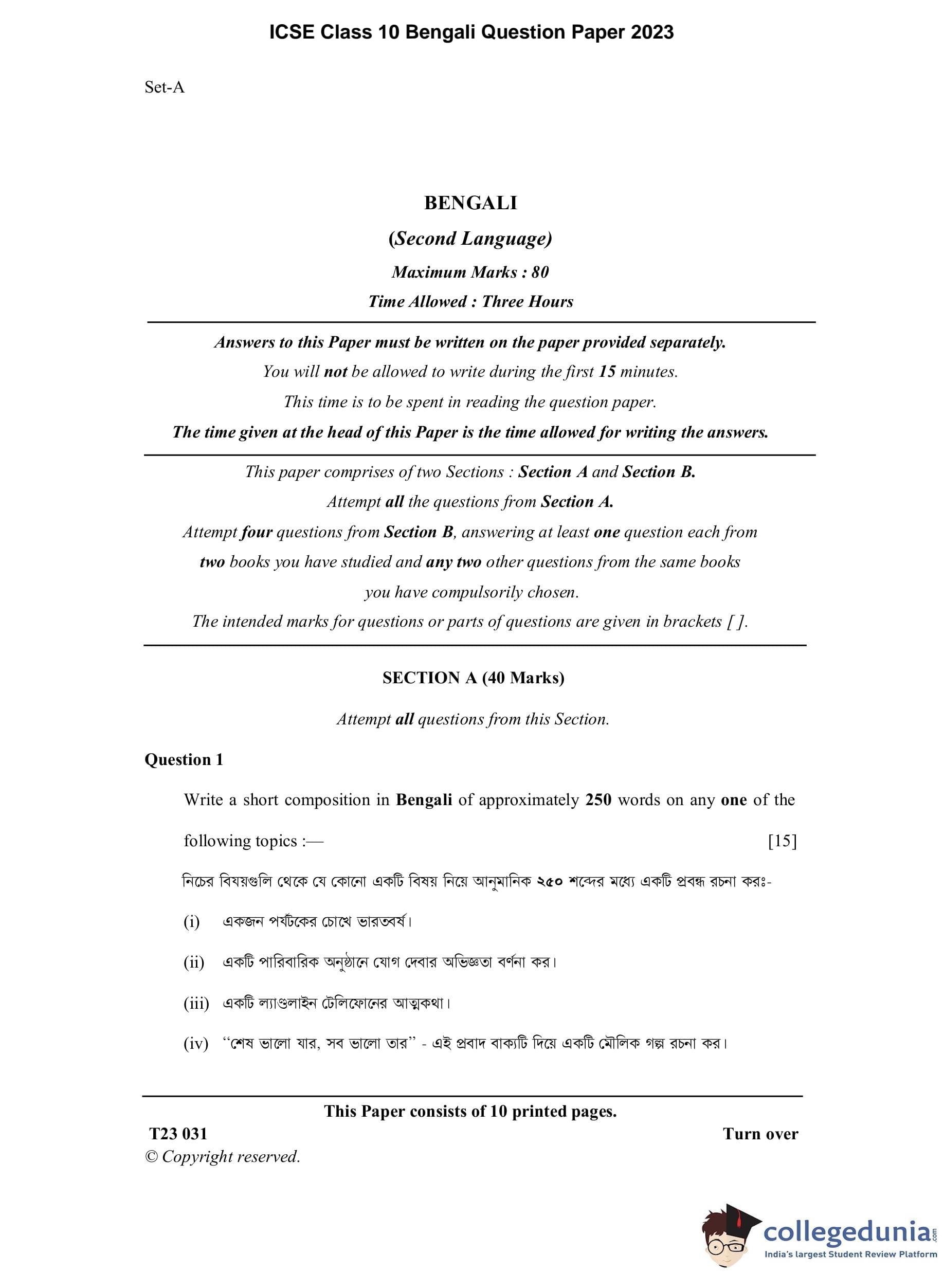 ICSE Class 10 Bengali Question Paper 2023 with Answer Key