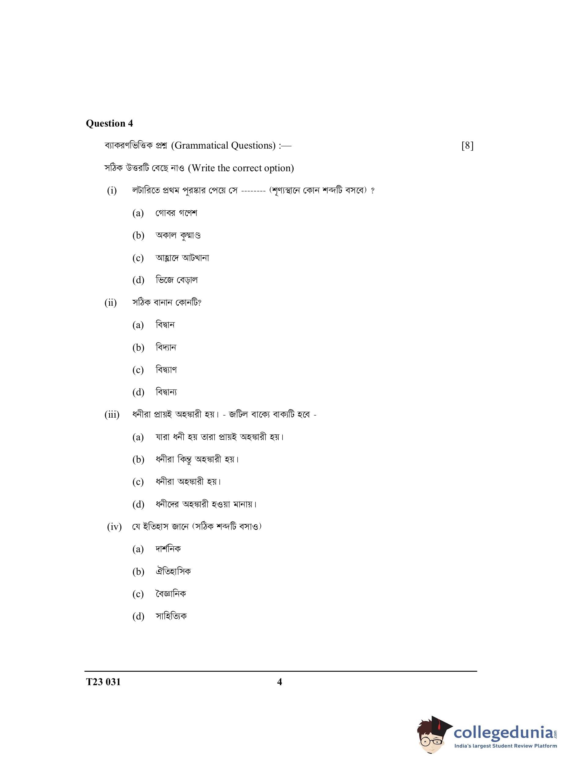 ICSE Class 10 Bengali Question Paper 2023 with Answer Key pdf is available for download here. The exam was conducted by Council for the Indian School Certificate Examinations (CISCE) on March 15, 2023 in the Morning Session 11 AM to 2 PM. The question paper comprised a total of 16 questions divided among 2 sections.