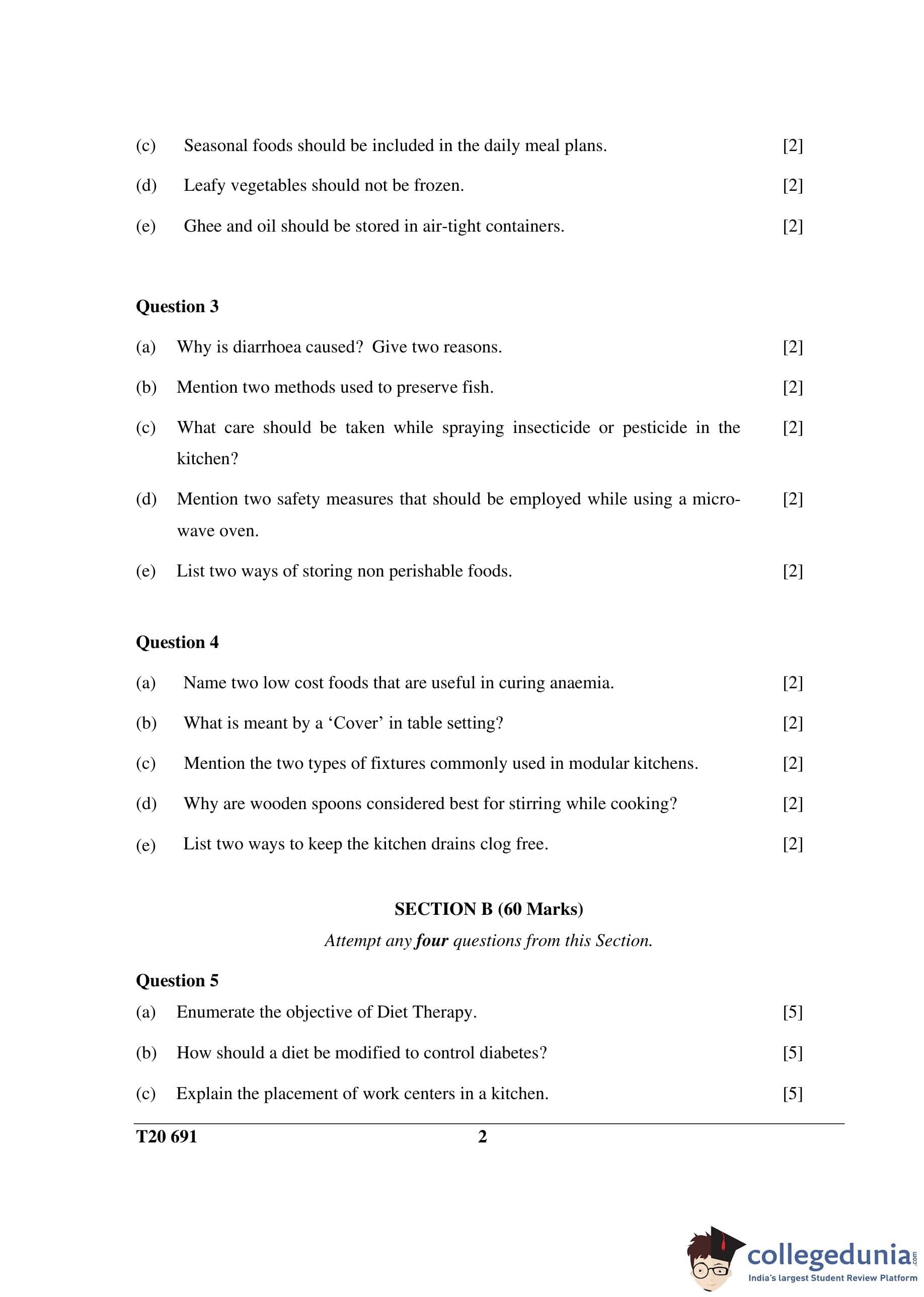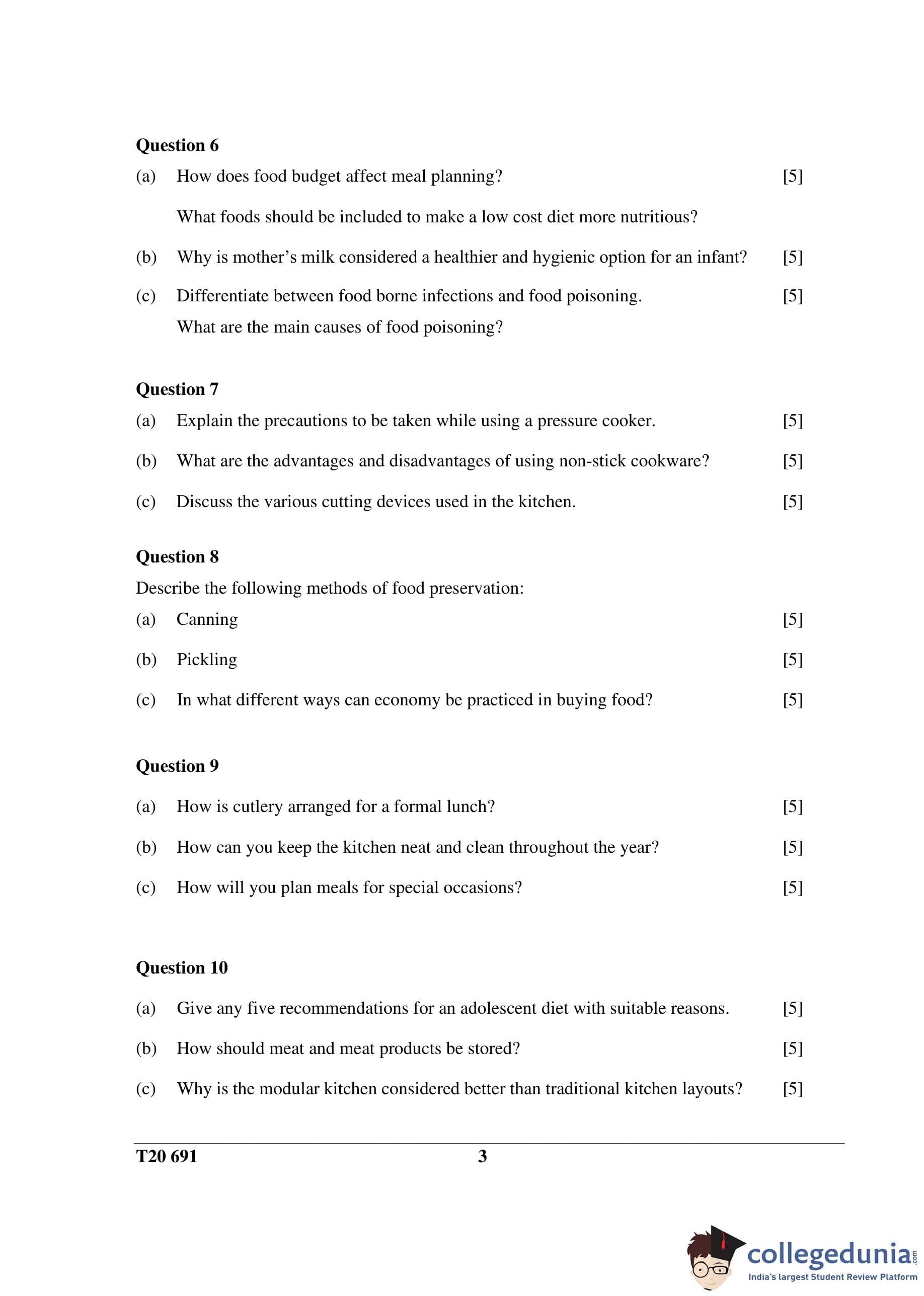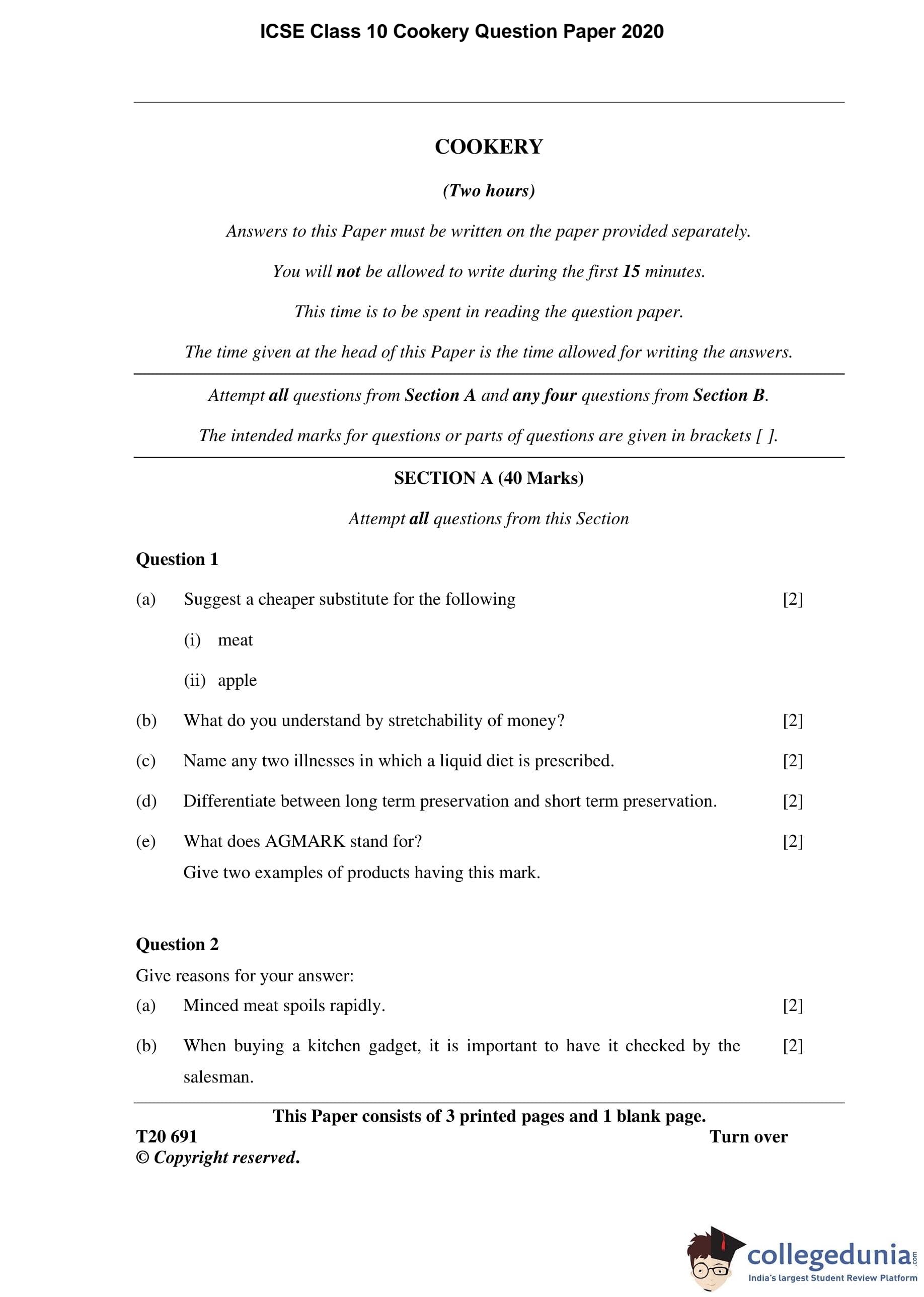 ICSE Class 10 Cookery Question Paper 2020 with Answer Key