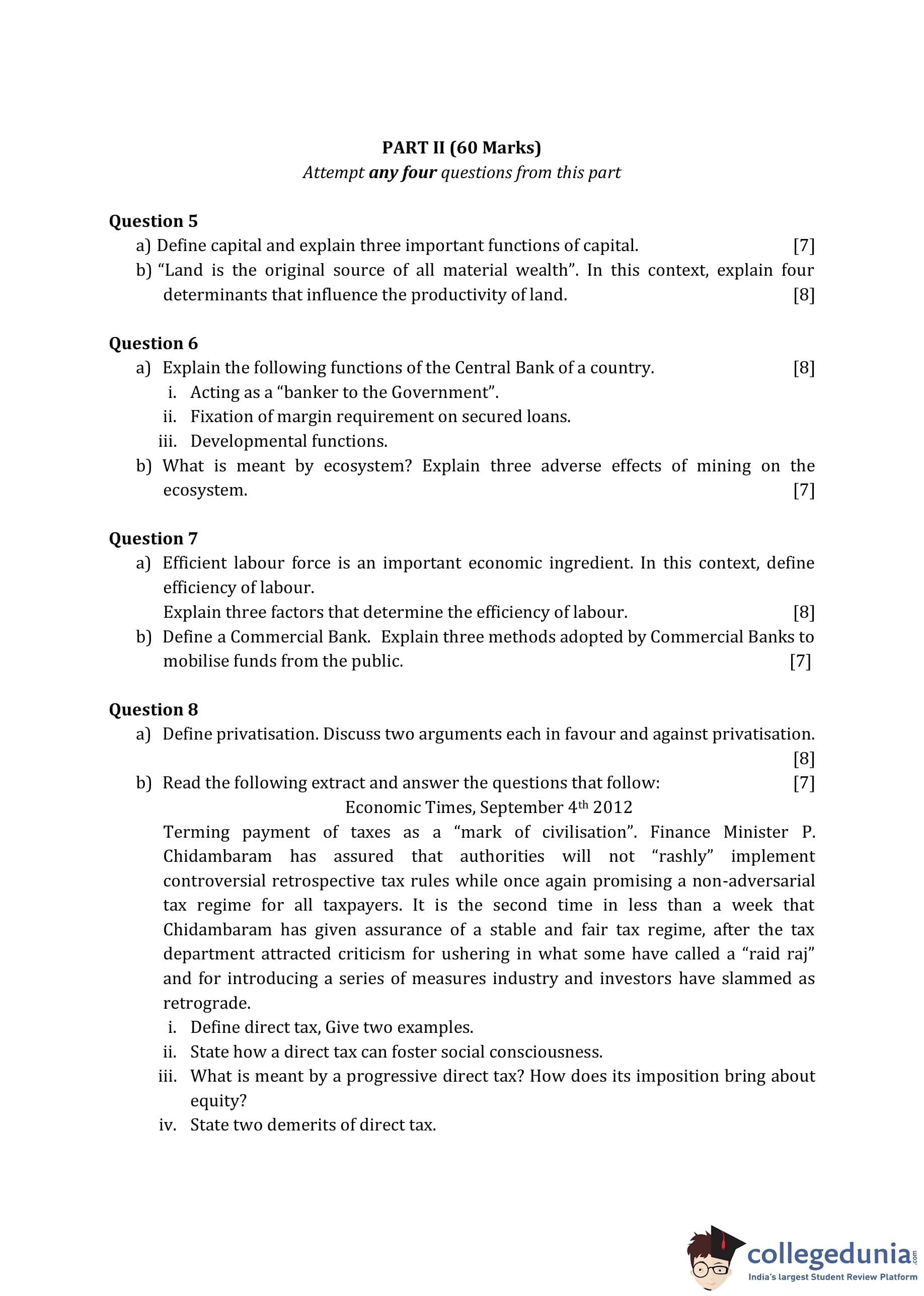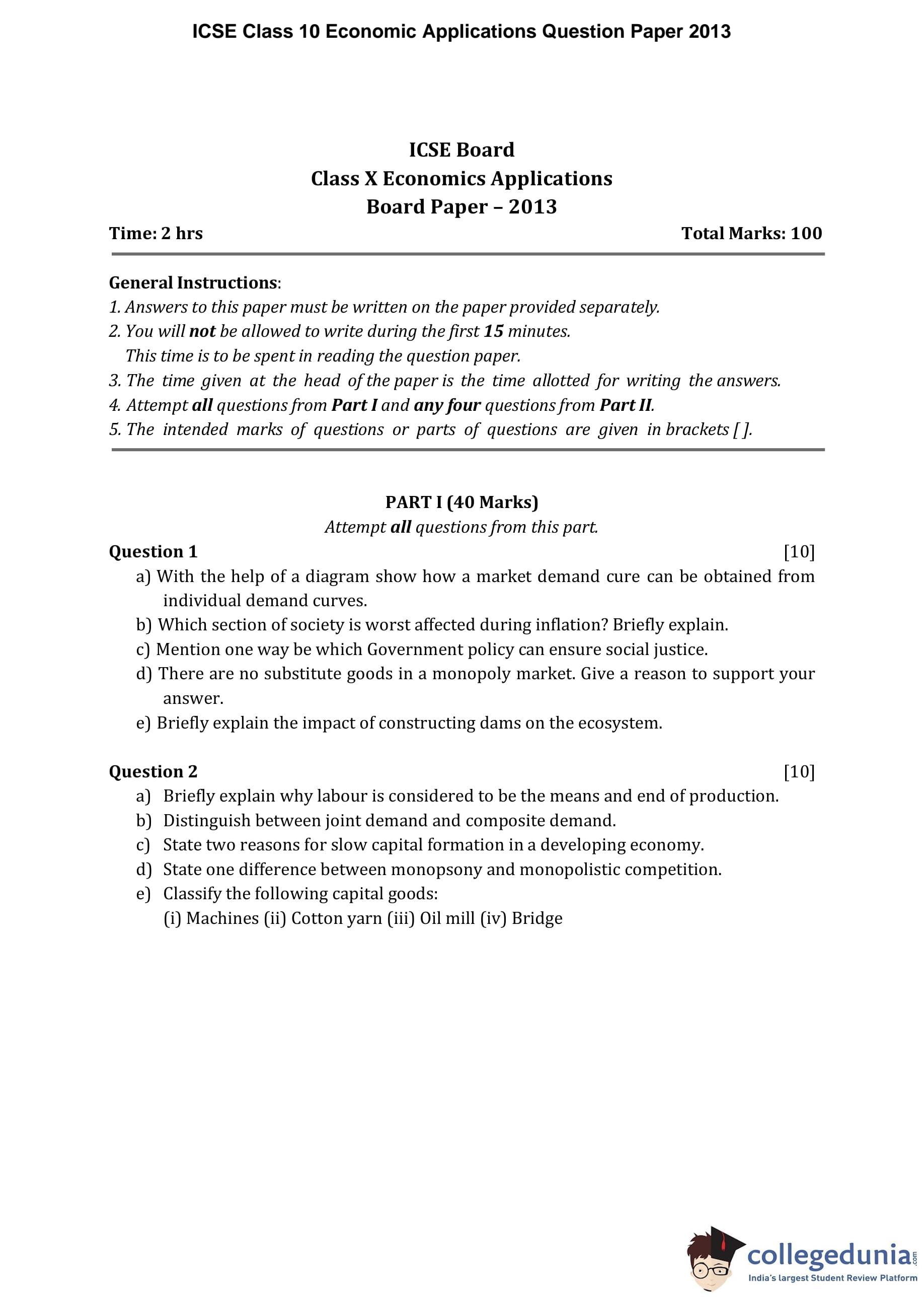 ICSE Class 10 Economic Applications Question Paper 2013 with Answer Key pdf is available for download here. The exam was conducted by Council for the Indian School Certificate Examinations on March 11, 2013 in the Morning Session 11 AM to 1 PM. The question paper comprised a total of 10 questions divided among 2 sections.