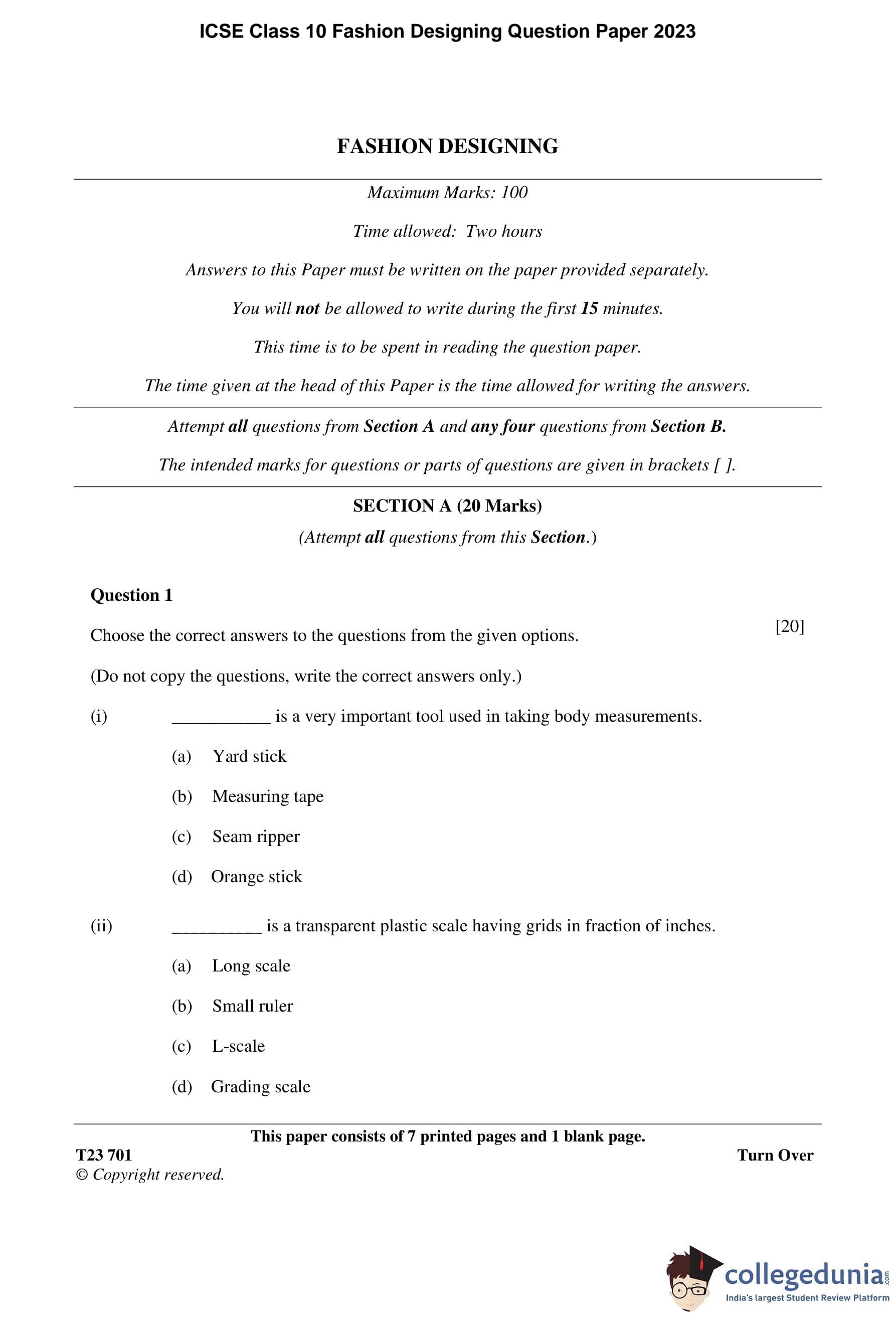 ICSE Class 10 Fashion Designing Question Paper 2023 with Answer Key pdf is available for download here. The exam was conducted by Council for the Indian School Certificate Examinations (CISCE) on March 23, 2023 in the Morning Session 11 AM to 1 PM. The question paper comprised a total of 7 questions divided among 2 sections.