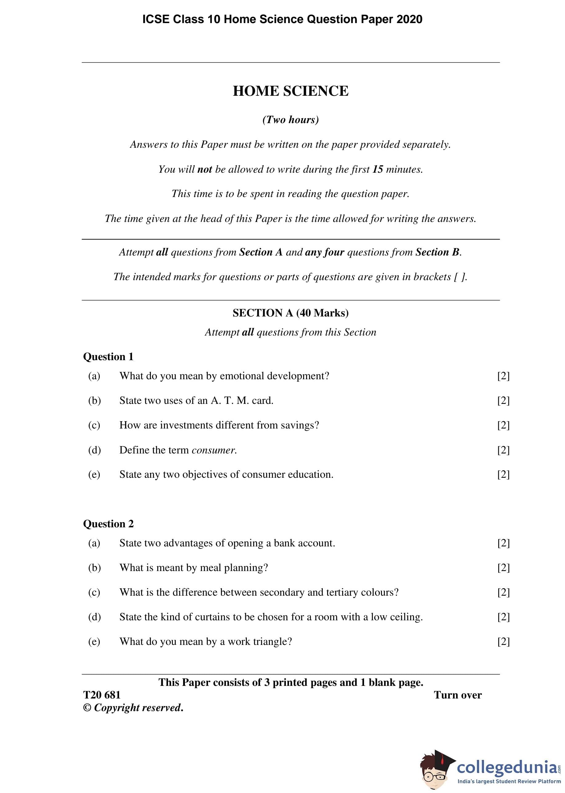 | ICSE Class 10 Home Science Question Paper 2020 PDF | ICSE Class 10 Home Science Answer Key 2020 PDF |
