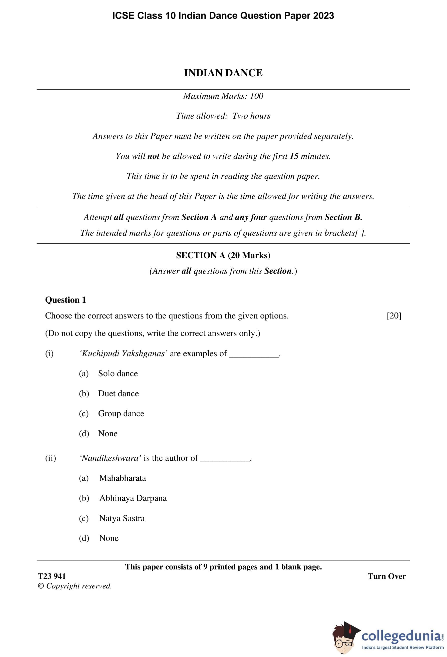 | ICSE Class 10 Indian Dance Question Paper 2023 PDF | ICSE Class 10 Indian Dance Answer Key 2023 PDF |