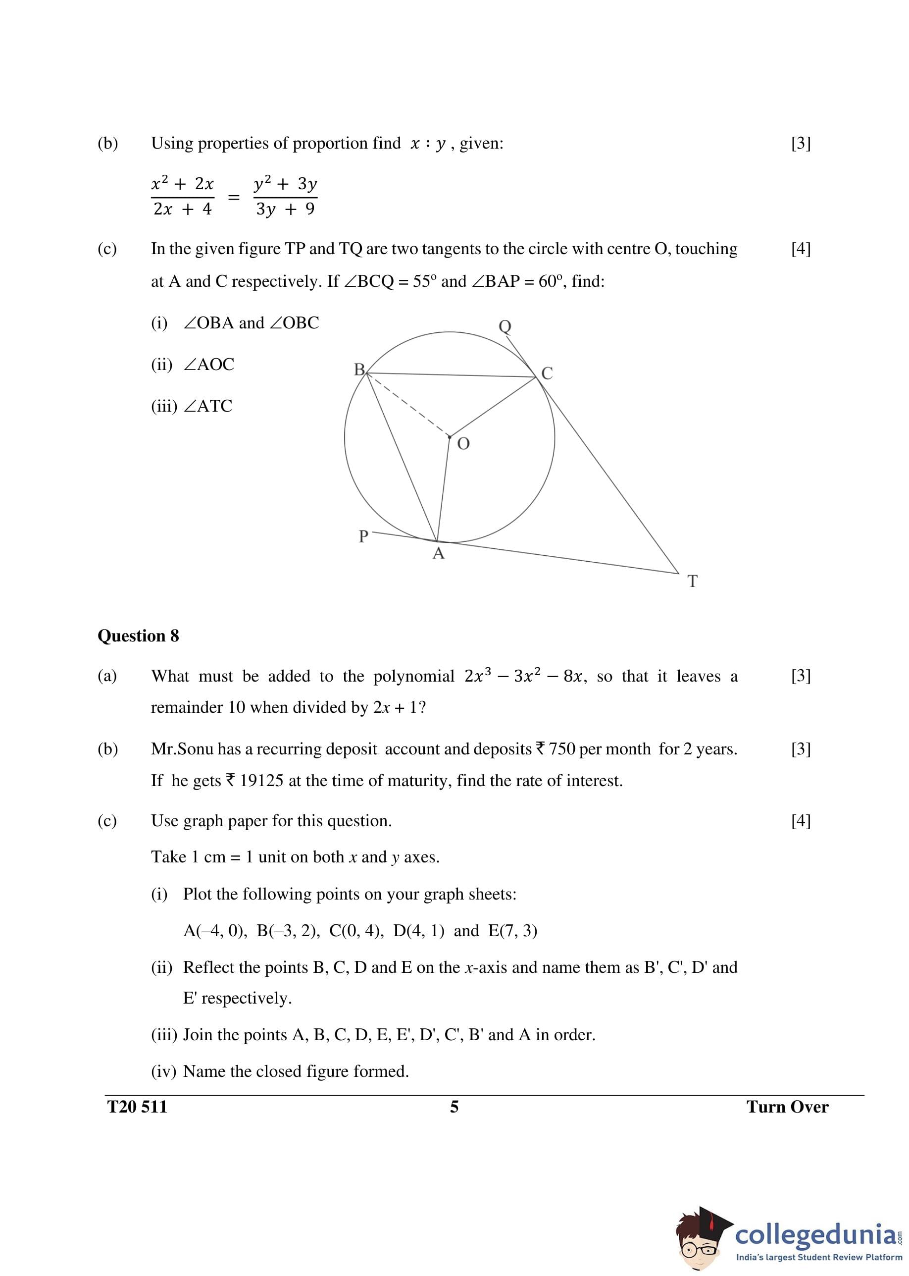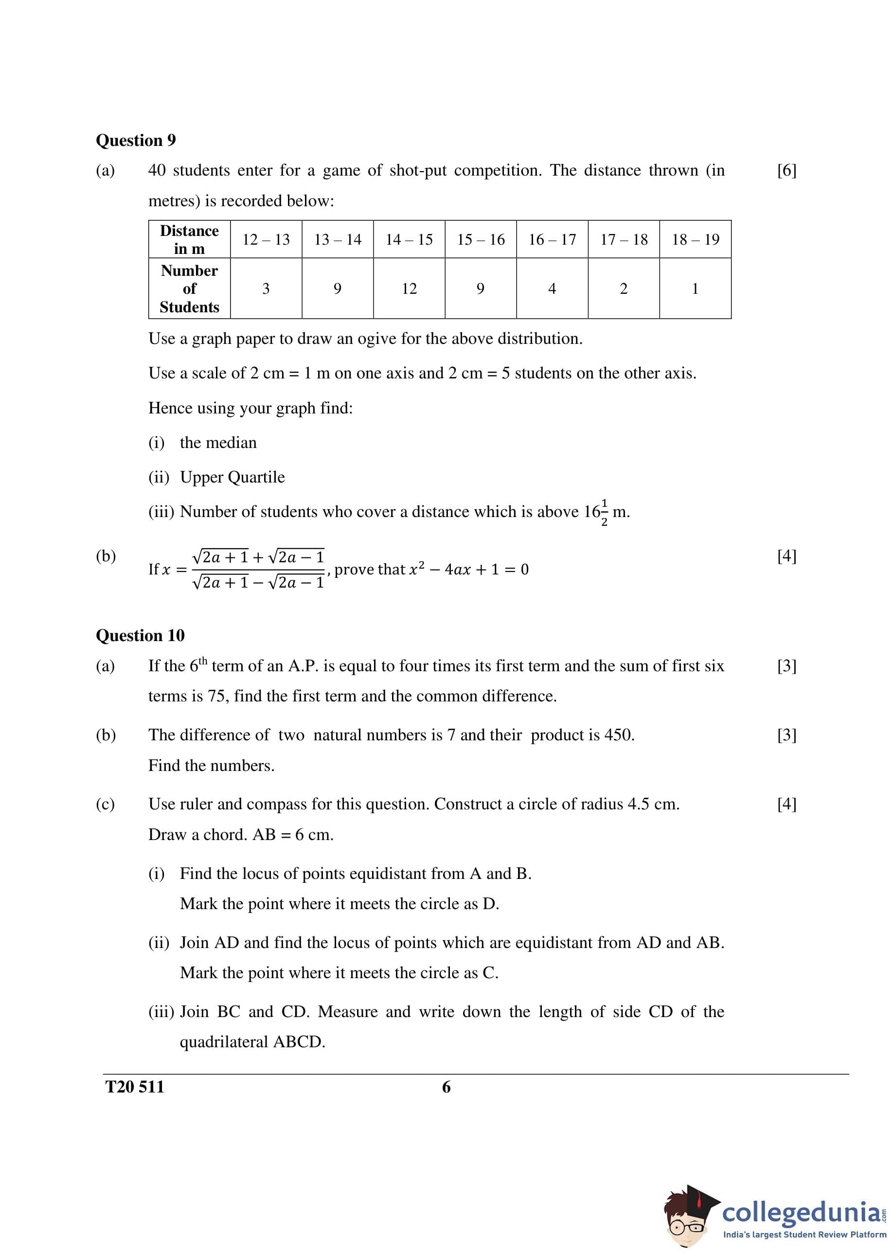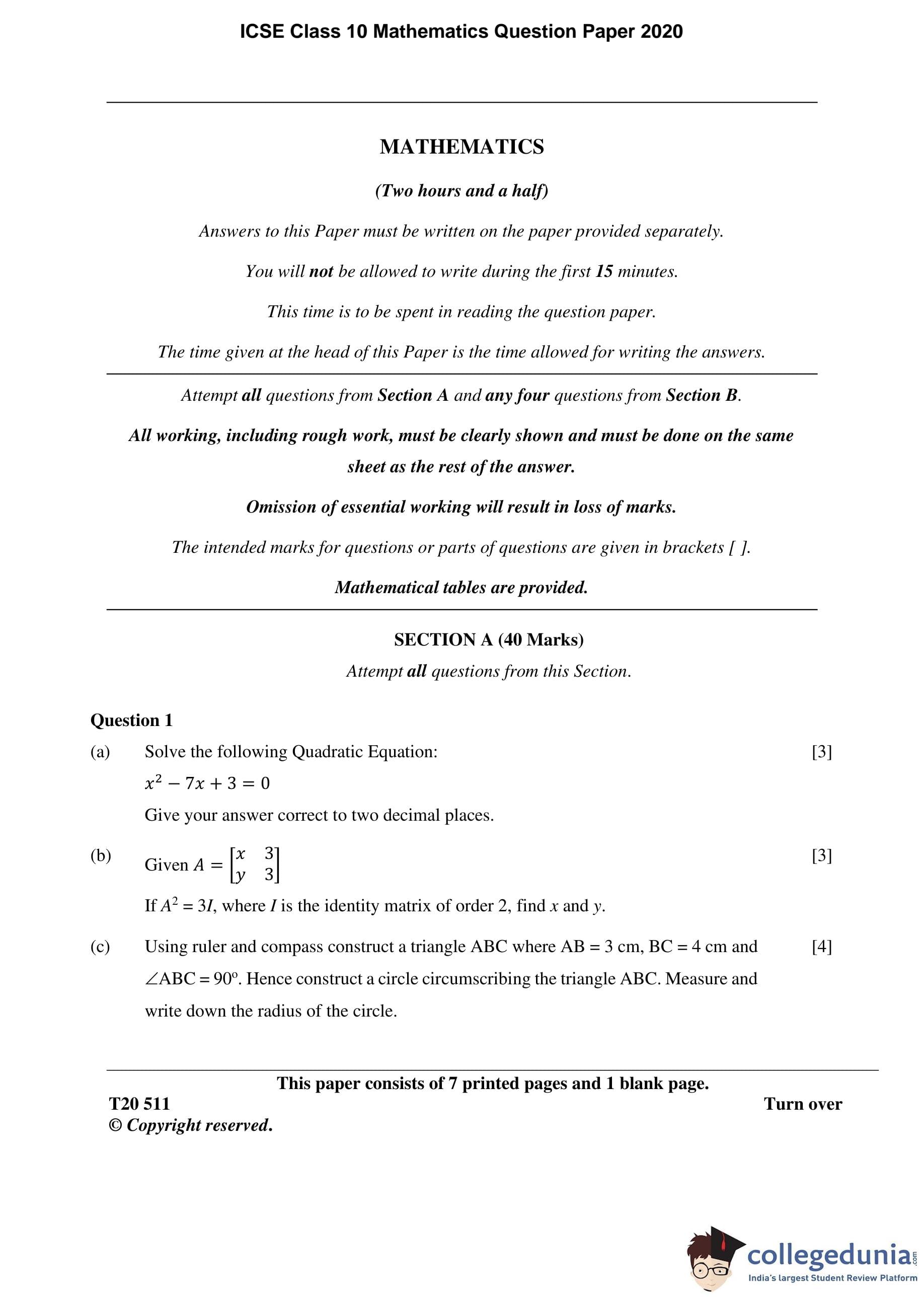 ICSE Class 10 Mathematics Question Paper 2020 with Answer Key