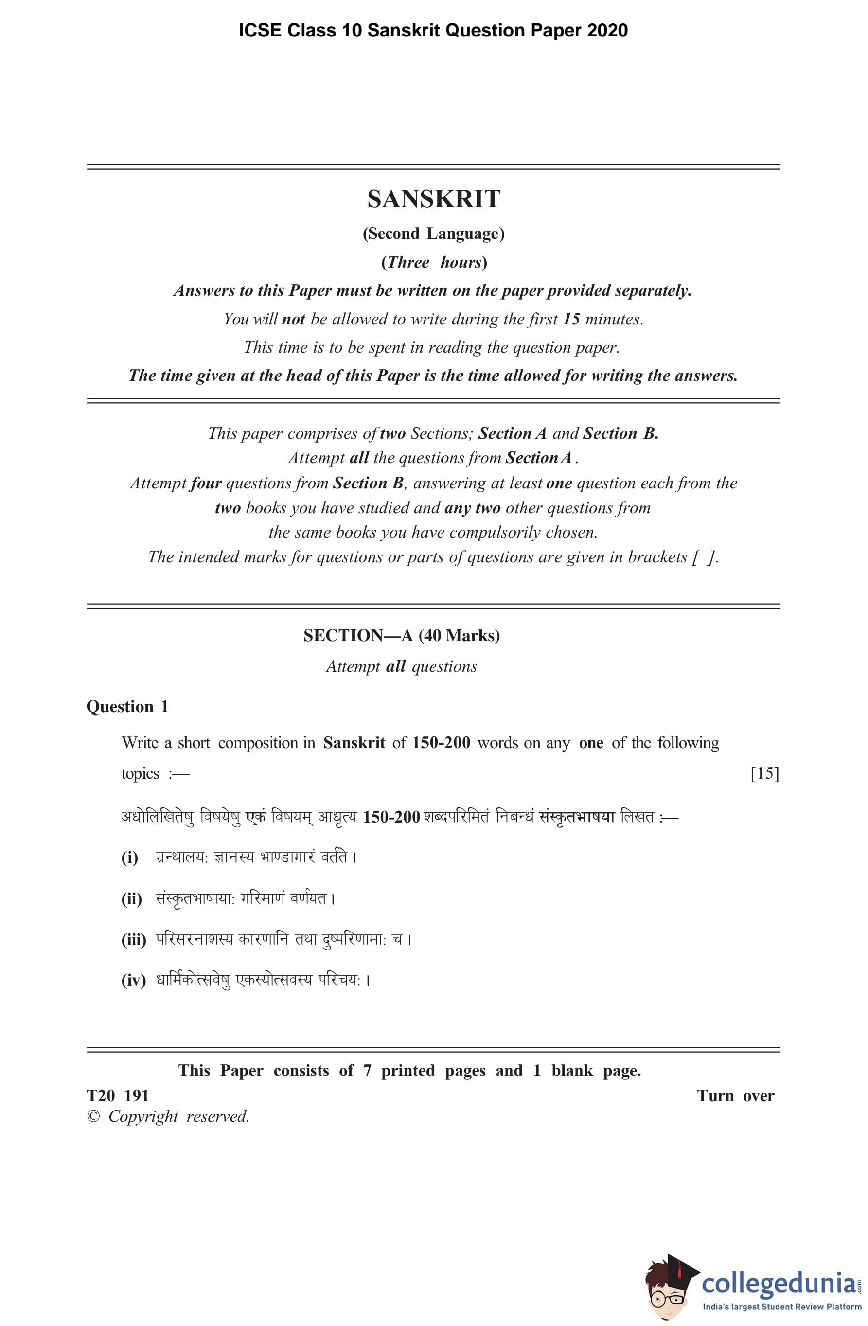 ICSE Class 10 Sanskrit Question Paper 2020 with Answer Key pdf is available for download here. The exam was conducted by Council for the Indian School Certificate Examinations on March 7, 2020 in the Morning Session 11 AM to 1 PM. The question paper comprised a total of 10 questions divided among 2 sections.