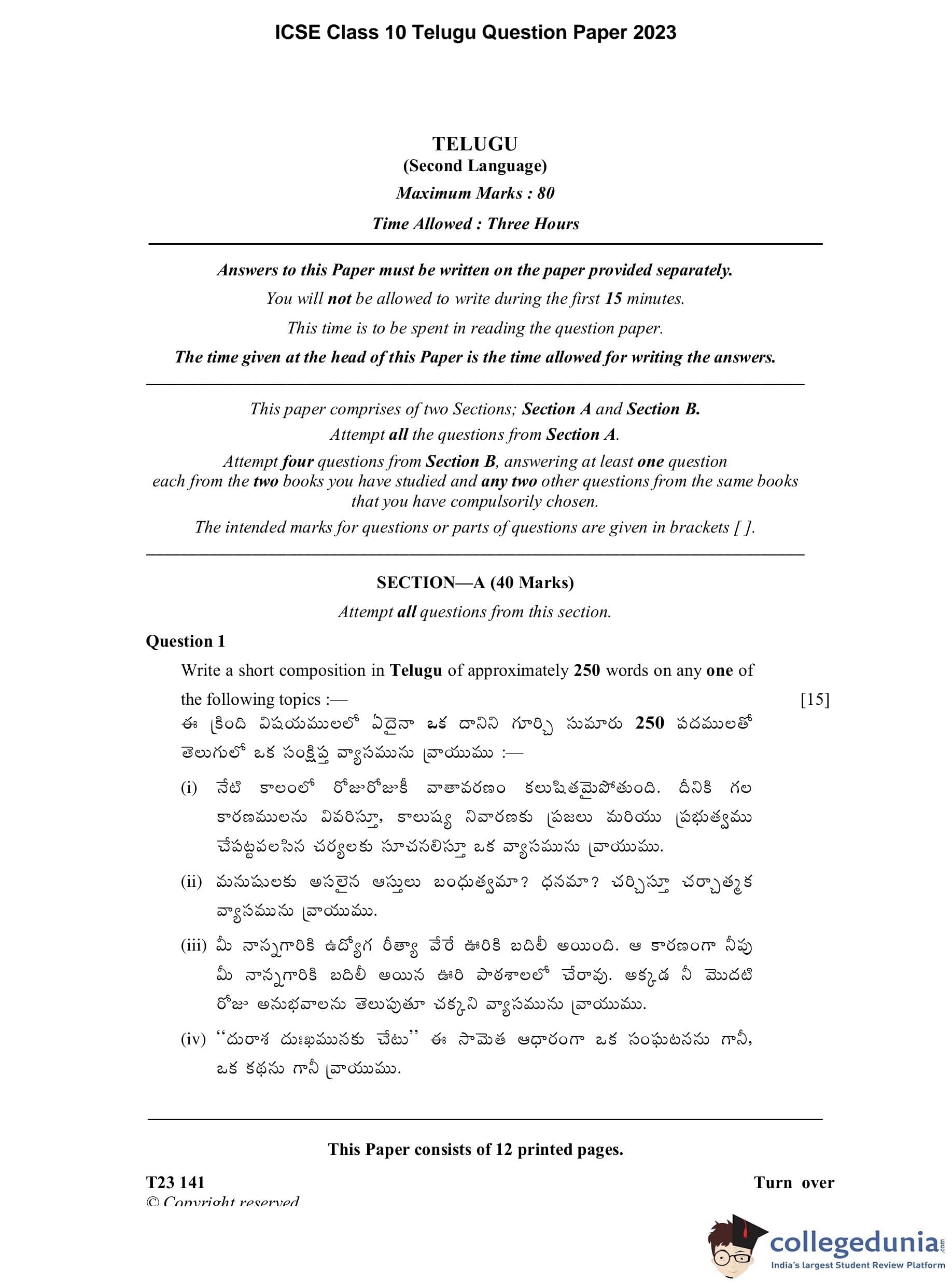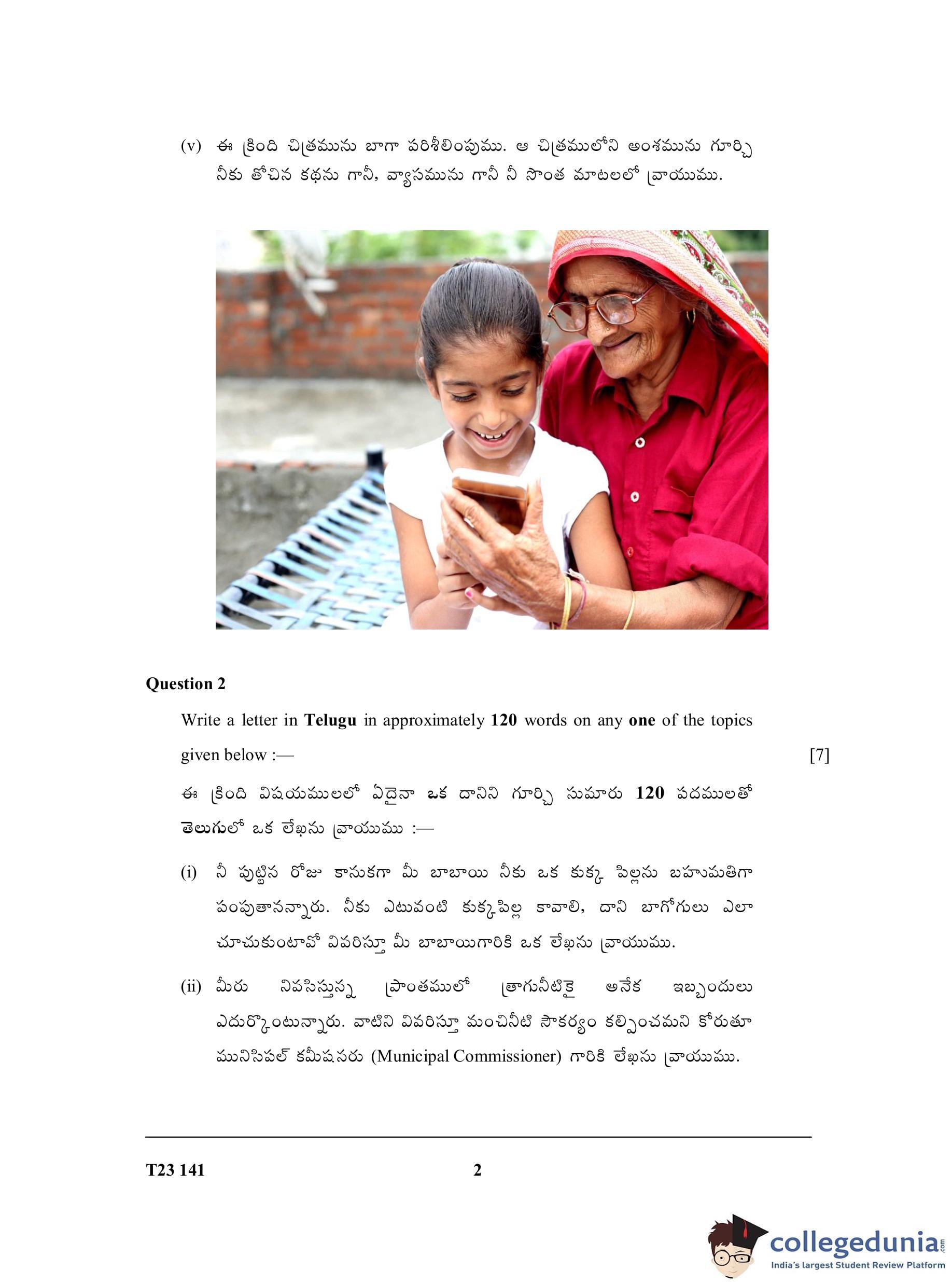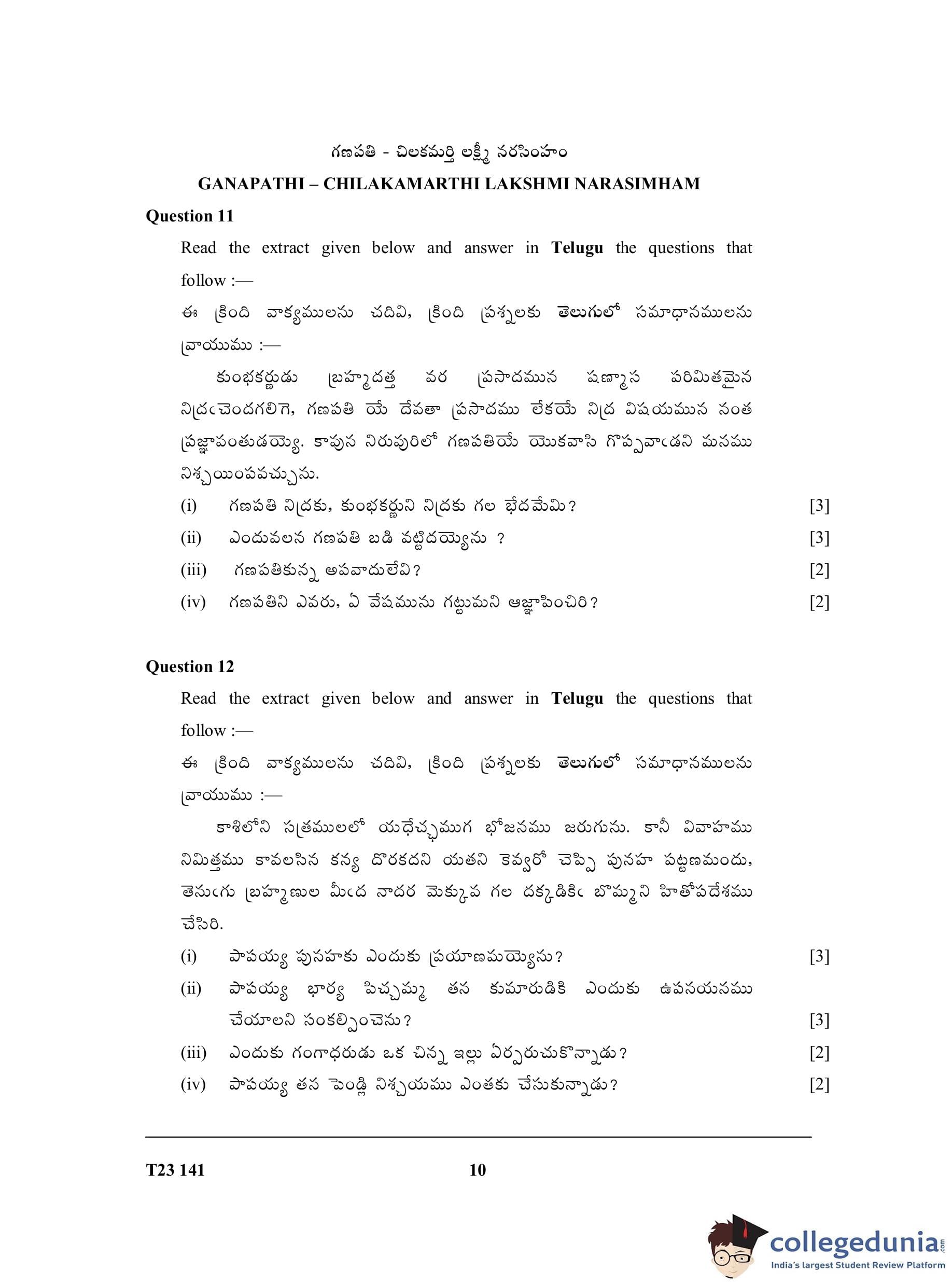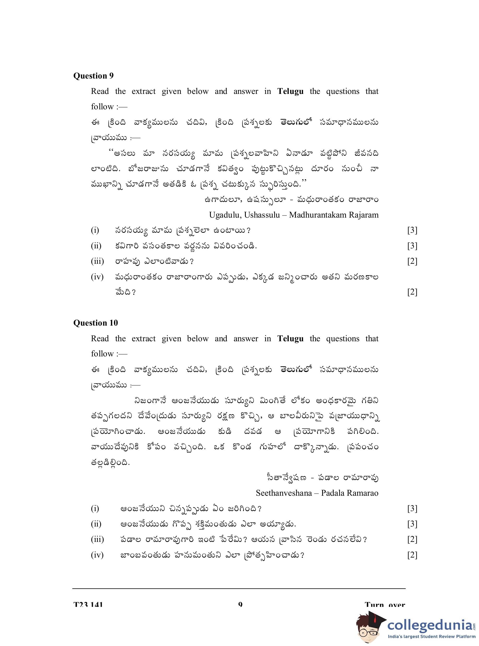 ICSE Class 10 Telugu Question Paper 2023 with Answer Key