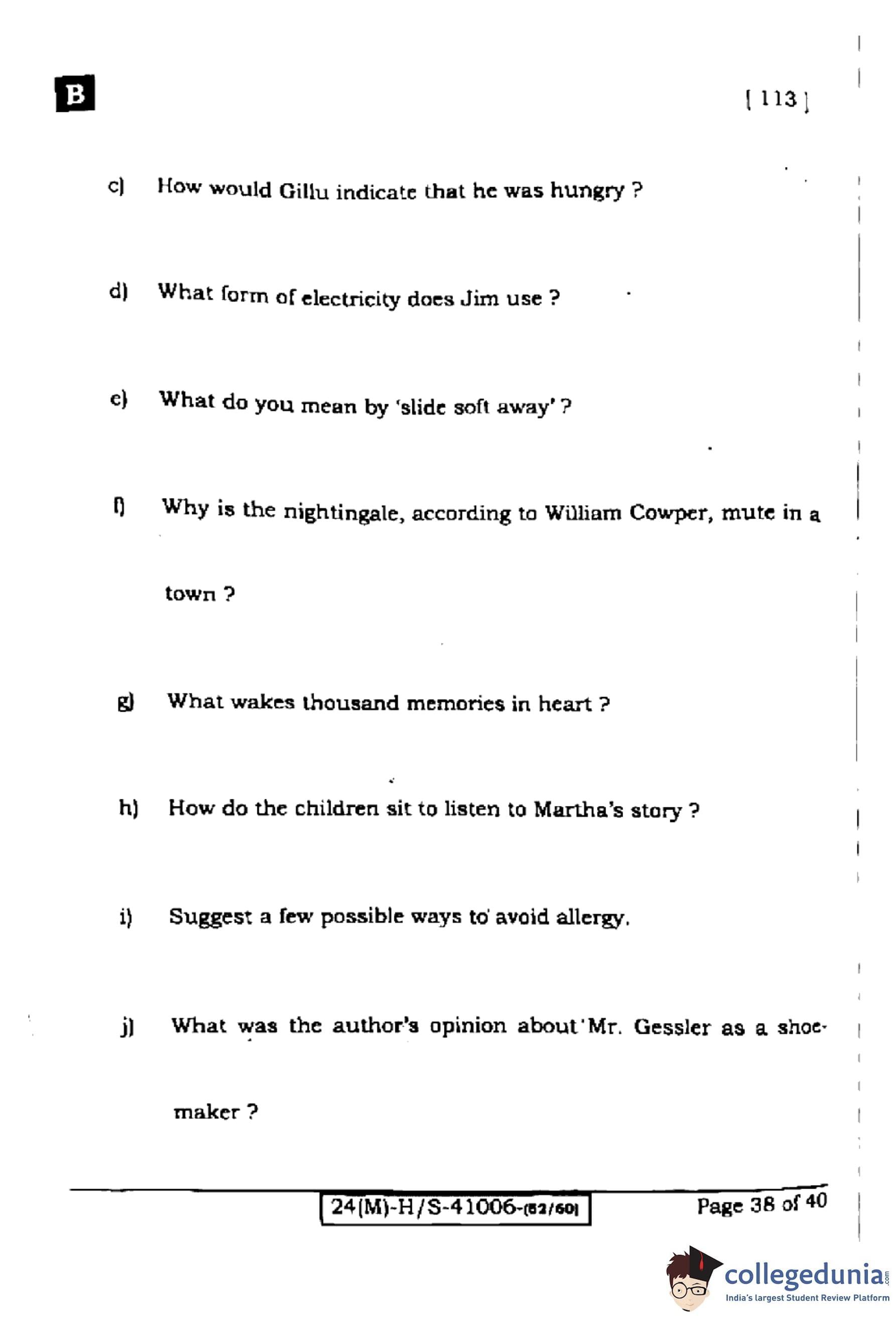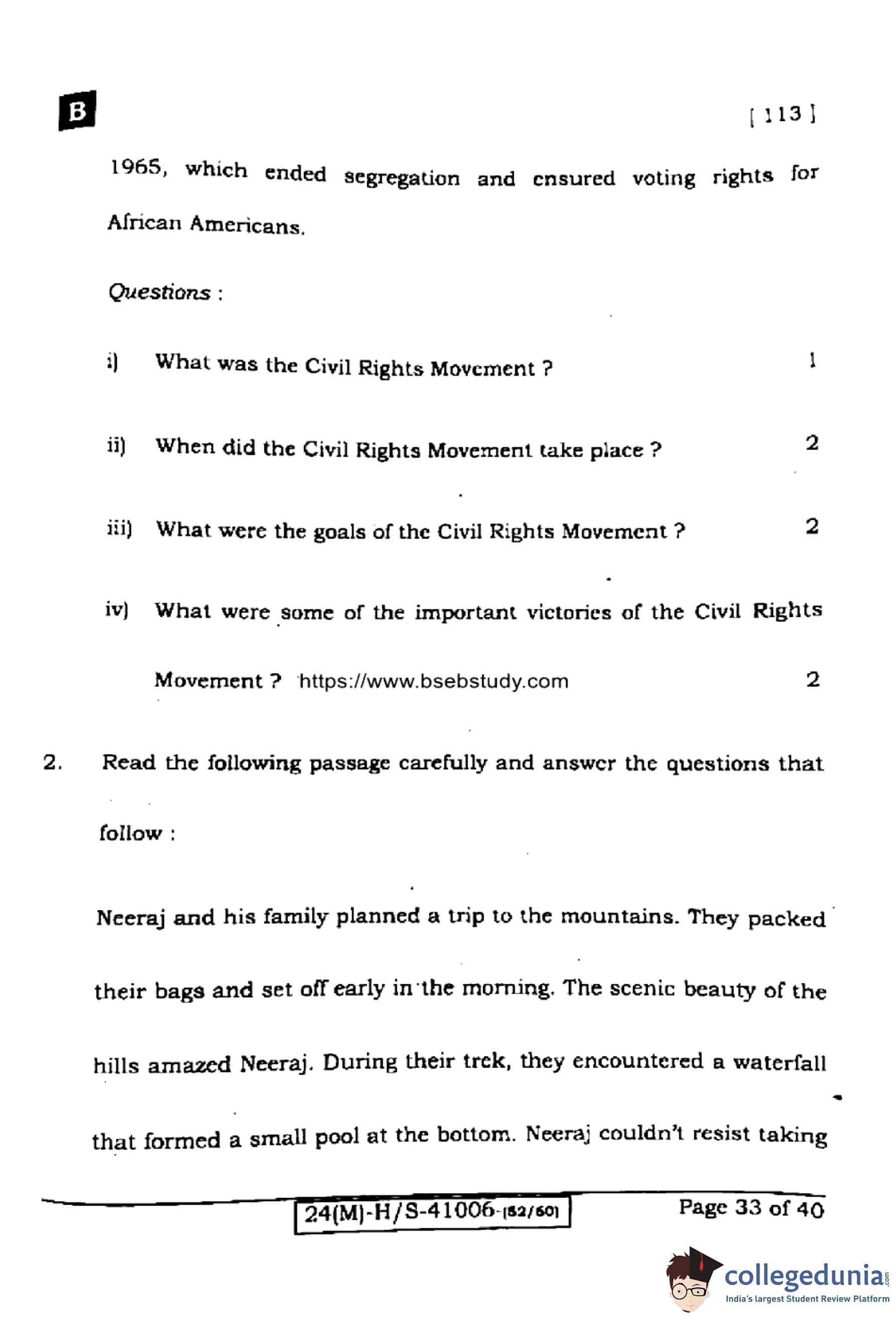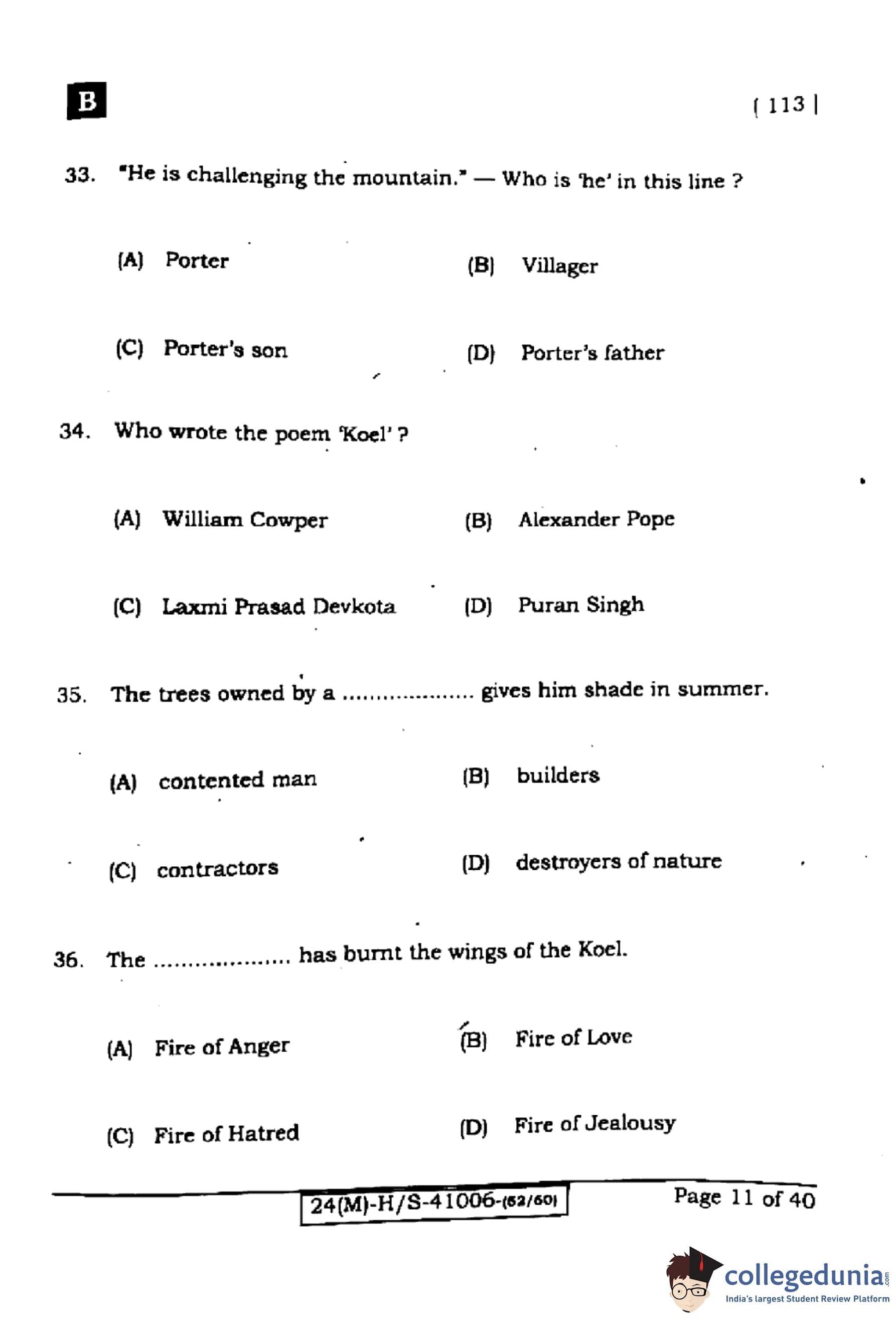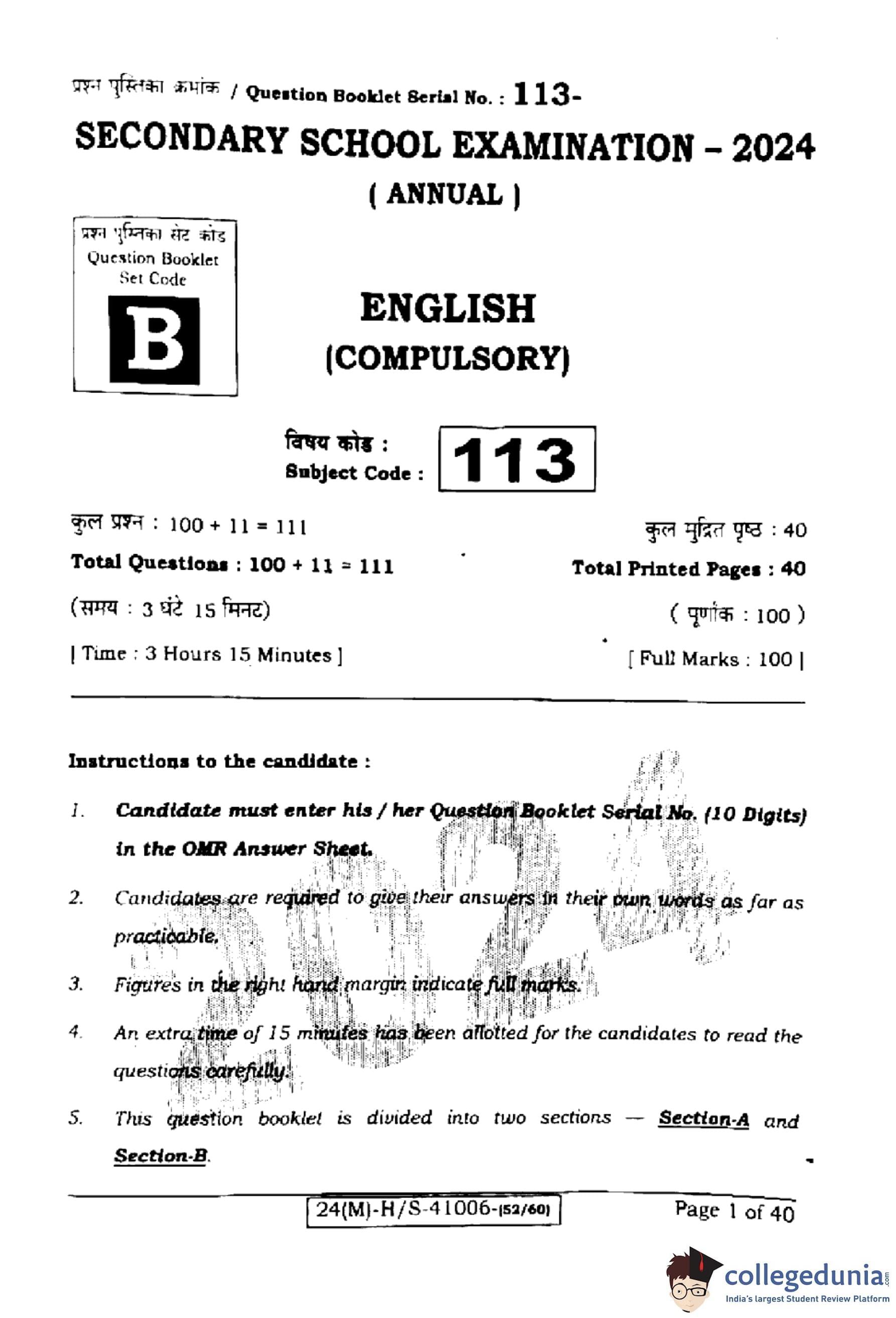 Bihar Board Class 10 English Question Paper 2024 ( SET B) with Answer Key (Shift 1)