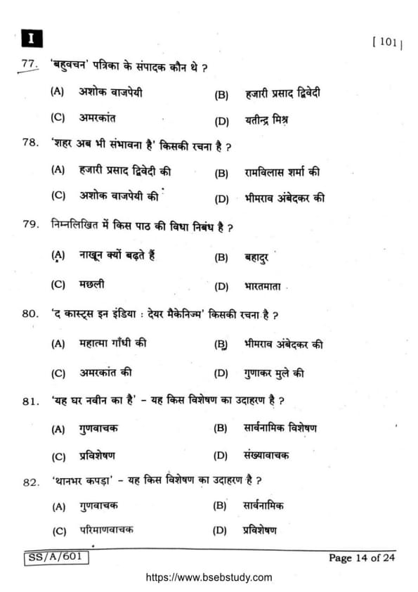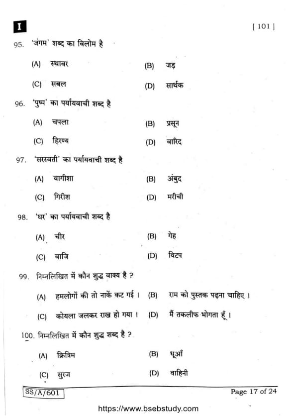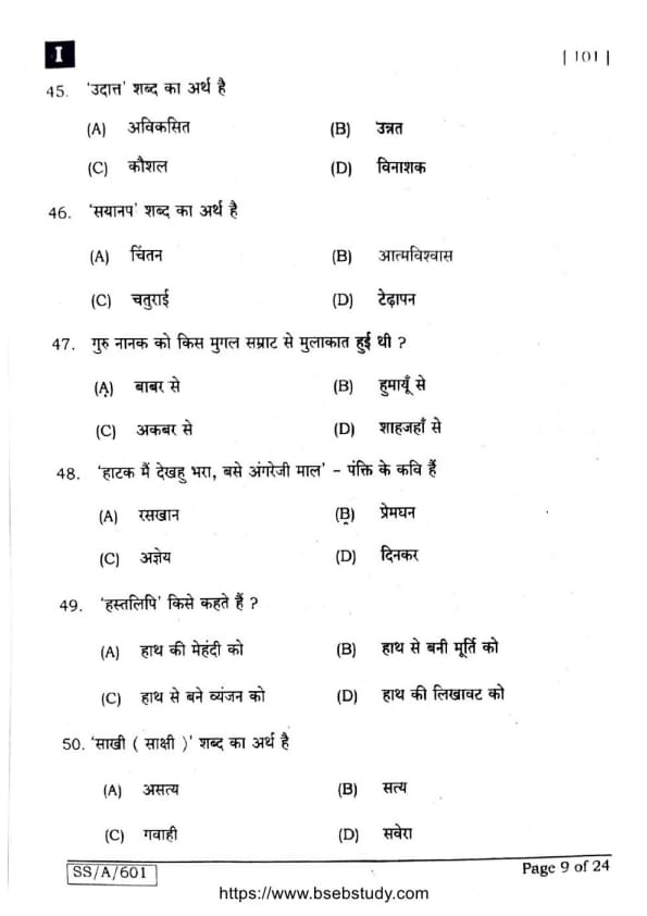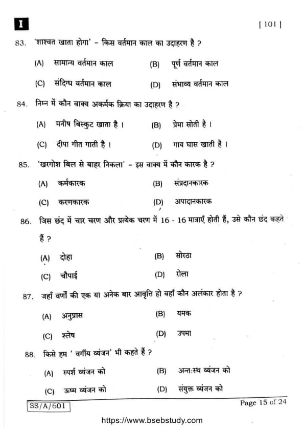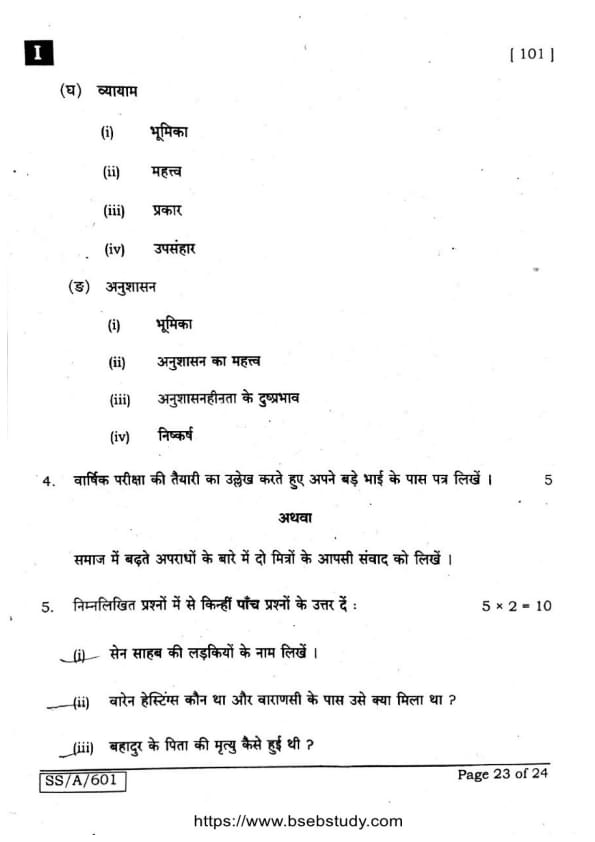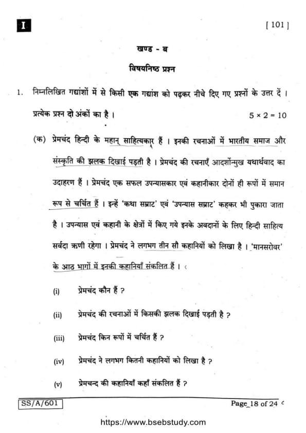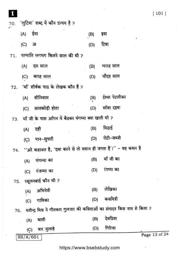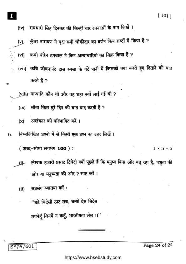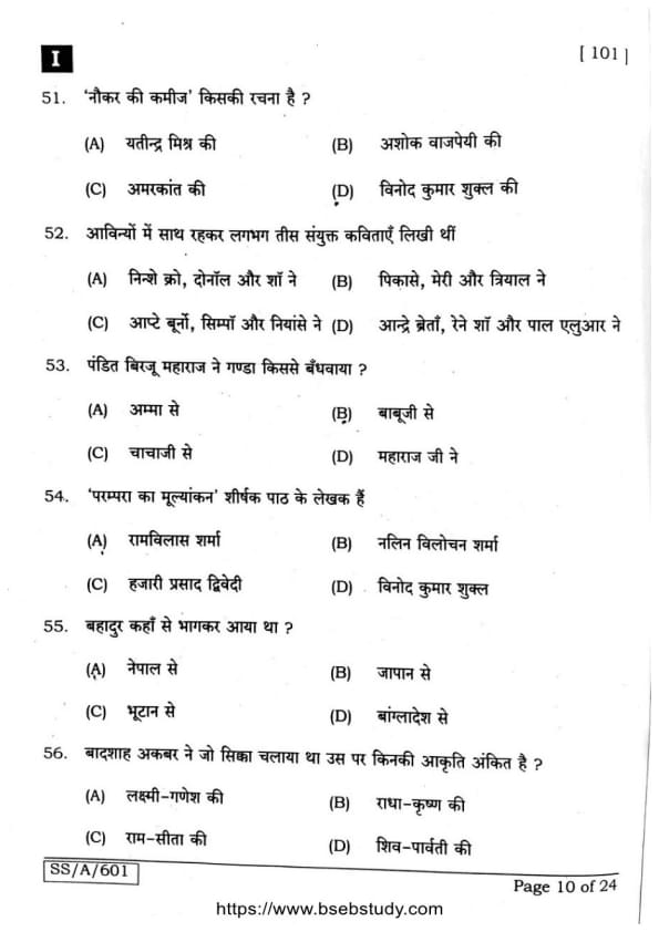 Bihar Board Class 10 Hindi (MT) Question Paper 2025 (Code 101 Set-I) with Solutions