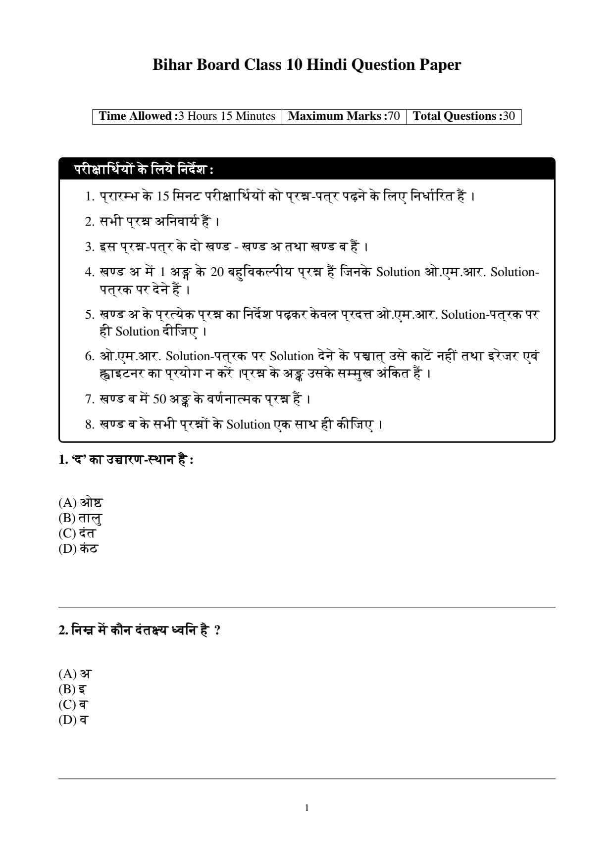 | Bihar Board Class 10 Hindi Question Paper 2026 | Download | Check Solutions |