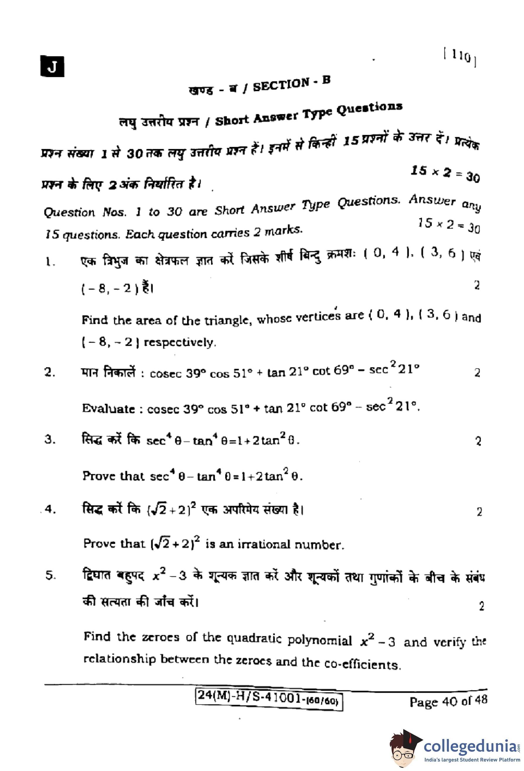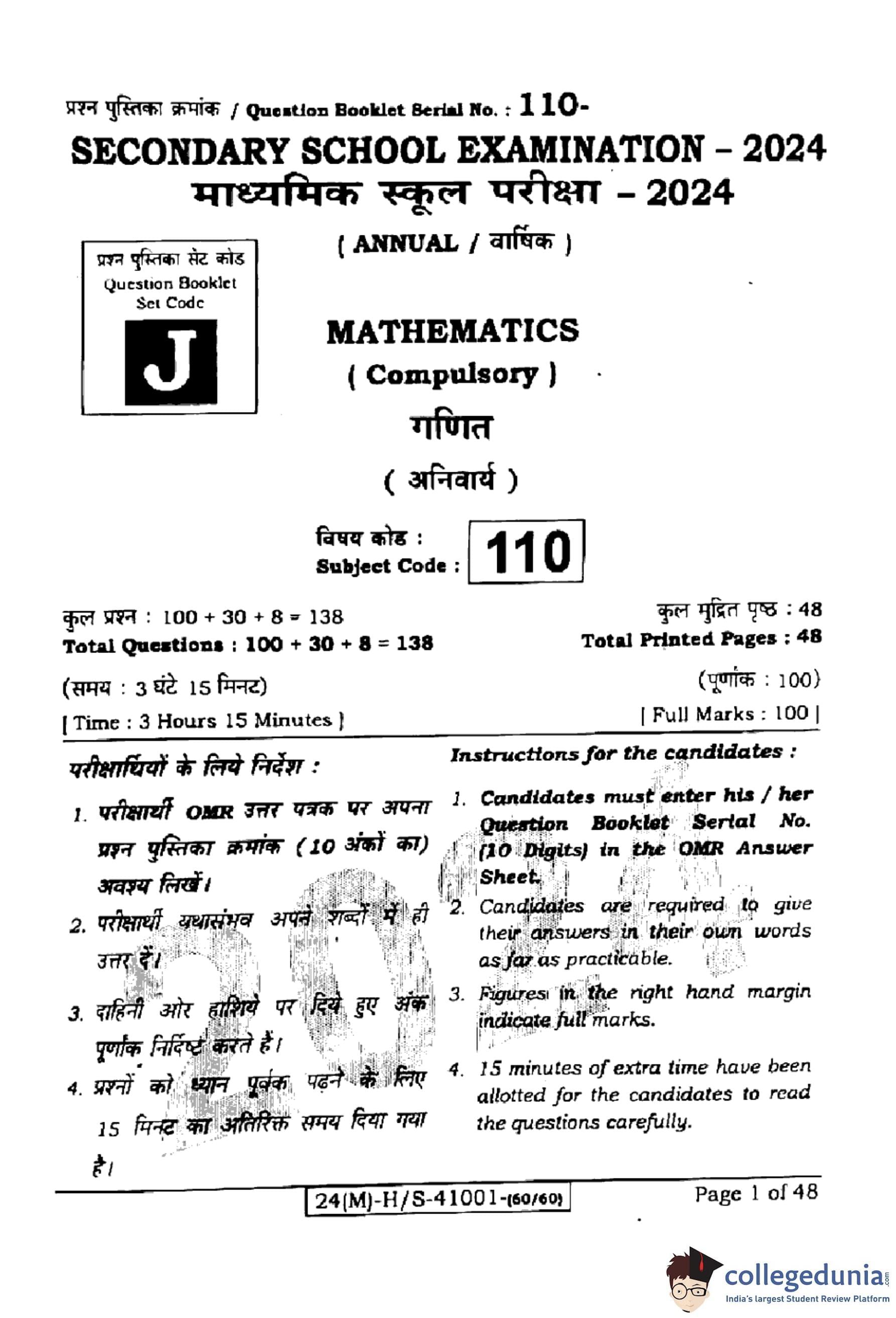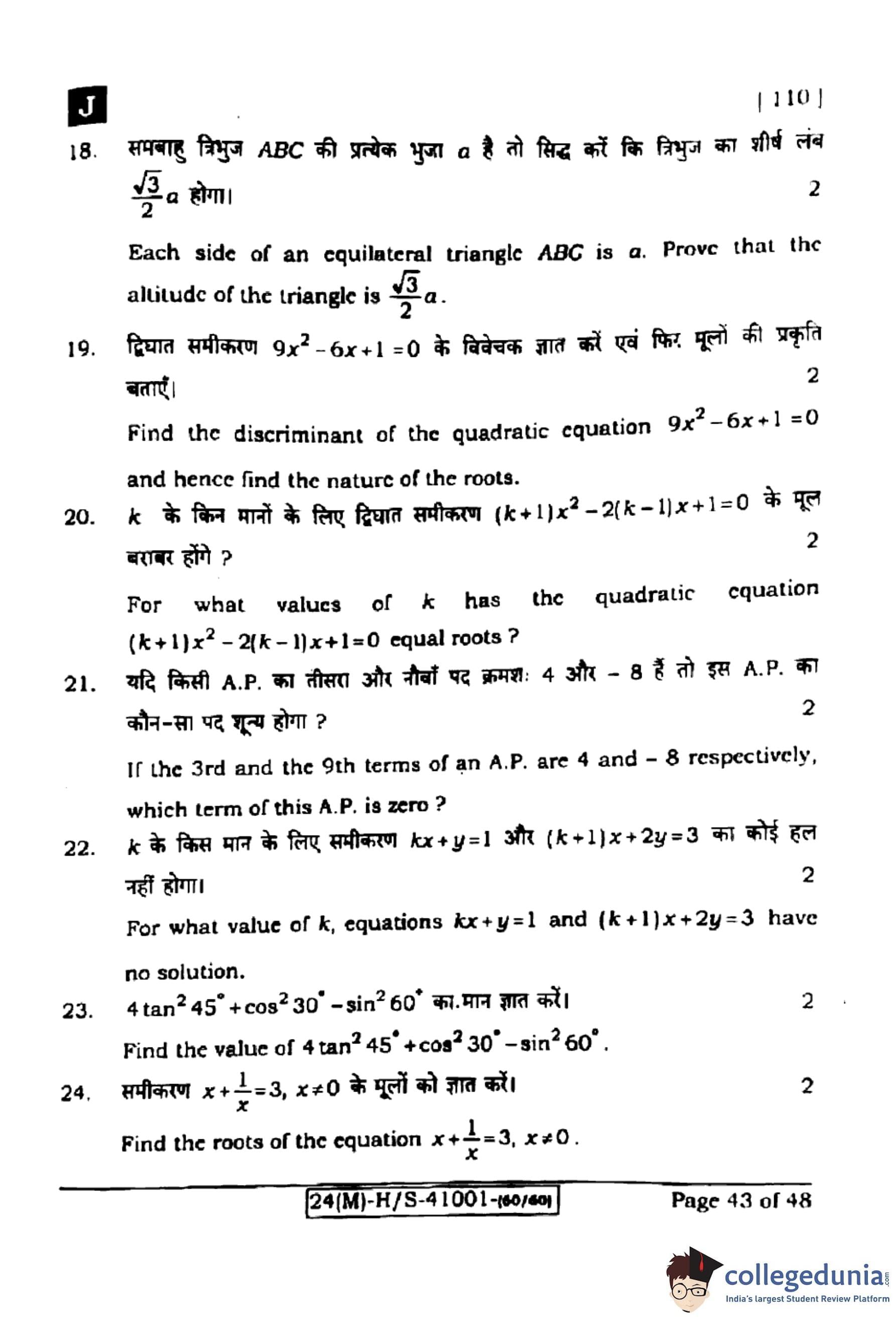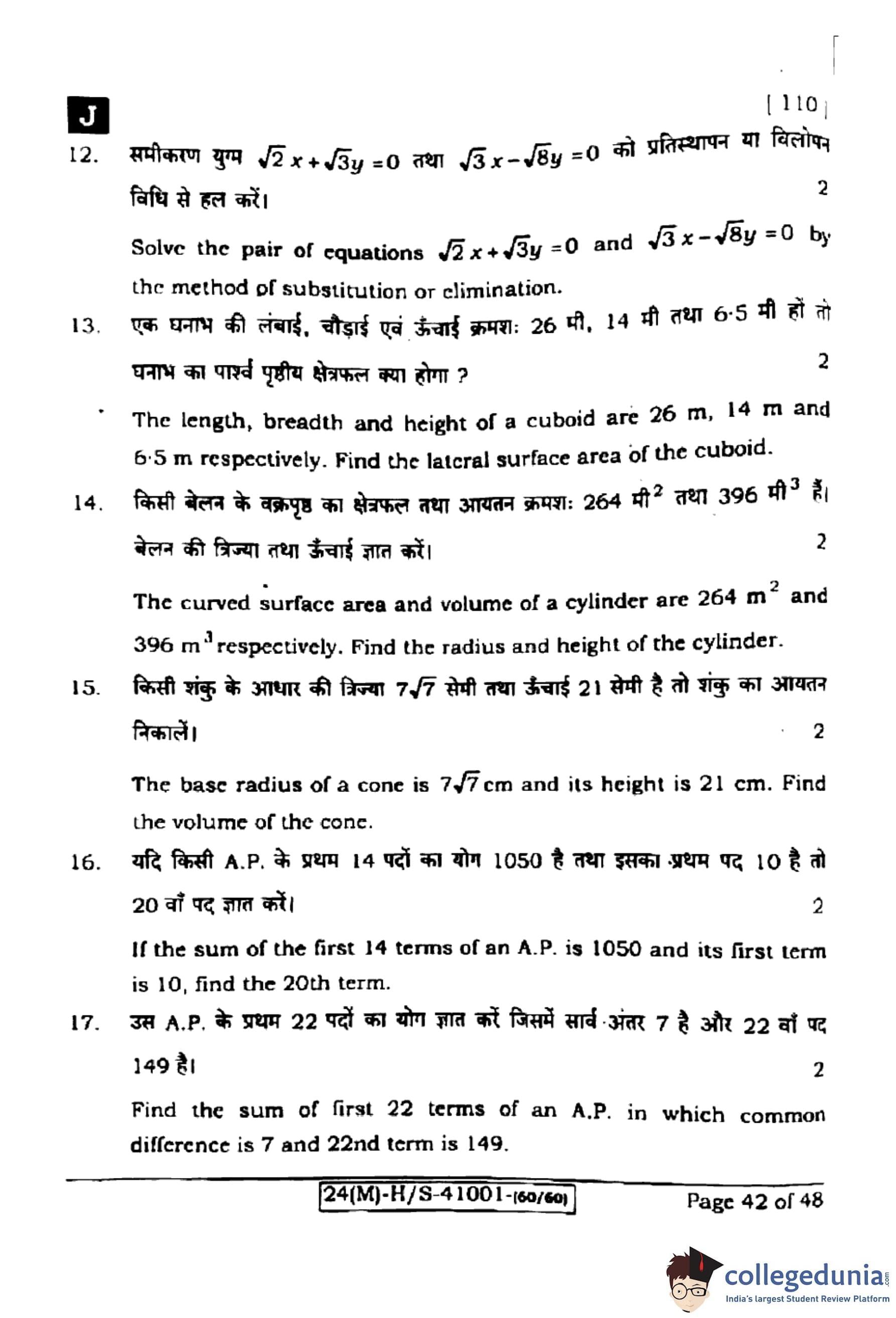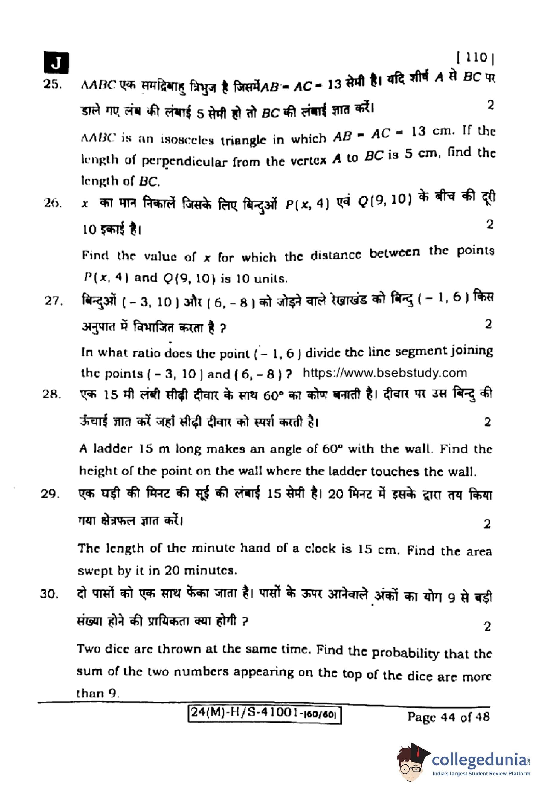 Bihar Board Class 10 (Set J) Maths Question Paper 2024 with Solutions