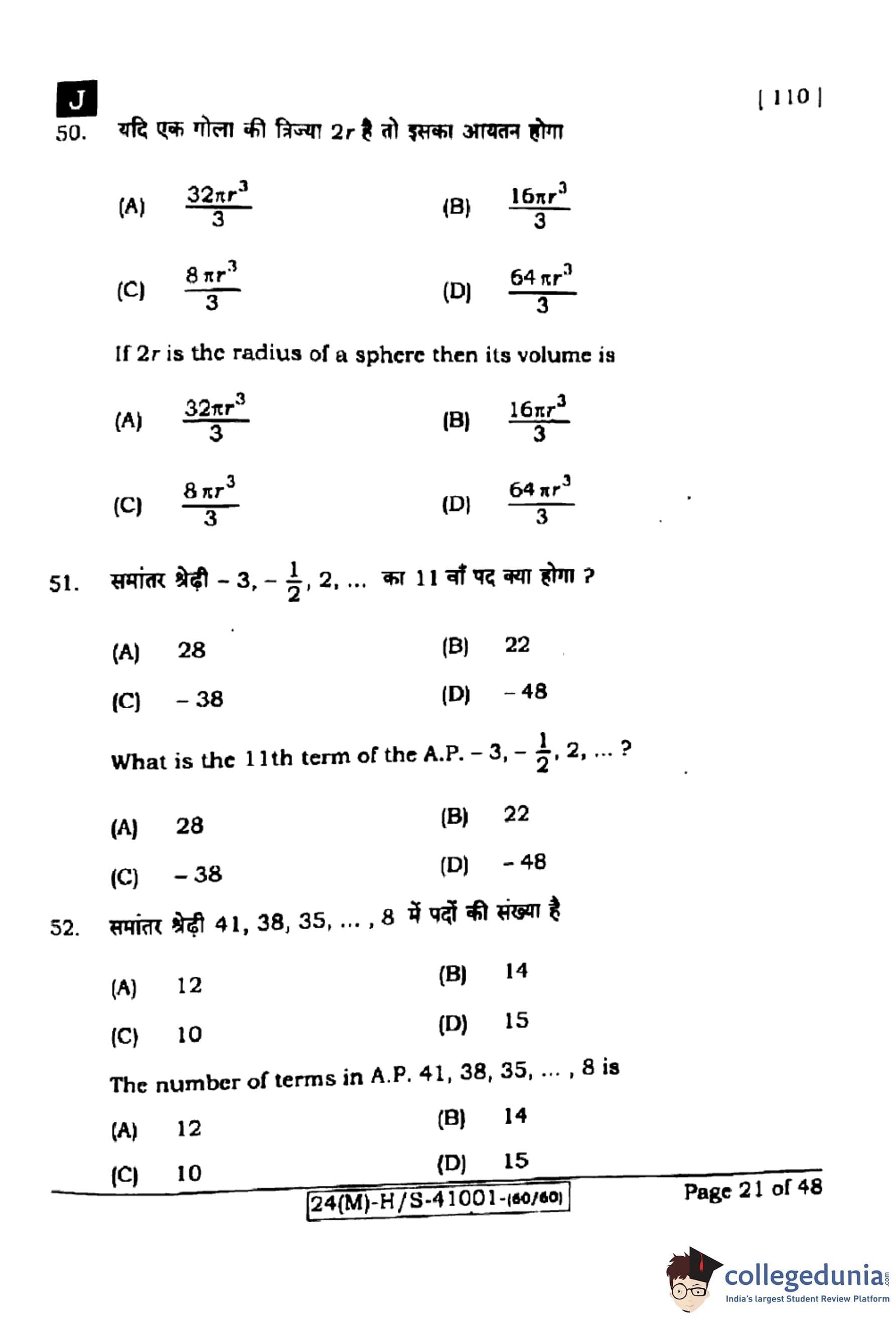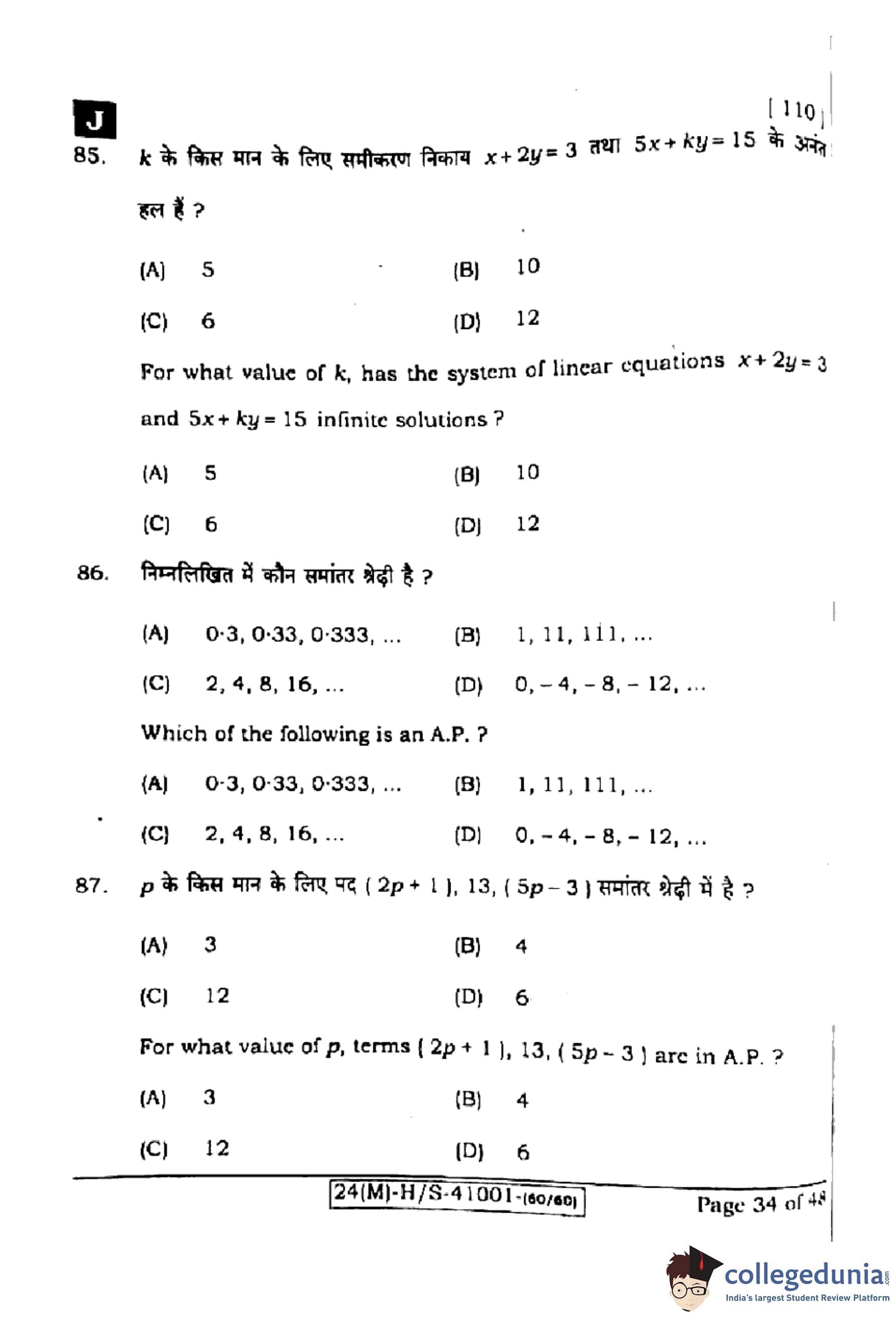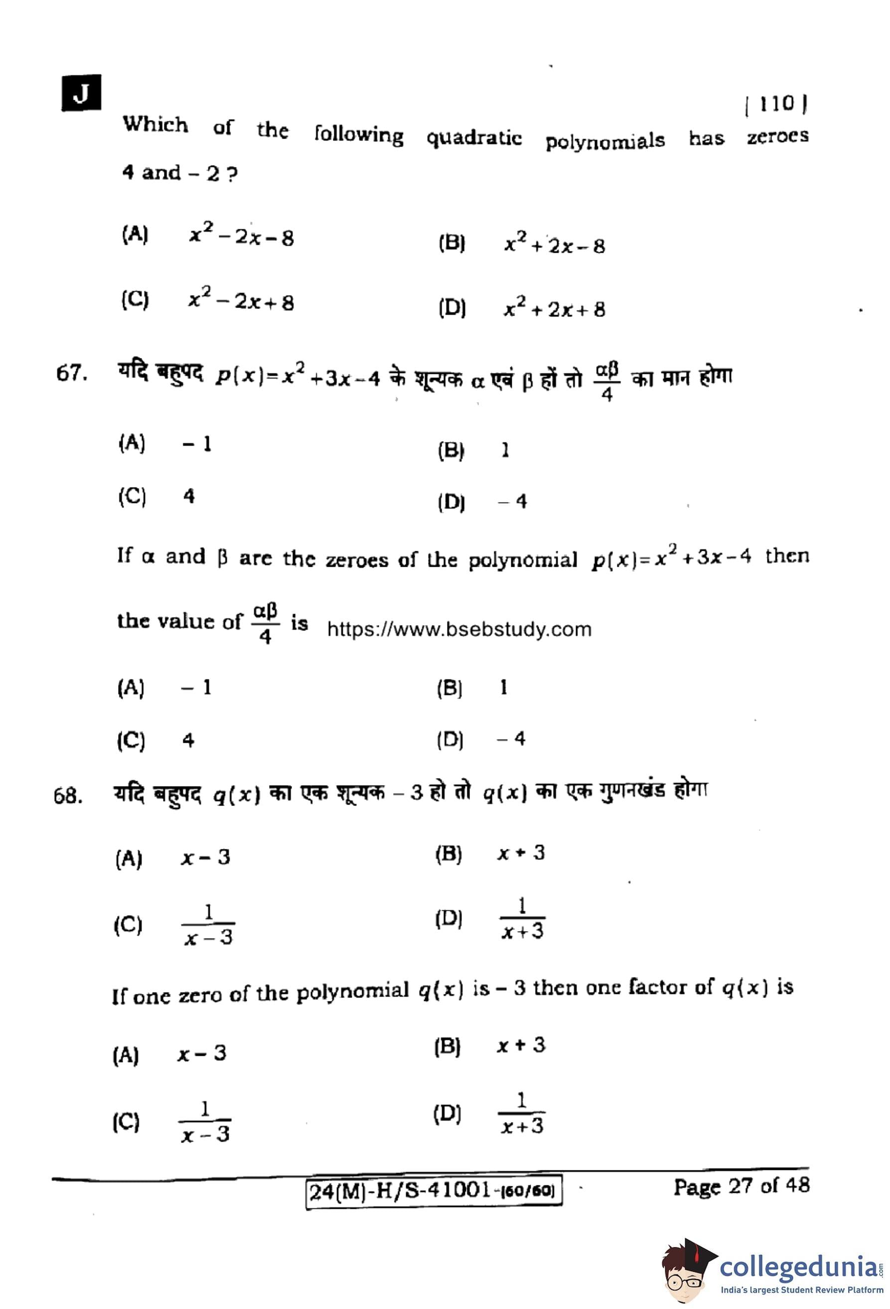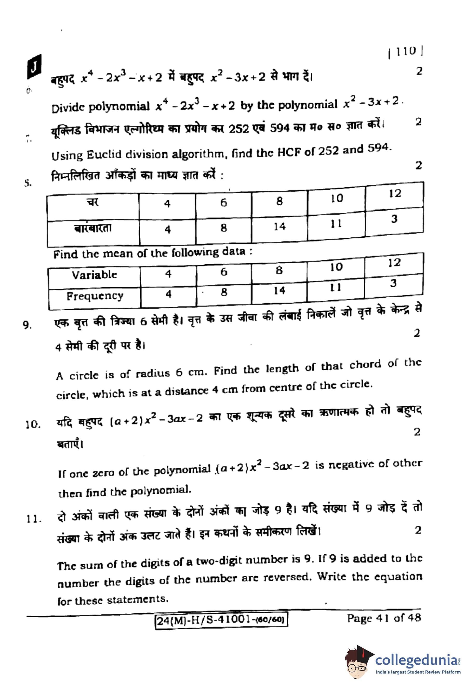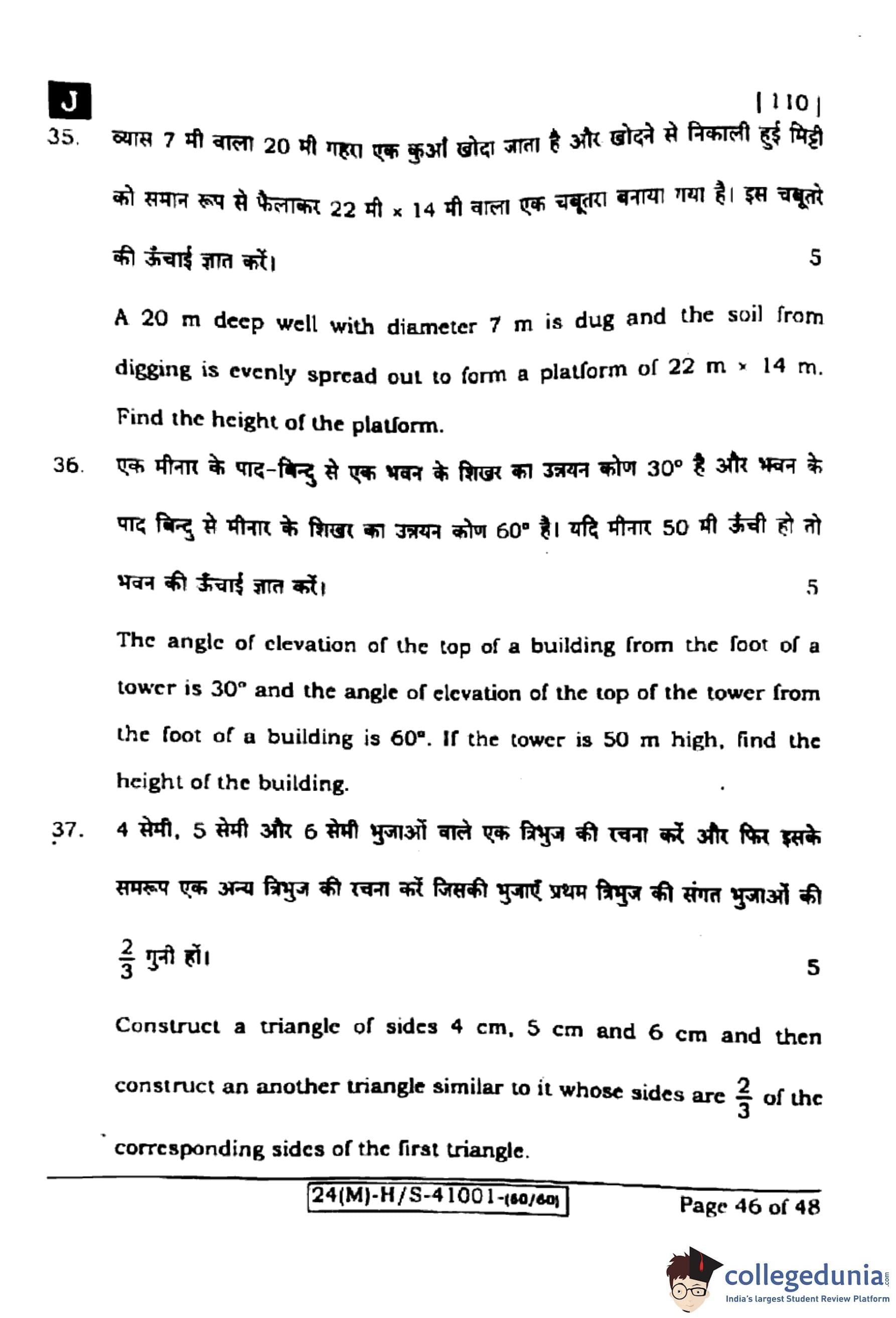 Bihar Board Class 10 (Set J) Maths Question Paper 2024 with Solutions