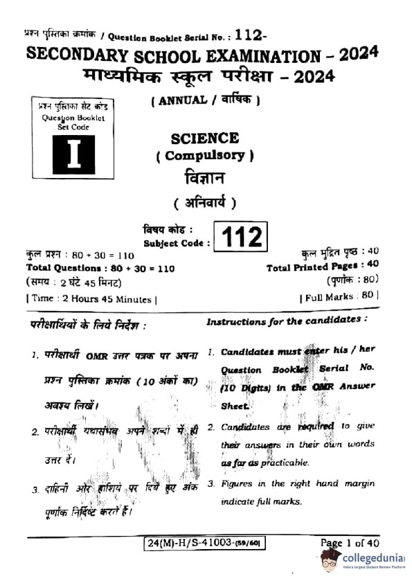 Bihar Board Class 10 Science (Set 1 Shift 1) Question Paper 2024 with Solutions