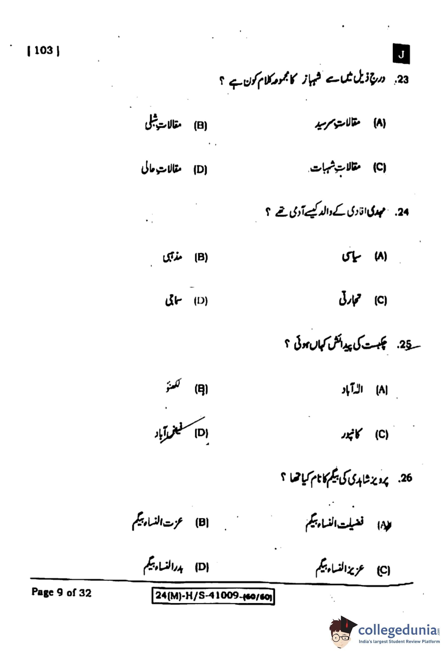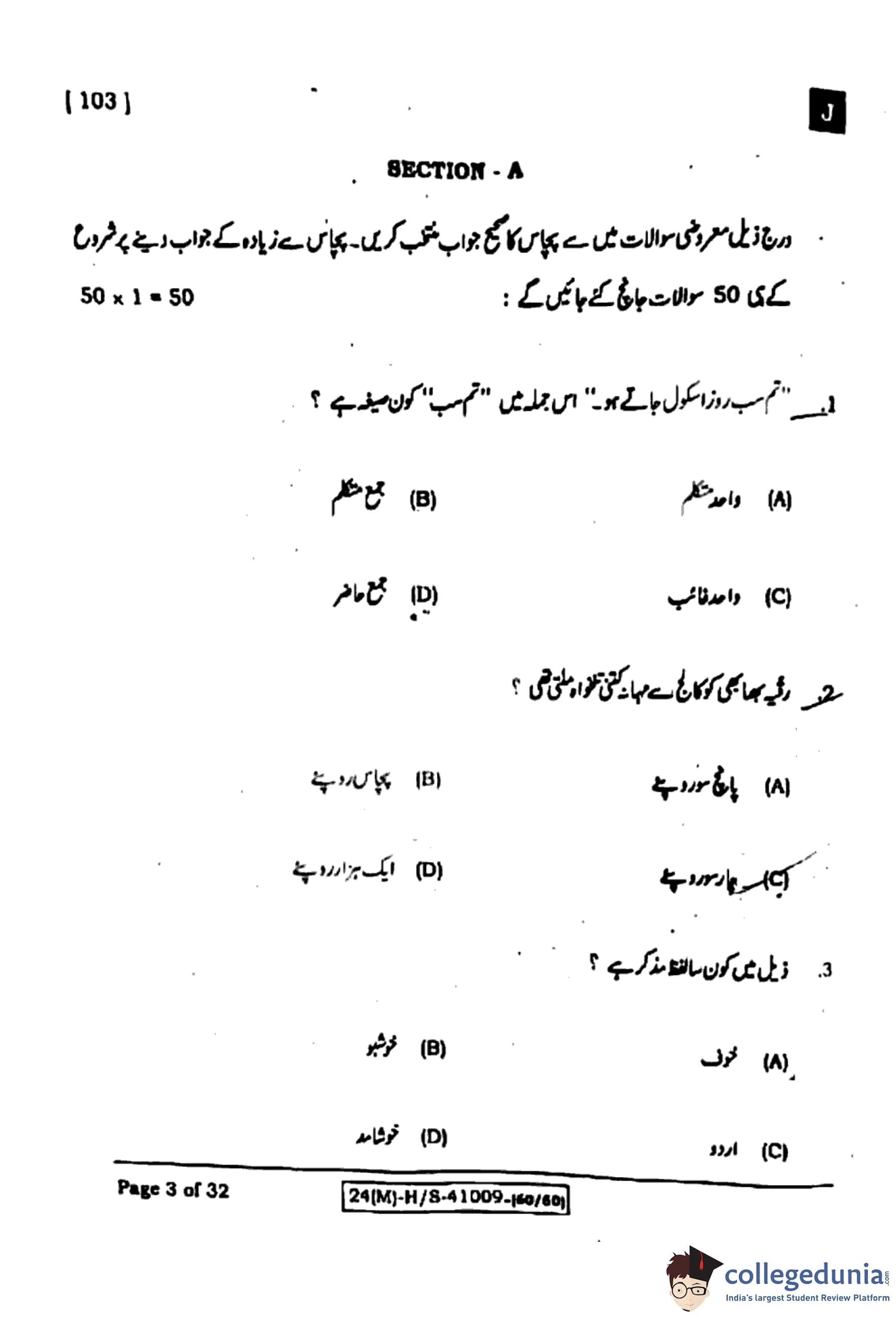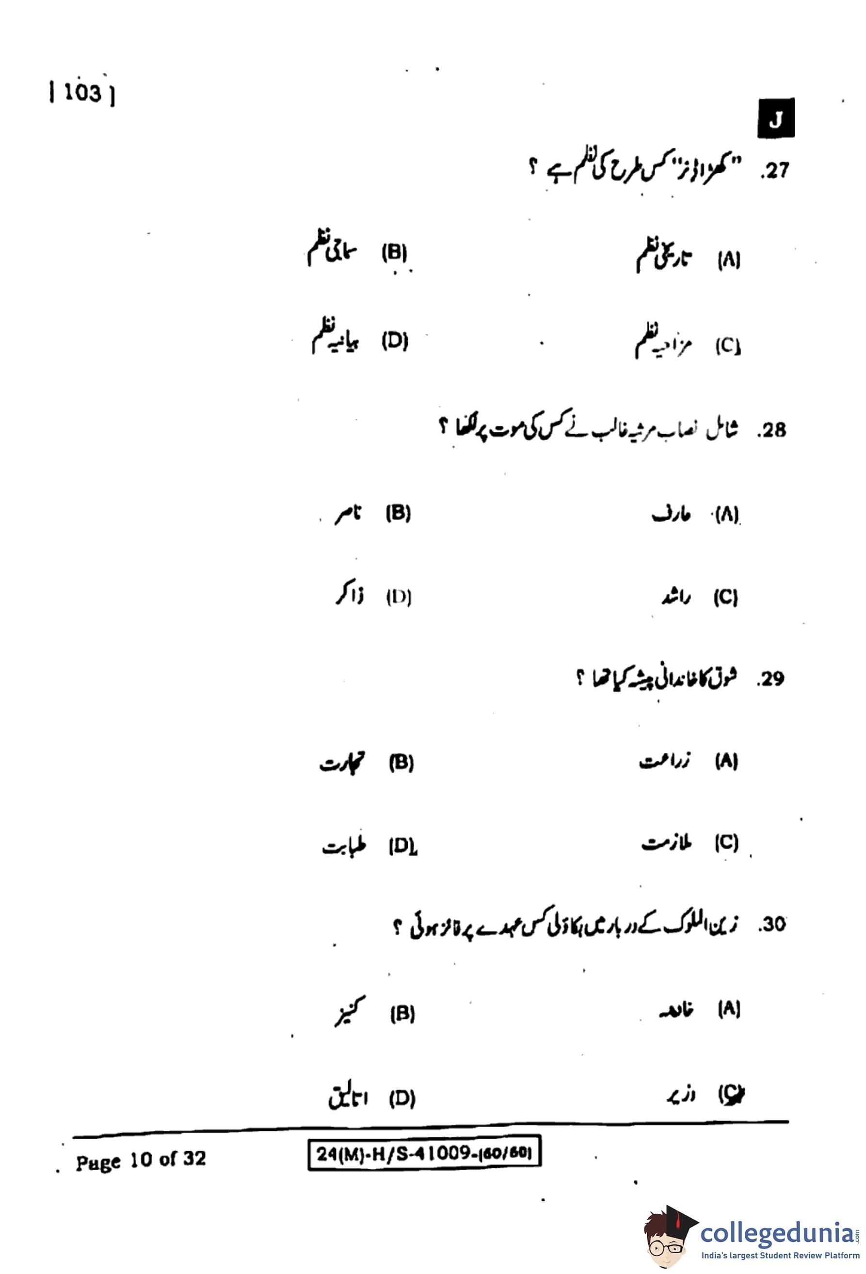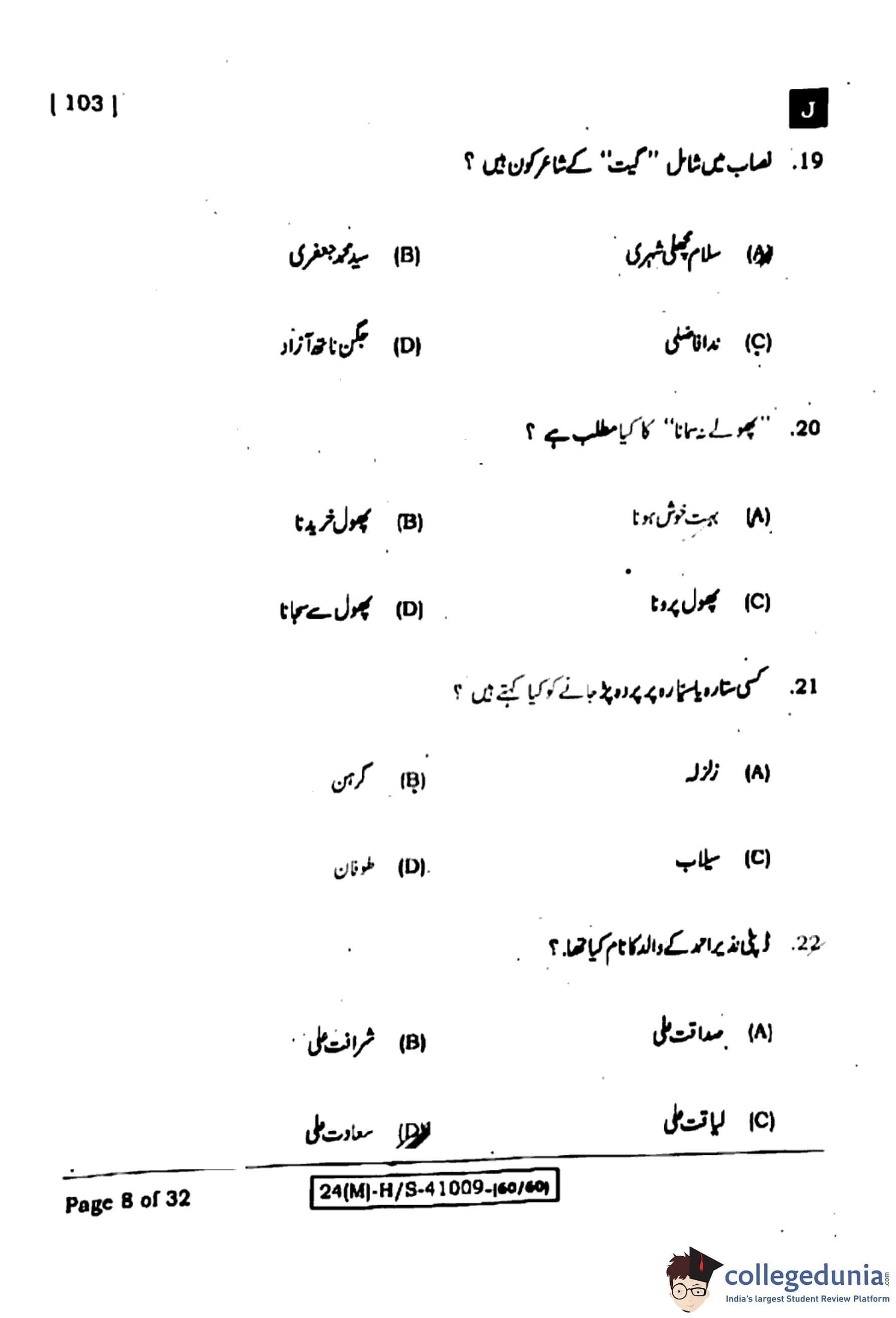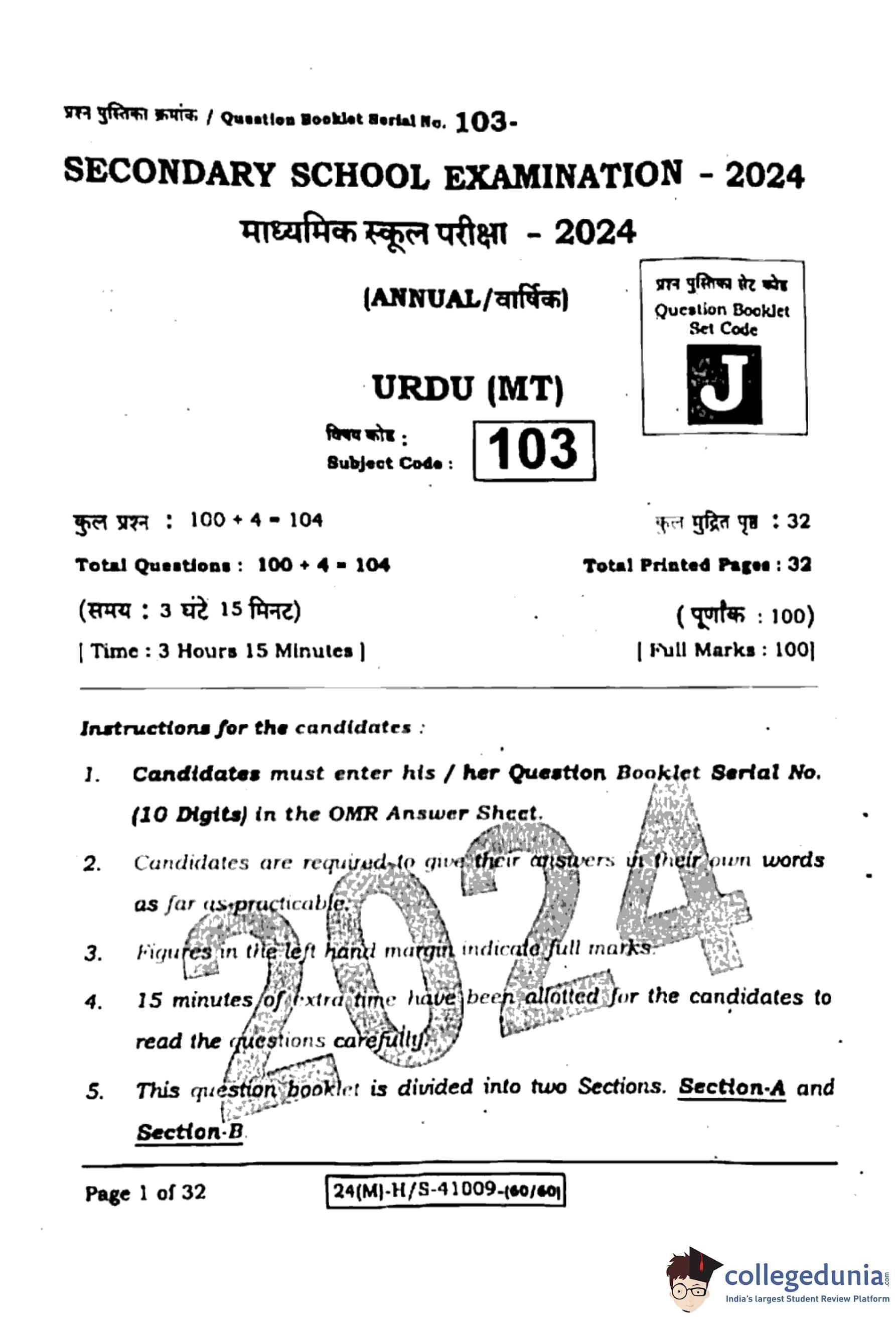 Bihar Board Class 10 Urdu Question Paper 2024 (SET J) with Answer Key (Shift 1)
