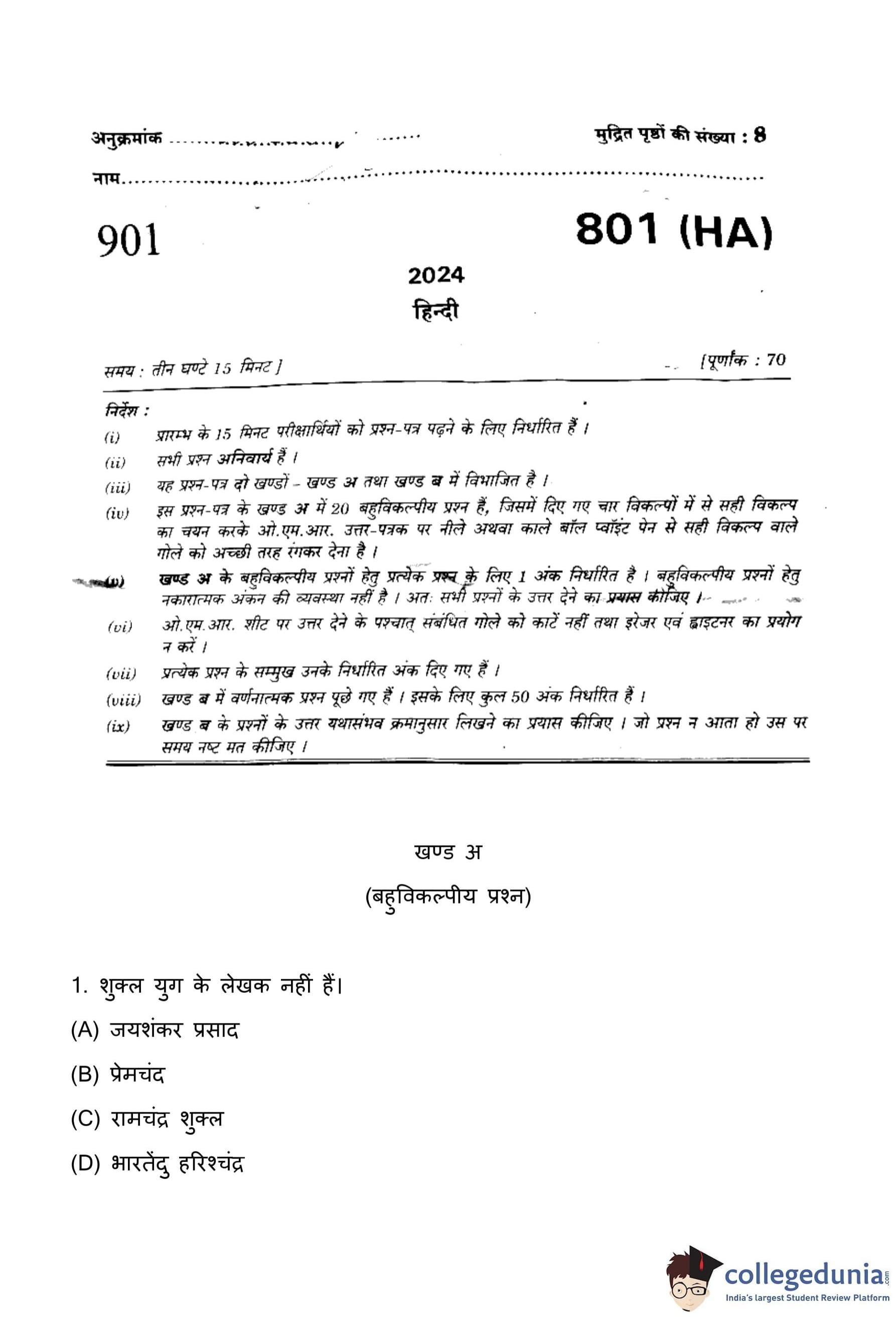 UP Board Class 10 Hindi Question Paper 2024 (Code 801 HA) with Solutions