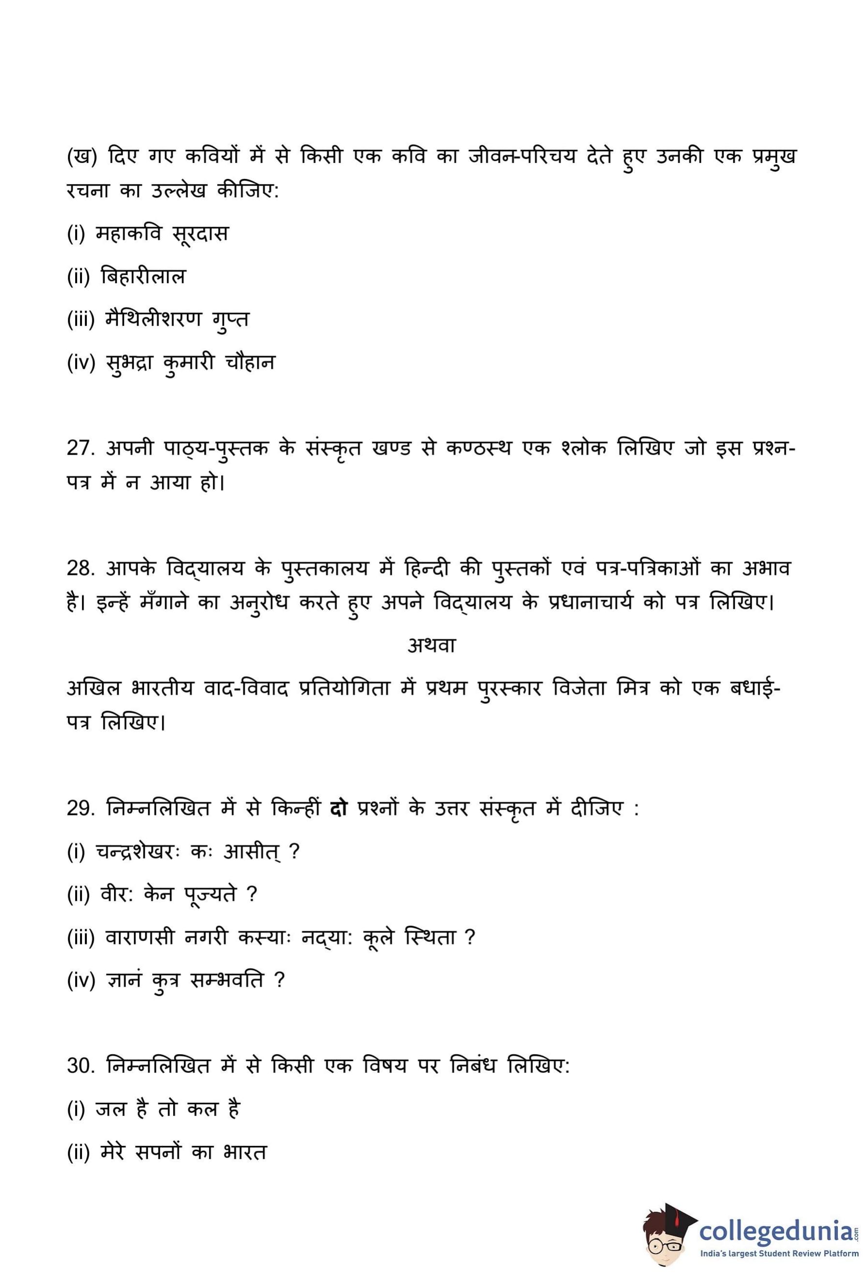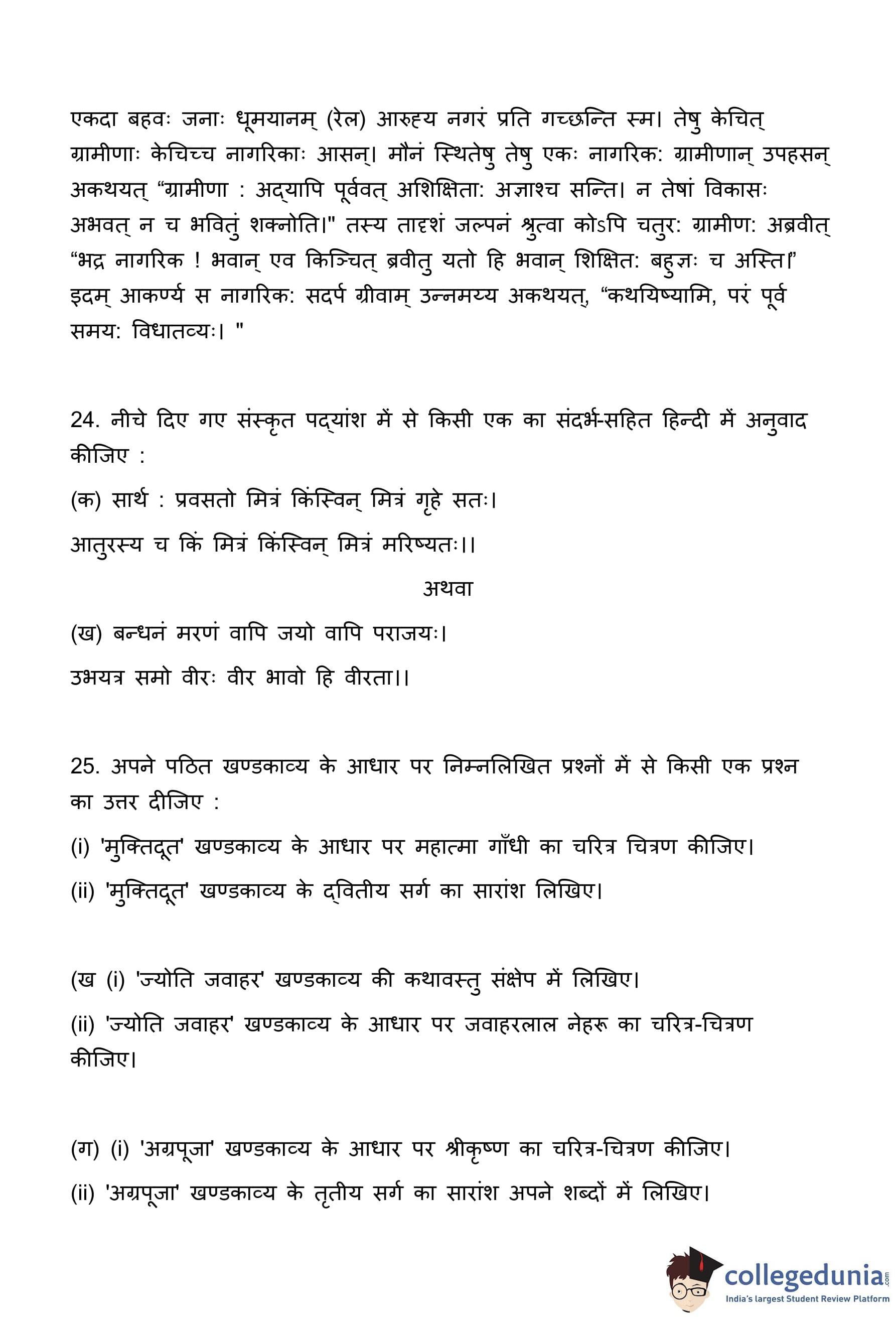 प्रश्न में पाठ्य-पुस्तक से याद किया हुआ कोई एक संस्कृत श्लोक लिखने के लिए कहा गया है, लेकिन यह श्लोक इस प्रश्न-पत्र में पहले से दिए गए श्लोकों (प्रश्न 24 के) से भिन्न होना चाहिए।