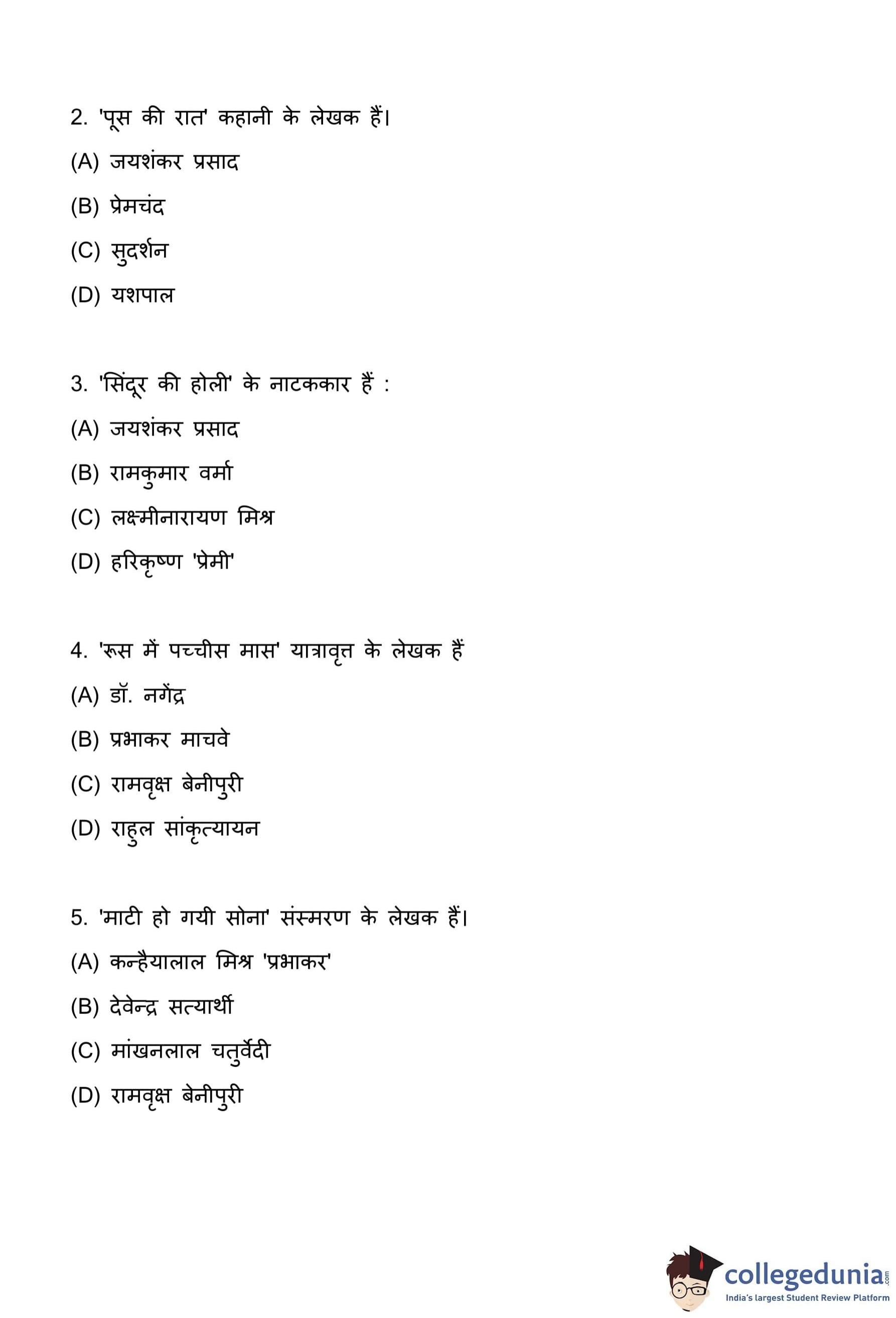 Quick Tip: प्रश्न में उल्लिखित विधा (जैसे संस्मरण, यात्रावृत्त, नाटक) पर ध्यान दें। यह सही लेखक के लिए एक सुराग प्रदान कर सकता है, क्योंकि कुछ लेखक विशिष्ट विधाओं के विशेषज्ञ थे।