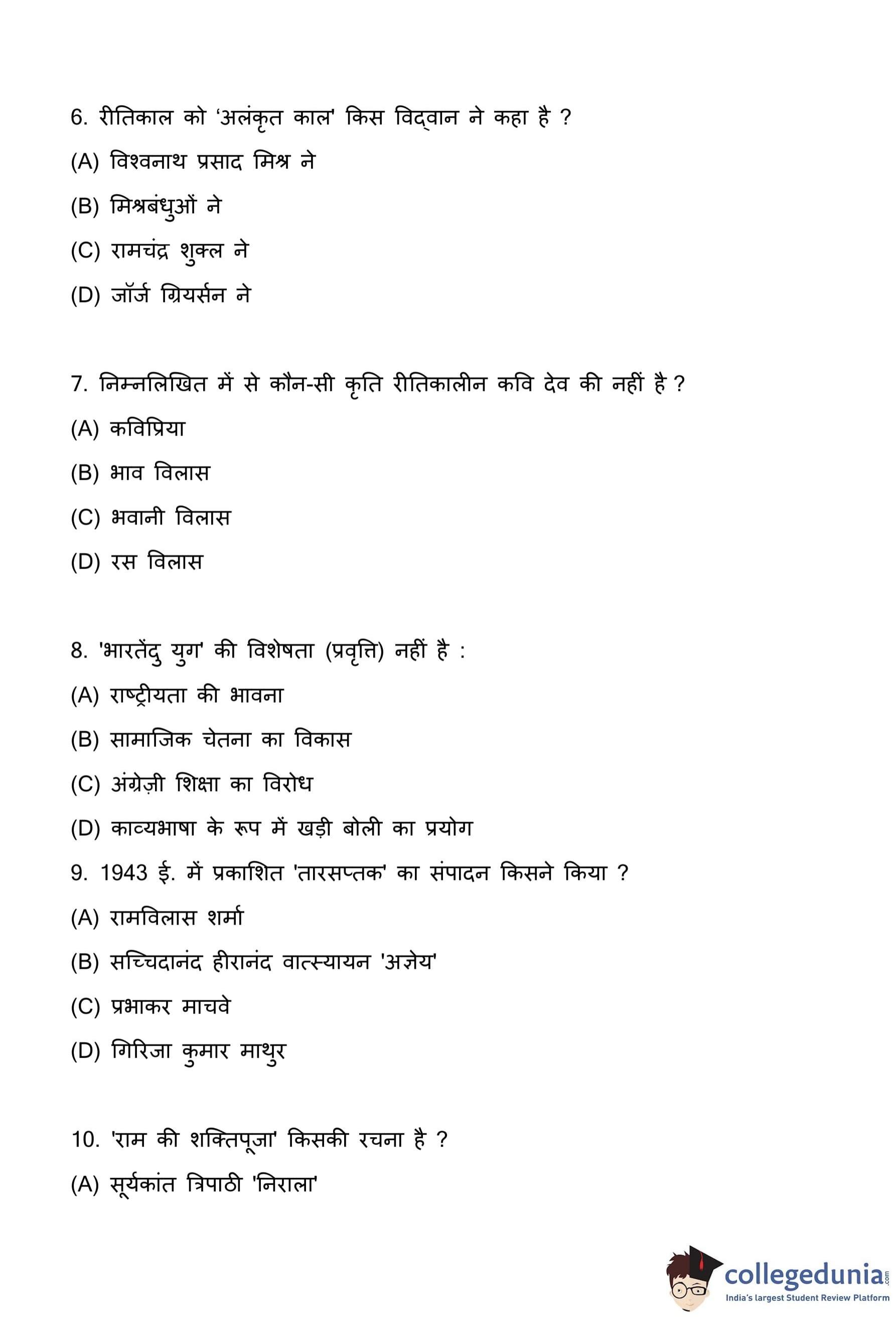 Quick Tip: रीतिकाल के लिए, केशवदास, बिहारी, भूषण और देव जैसे प्रमुख कवियों पर ध्यान केंद्रित करें। प्रत्येक की कम से कम एक या दो प्रमुख कृतियों को जानना गलत विकल्पों को प्रभावी ढंग से समाप्त करने में मदद कर सकता है।