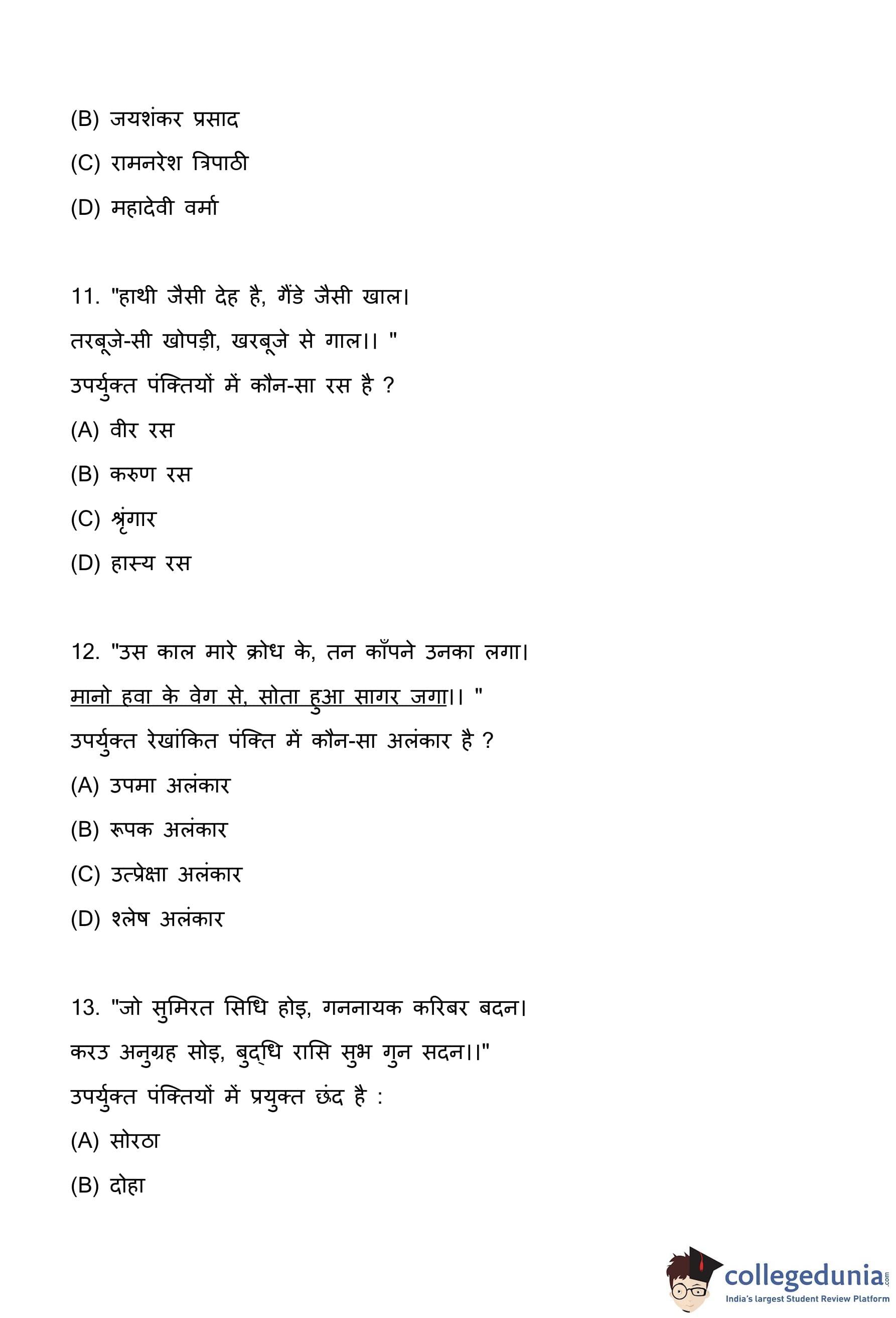 Quick Tip: प्रेमचंद, जयशंकर प्रसाद, महादेवी वर्मा और निराला जैसे प्रमुख हिंदी लेखकों की प्रसिद्ध रचनाओं (कहानी, उपन्यास, कविता) से खुद को परिचित कराएं। किसी विशेष कृति के लेखक के बारे में सीधे पूछने वाले प्रश्न बहुत आम हैं।