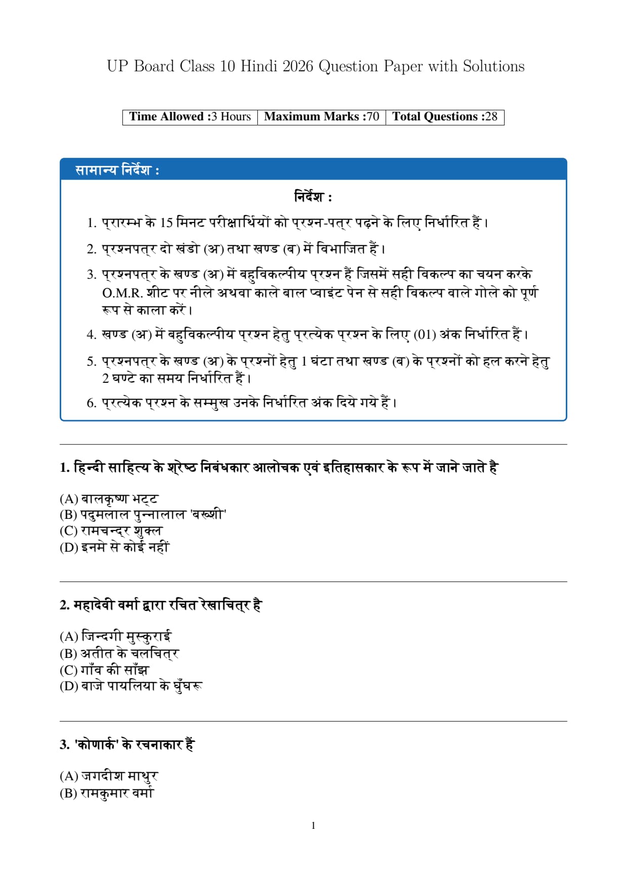 The official question paper of UP Board Class 10 Hindi Board Exam 2026 is provided below. Students can download the official paper in PDF format for reference.