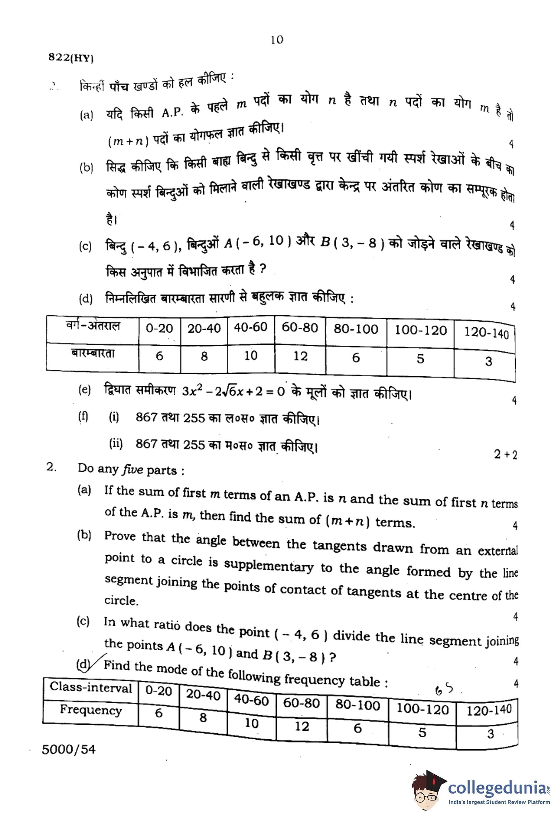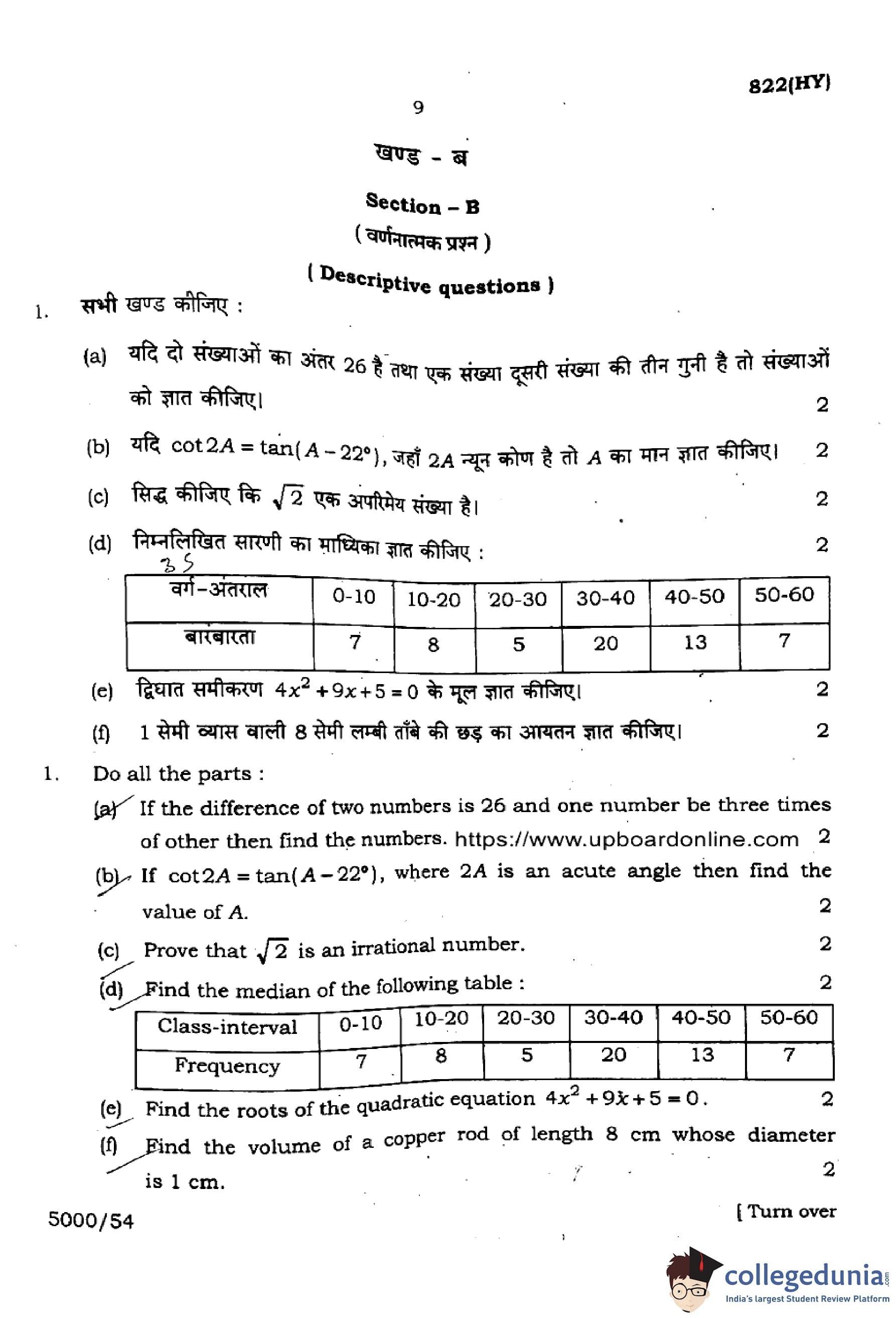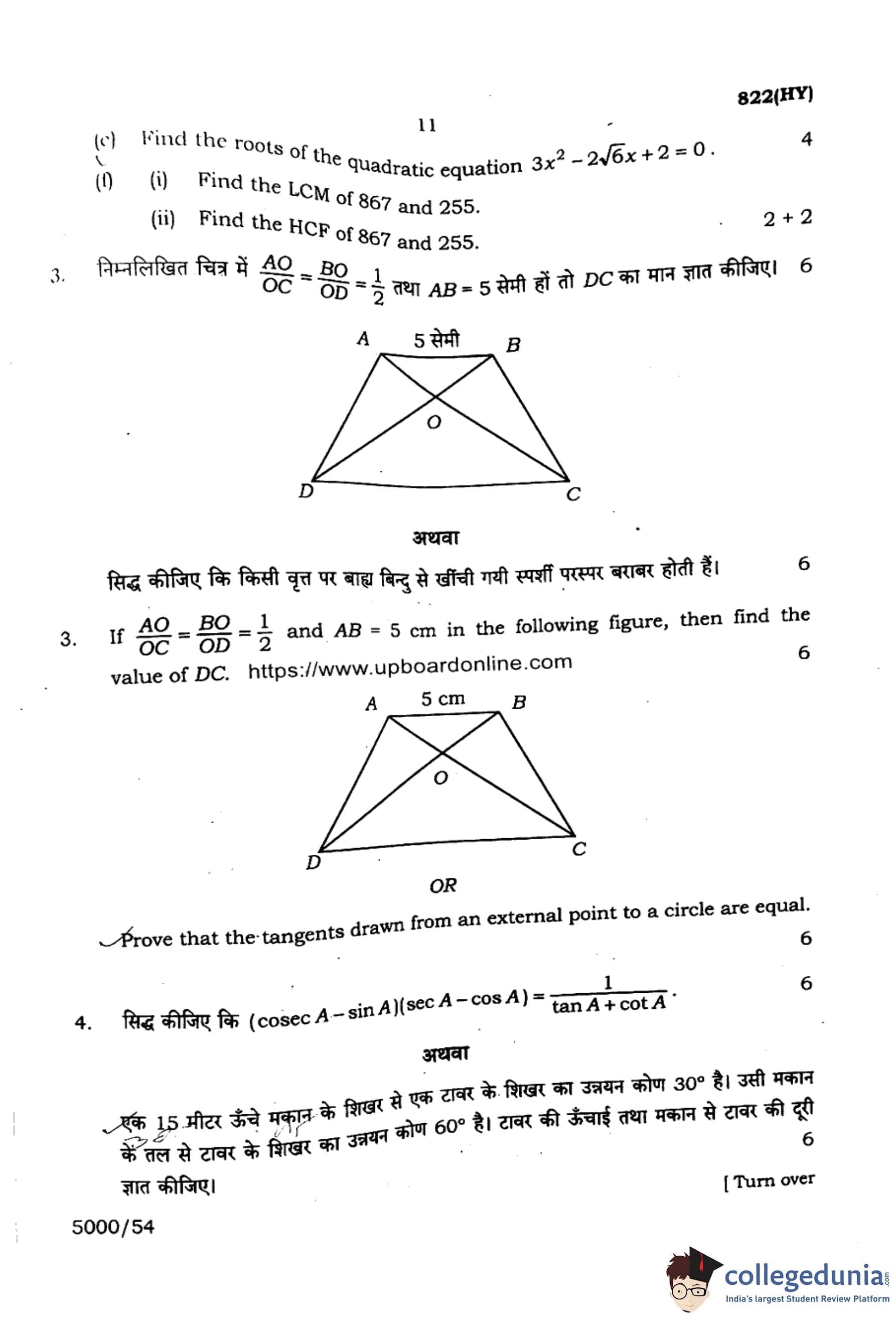 | UP Board Class 10 Mathematics (822 HY) 2024 Question Paper with Answer Key | Check Solutions |