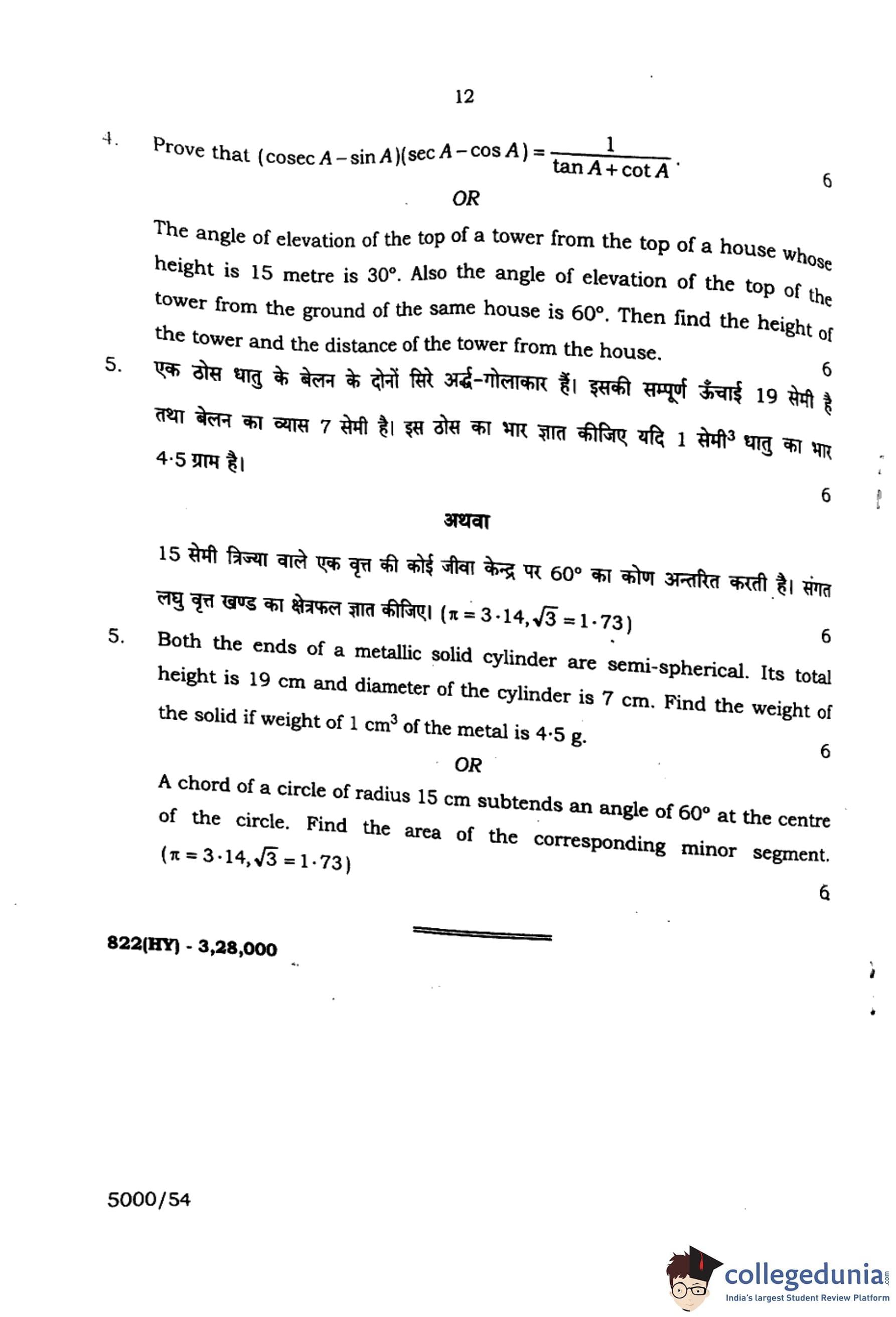UP Board Class 10 Mathematics Question Paper 2024 (Code 822 HY) with Solutions