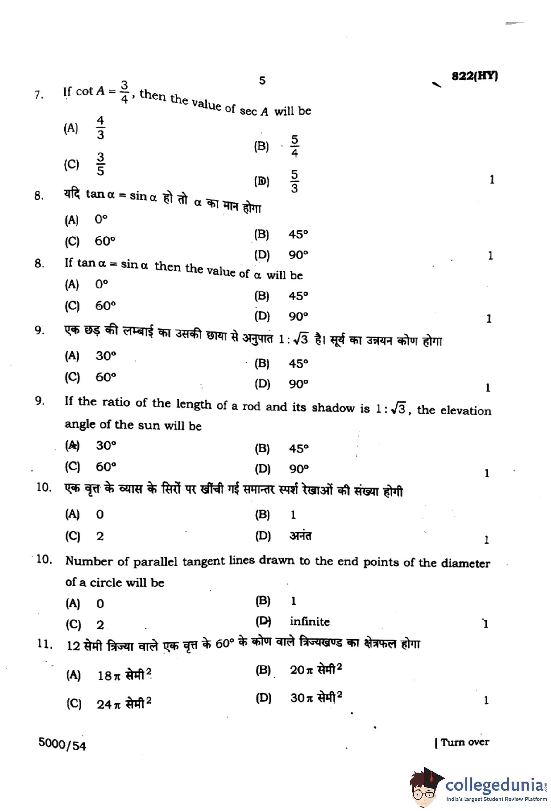 Hence, the value of \(\sec A\) is \(\dfrac{5}{4}\). Quick Tip: Remember: \(\cot A = \frac{Base}{Perpendicular}\) and \(\sec A = \frac{Hypotenuse}{Base}\).