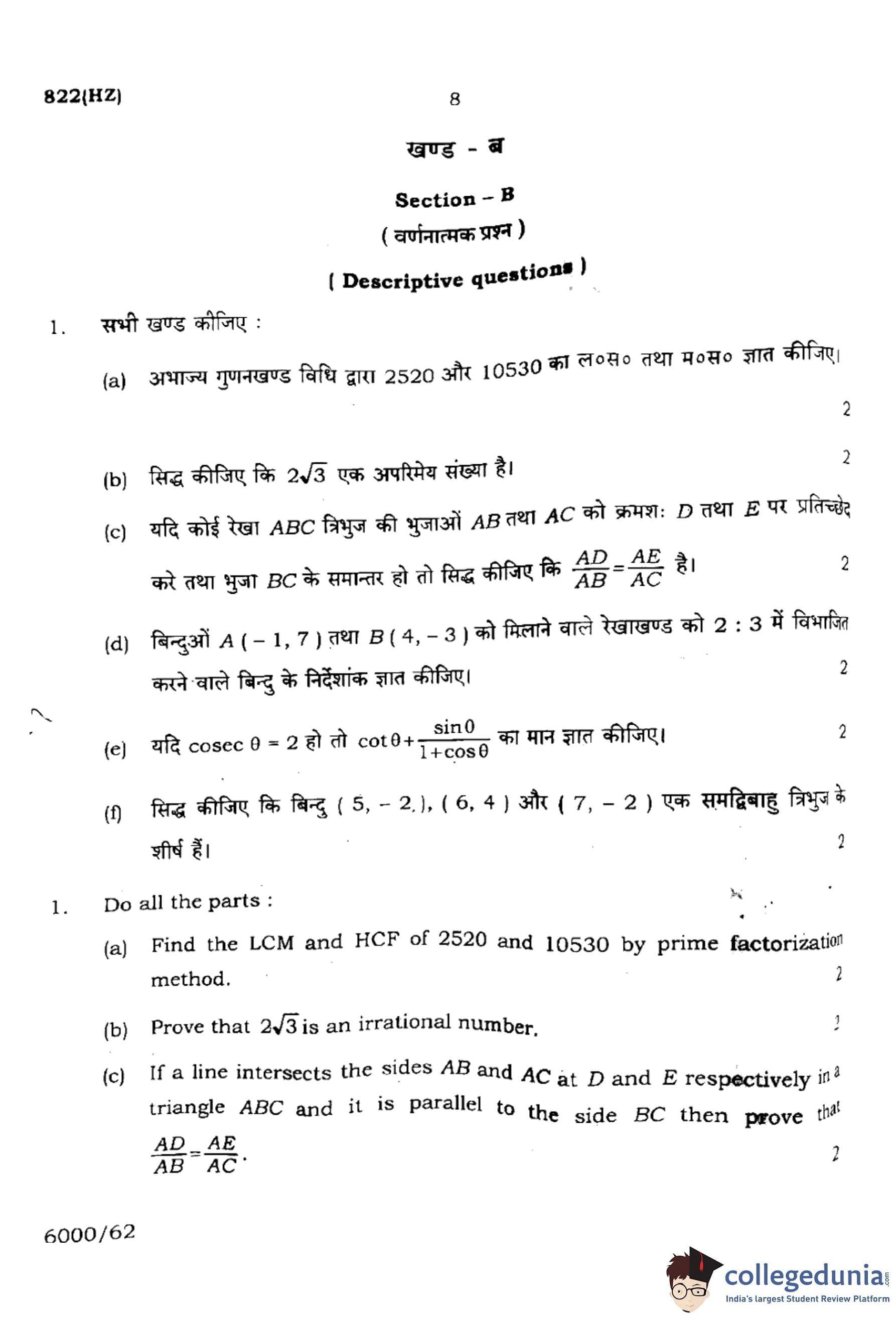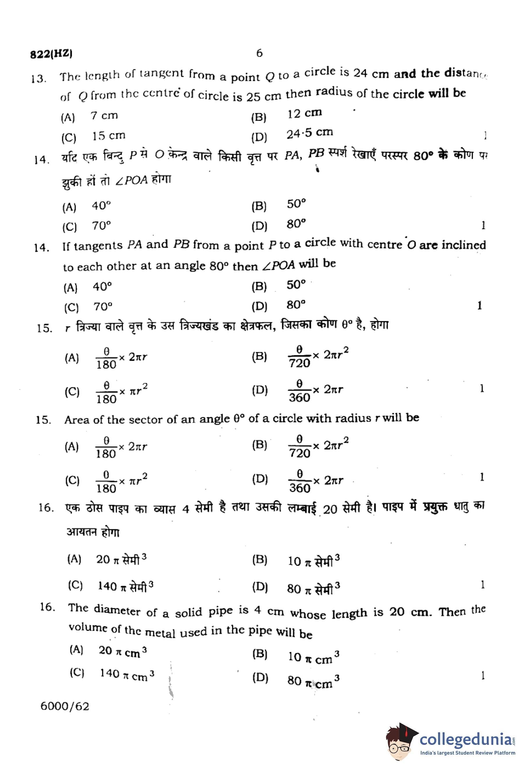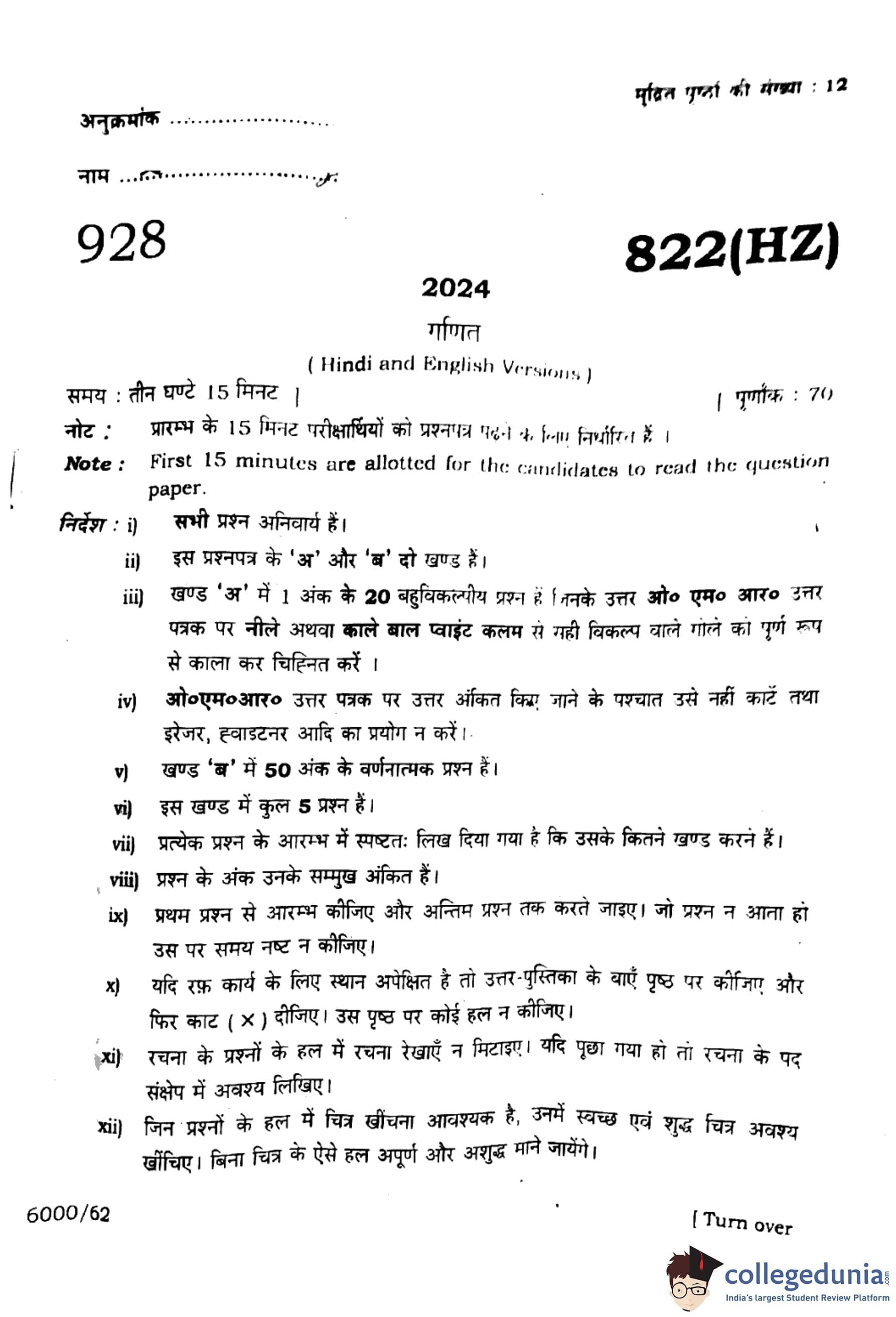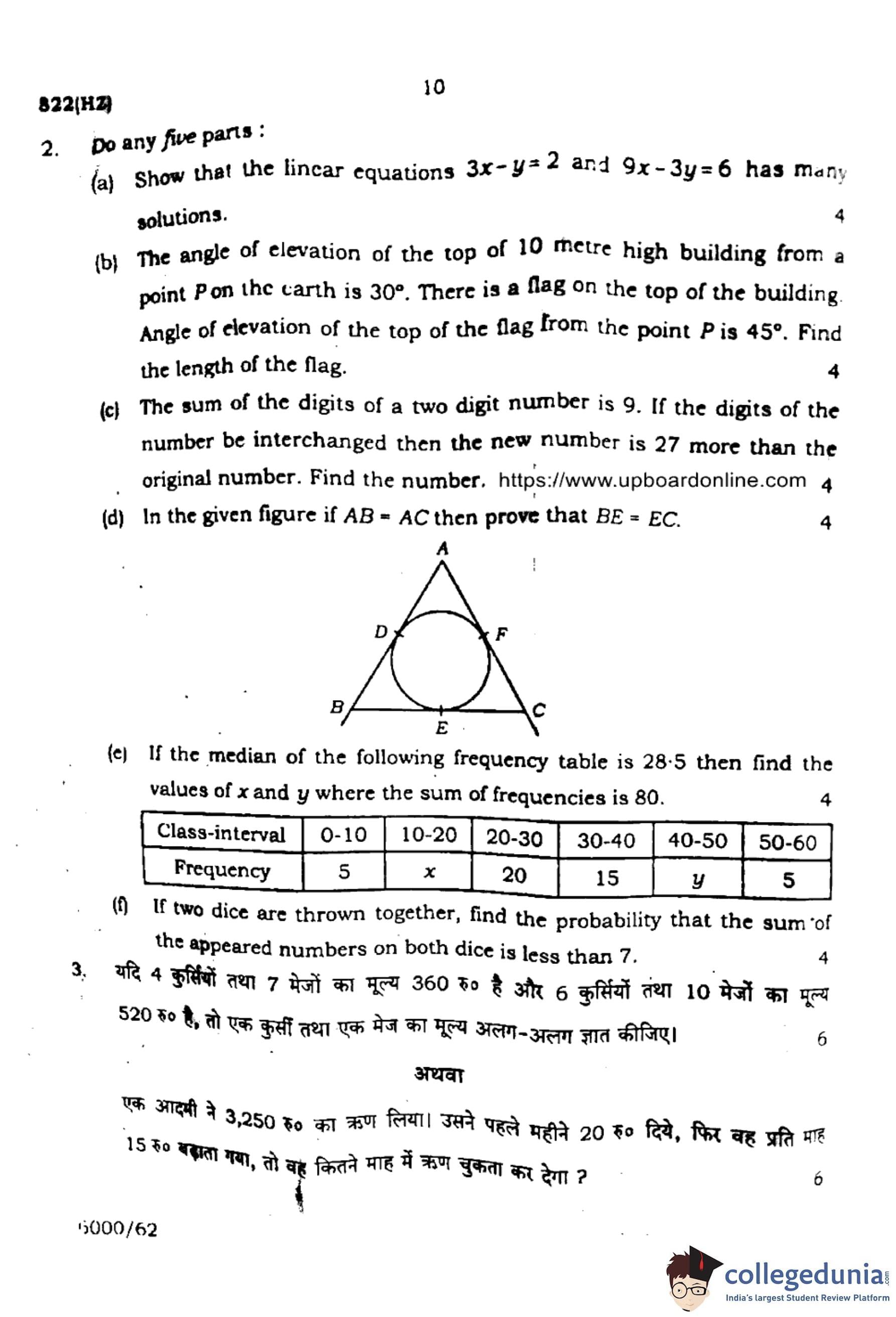 | UP Board Class 10 Mathematics (822 HZ) 2024 Question Paper with Answer Key | Check Solutions |