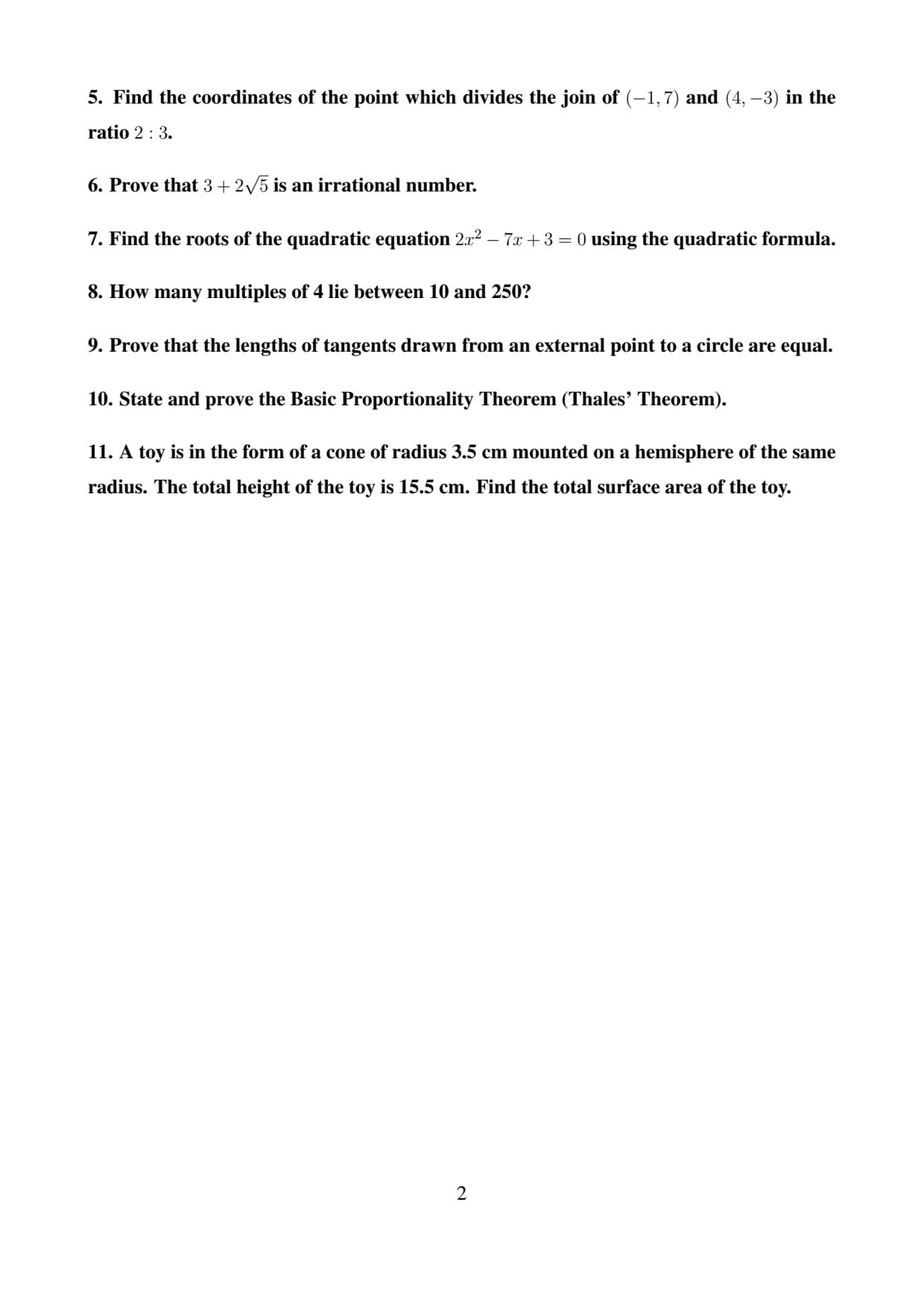 Hence, the assumption is false, and \[ \boxed{3 + 2\sqrt{5} is irrational.} \] Quick Tip: To prove irrationality: Assume the expression is rational. Isolate the root term. If it implies a known irrational number is rational, contradiction is obtained. Sum of rational + irrational is always irrational.