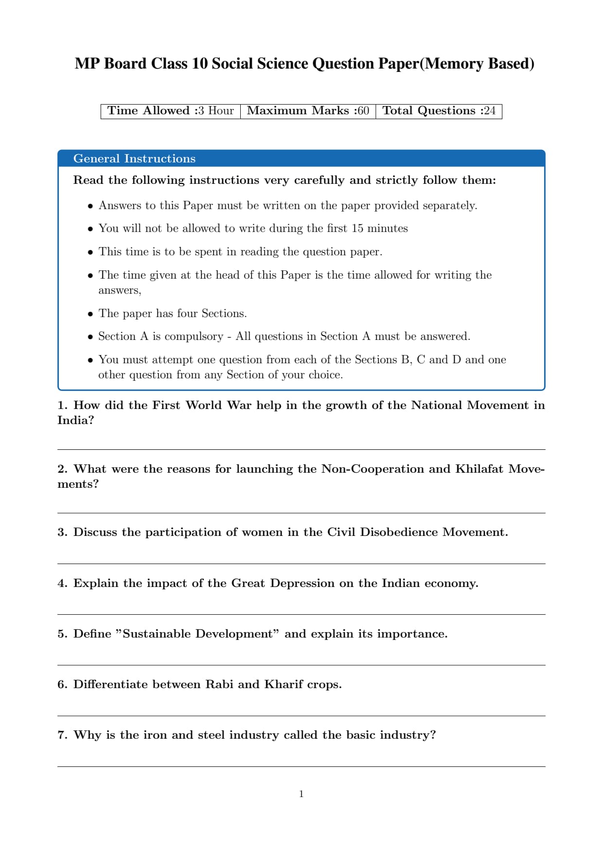 The official question paper of MP Board Class 10 Social Science Board Exam 2026 is provided below. Students can download the official paper in PDF format for reference.
