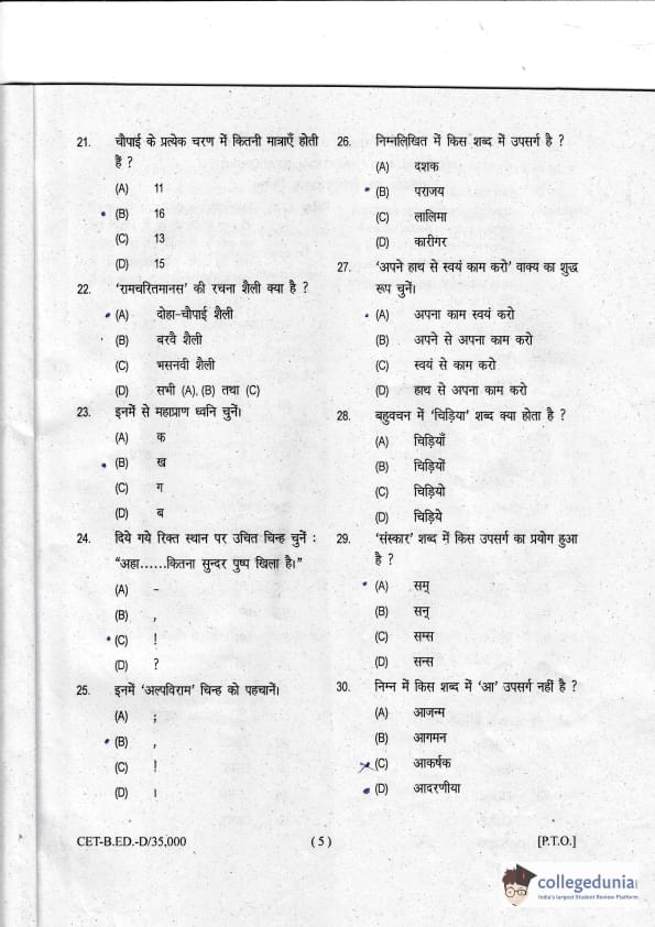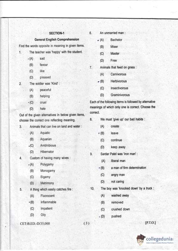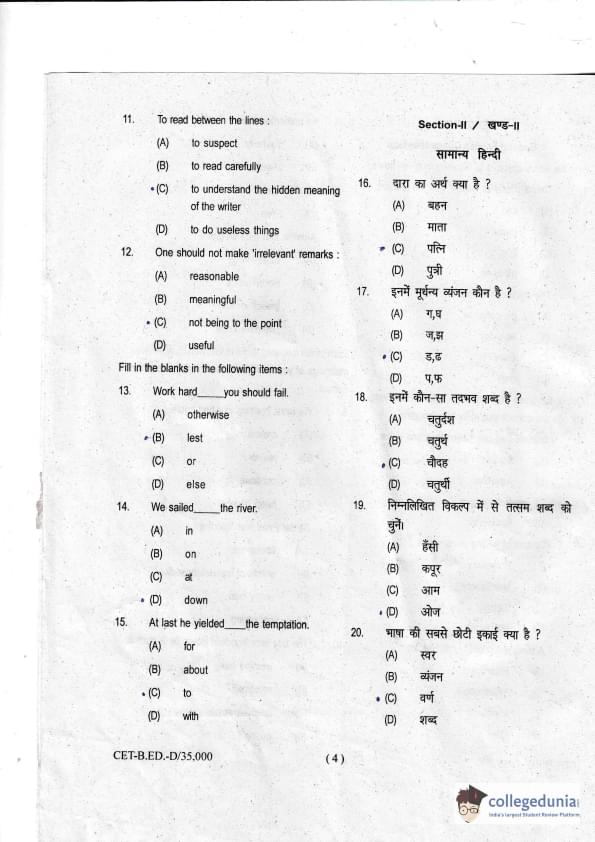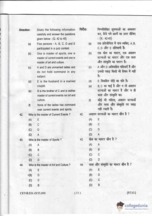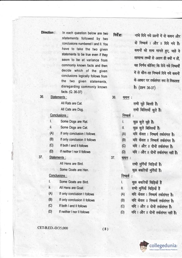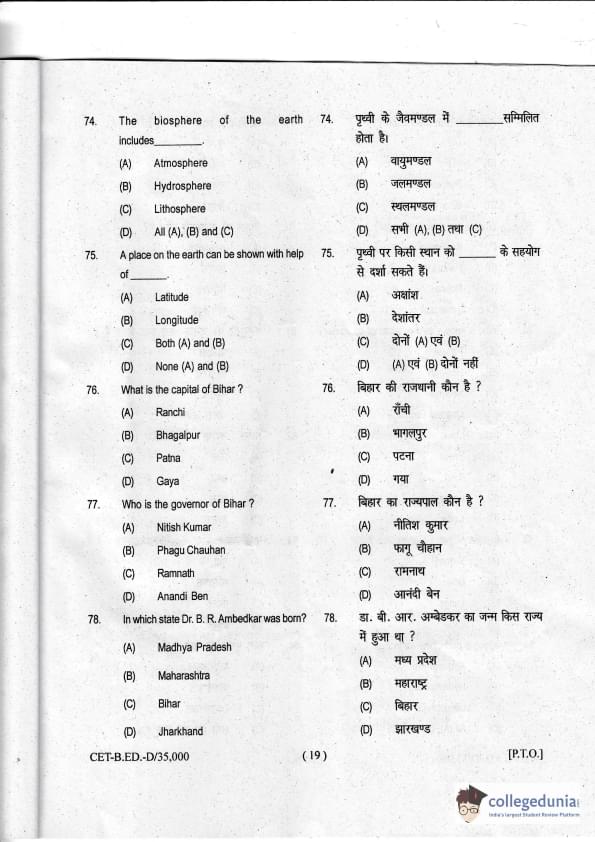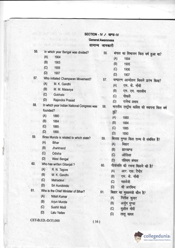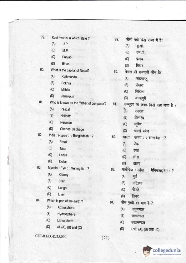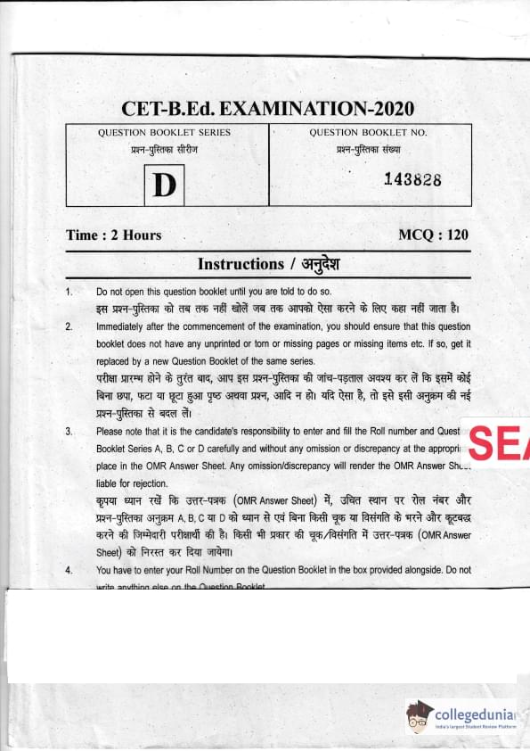 | Bihar BEd CET 2020 Set D Question Paper With Answer Key | Download PDF | Check Solutions |