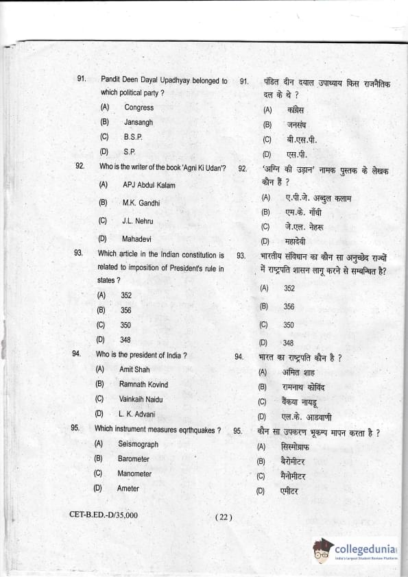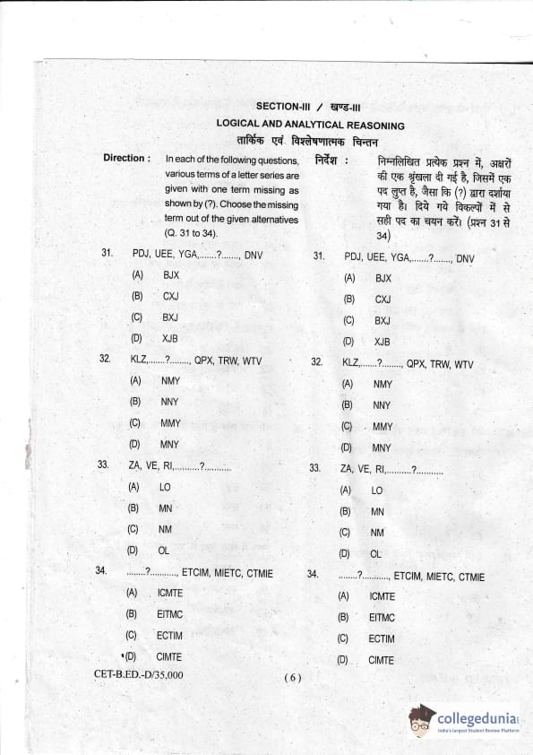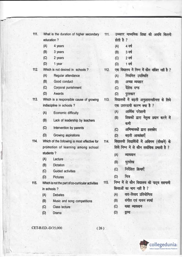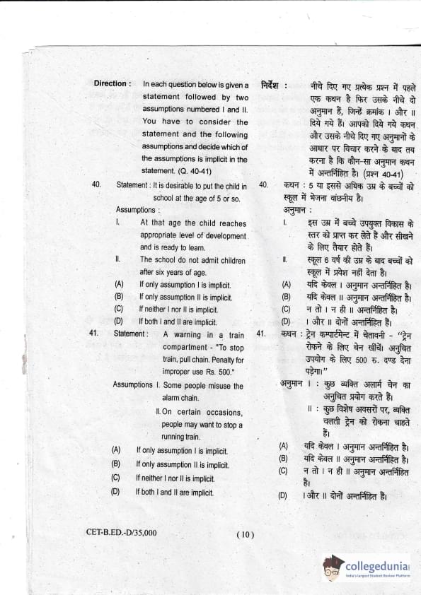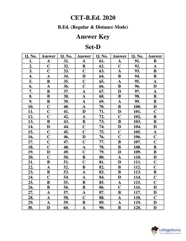 Bihar BEd CET 2020 Set D Question Paper with Answer Key PDFs
