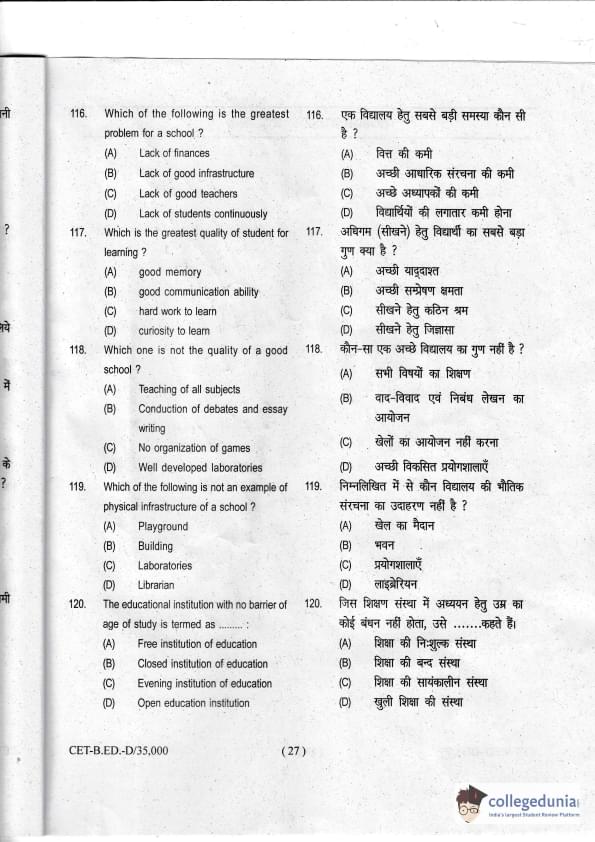 Bihar BEd CET 2020 Set D Question paper with answer key pdf is available here for download.Bihar BEd CET 2020 exam was conducted on September 22, 2020 . The exam was successfully organized by Lalit Narayan Mithila University. The question paper comprised a total of 120 questions.