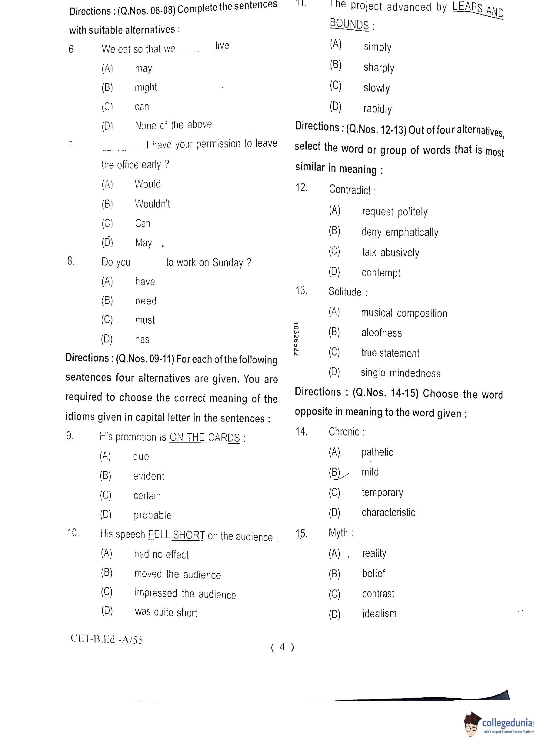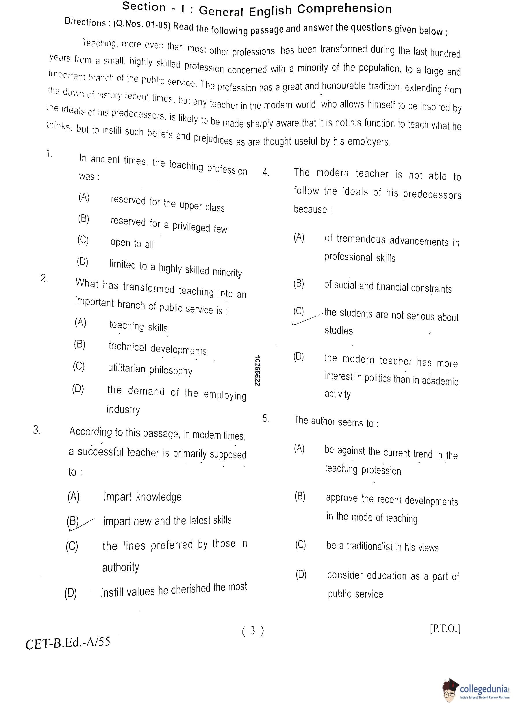 Bihar BEd CET 2022 Question Paper with Answer Key pdf is available for download. The exam was conducted by Lalit Narayan Mithila University (LNMU) on July 6, 2022. The question paper comprised a total of 120 questions.
