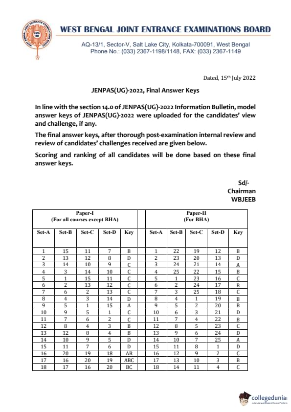 | WBJEE JENPAS 2022 Question Paper PDF | WBJEE JENPAS 2022 Answer Key PDF |