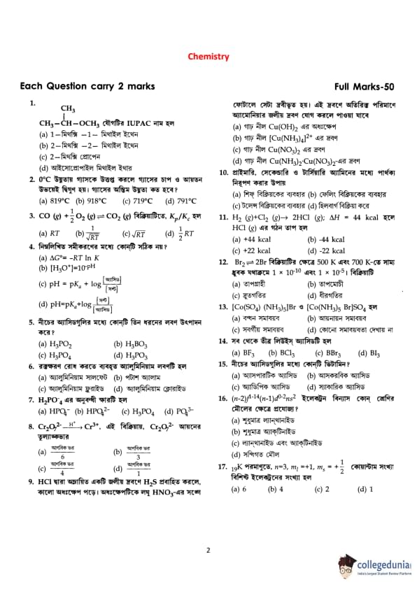 WBJEE JENPAS UG 2016 Chemistry Question paper with answer key pdf conducted on July 16, 2016 in Afternoon Session (2 PM to 4 PM) is available for download. The exam was successfully organized by West Bengal Joint Entrance Examination Board (WBJEEB).