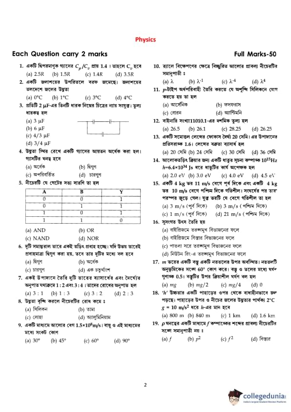 WBJEE JENPAS UG 2016 PHYSICS Question paper with answer key pdf conducted on July 16, 2016 in Afternoon Session 2 PM to 4 PM is available for download. The exam was successfully organized by West Bengal Joint Entrance Examination Board (WBJEEB).