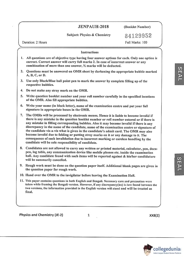 WBJEE JENPAS UG 2018 PHYSICS & CHEMISTRY Question paper with answer key pdf conducted on May 27, 2018 is available for download. The exam was successfully organized by West Bengal Joint Entrance Examination Board (WBJEEB). The question paper comprised a total of 50 questions.